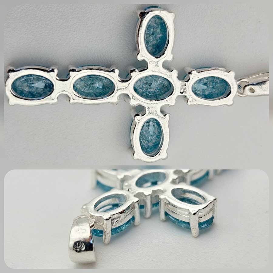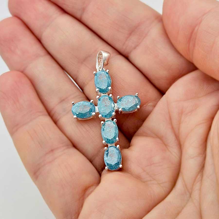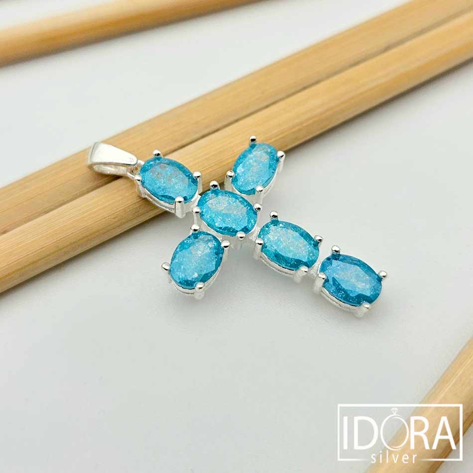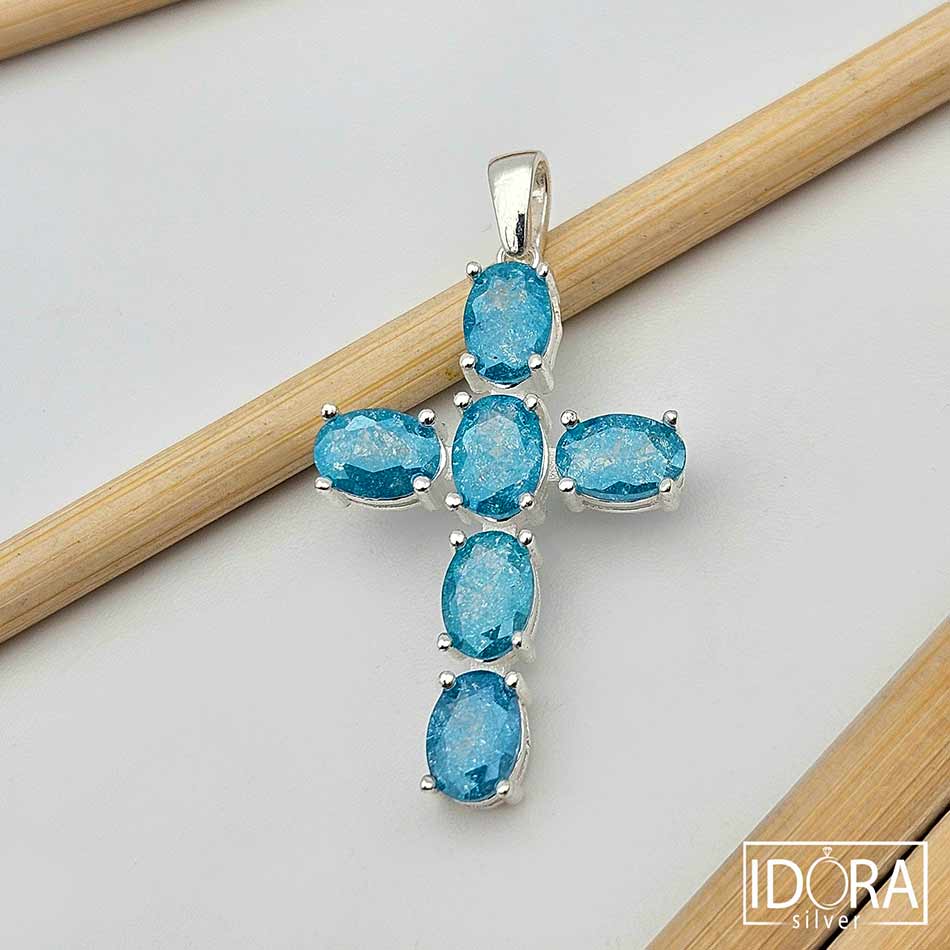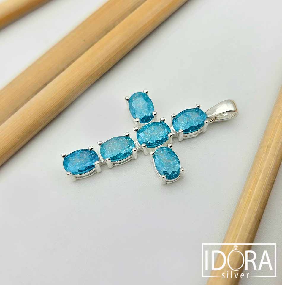 Нежен кръст от сребро, улавящ и отразяващ светлината като спомен за застинала вселена – овалните сини камъни сияят с хладна прозрачност, сякаш носят в себе си дъха на дълбоки води или утринно небе в ефирна красота. Всеки фасет улавя блясък, който пулсира меко и живо в изчистената сребърна рамка, подчертаваща синевата на камъните.