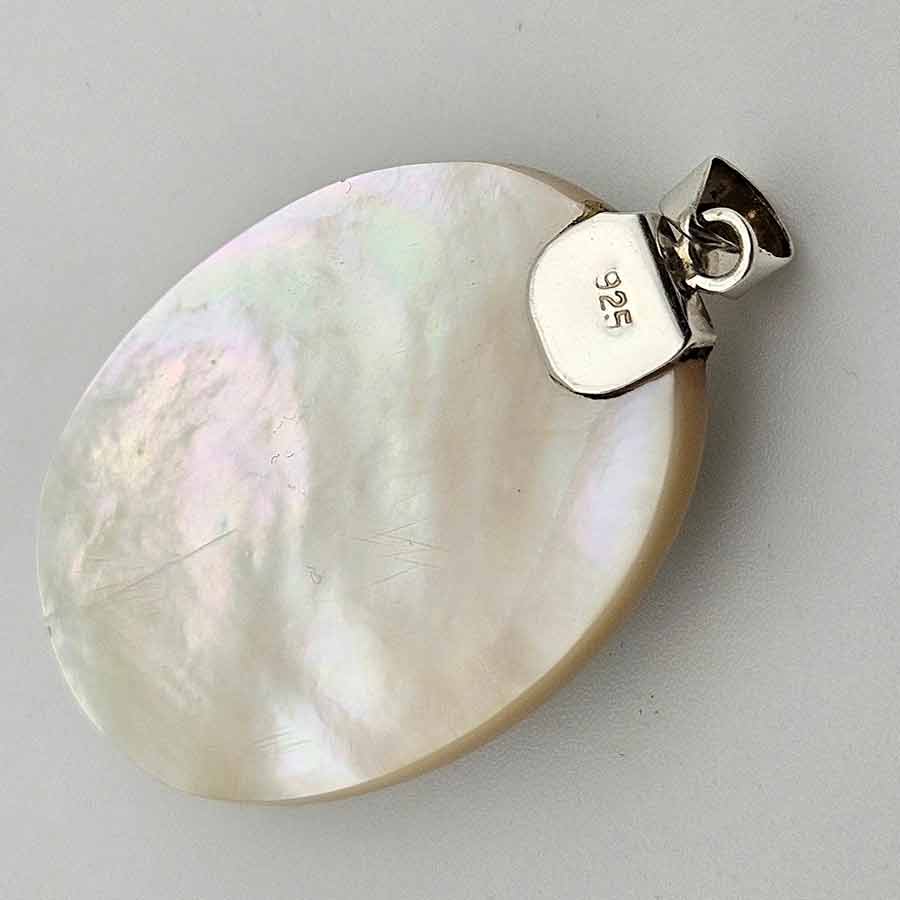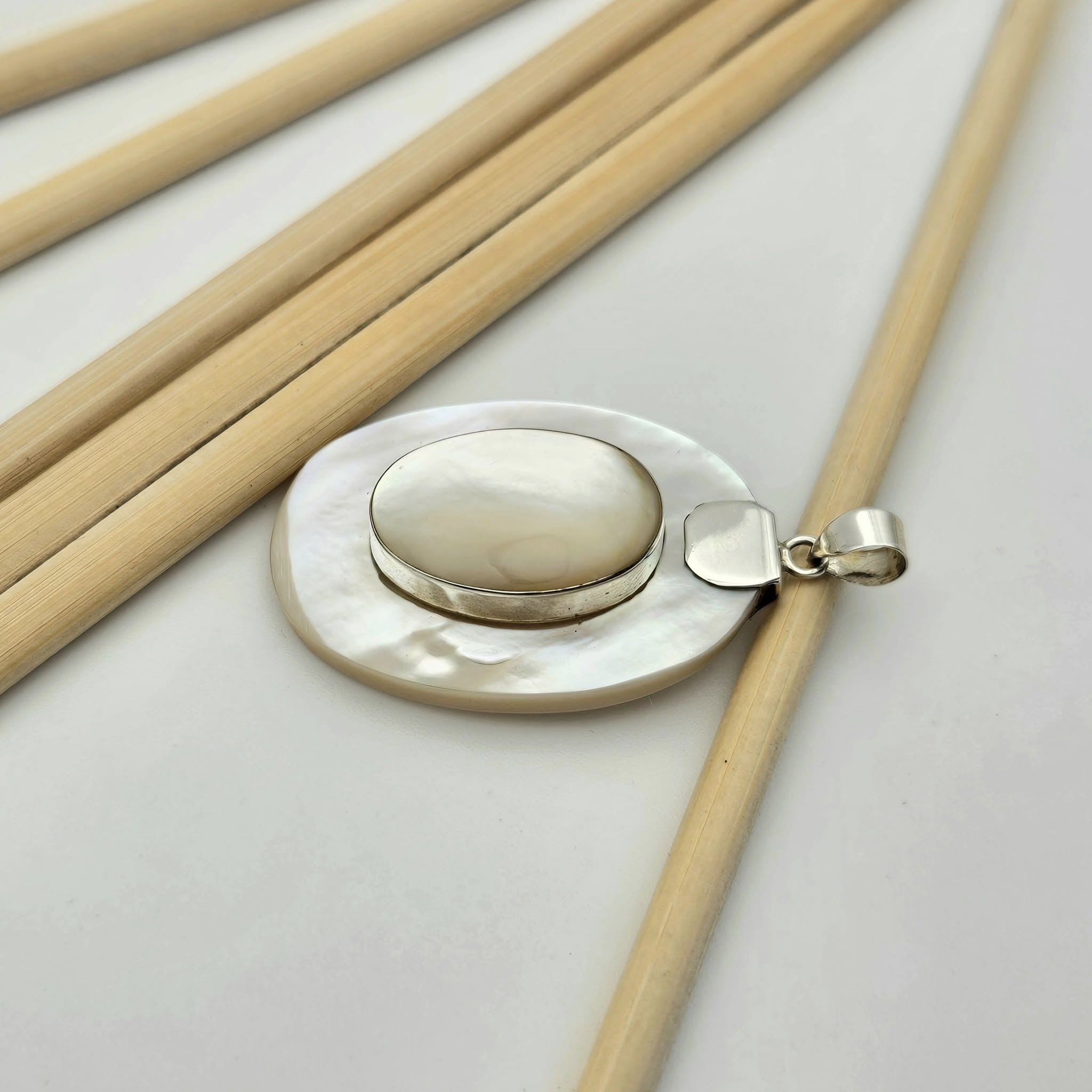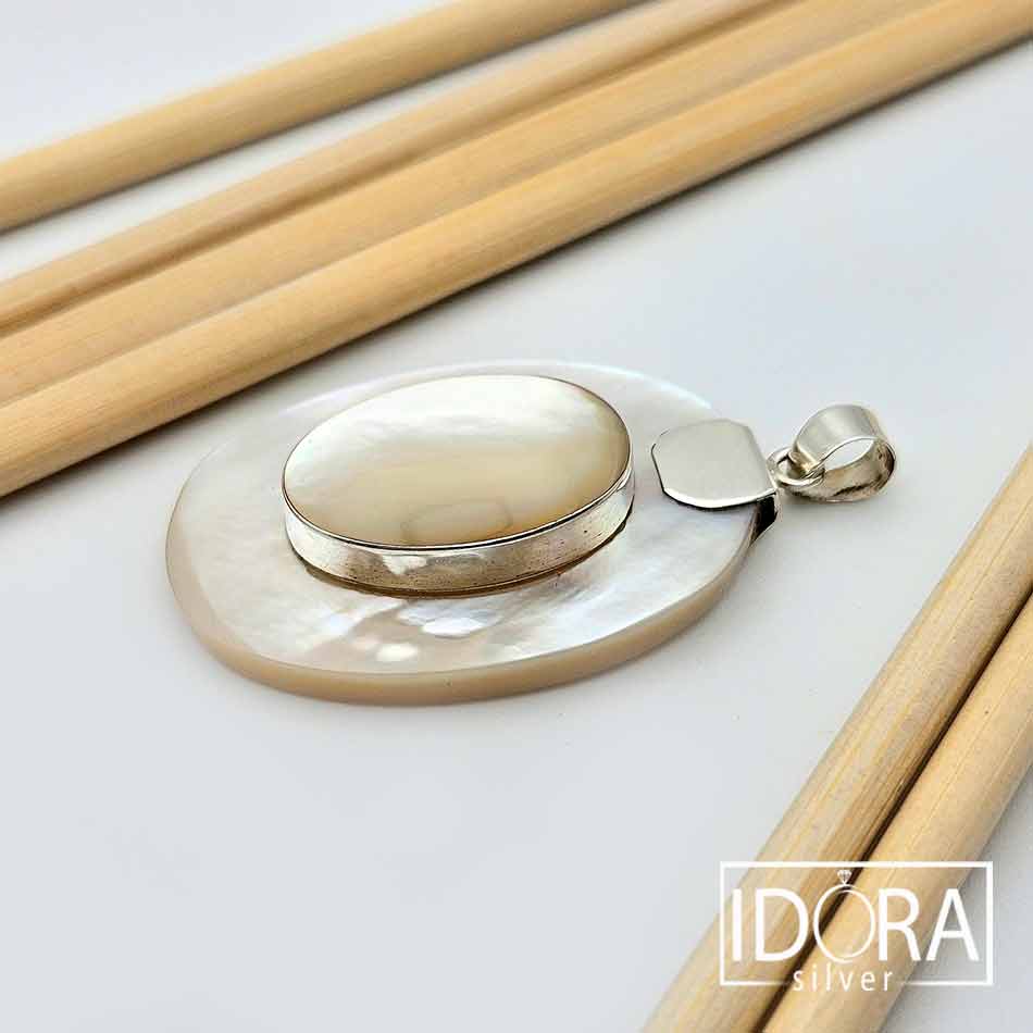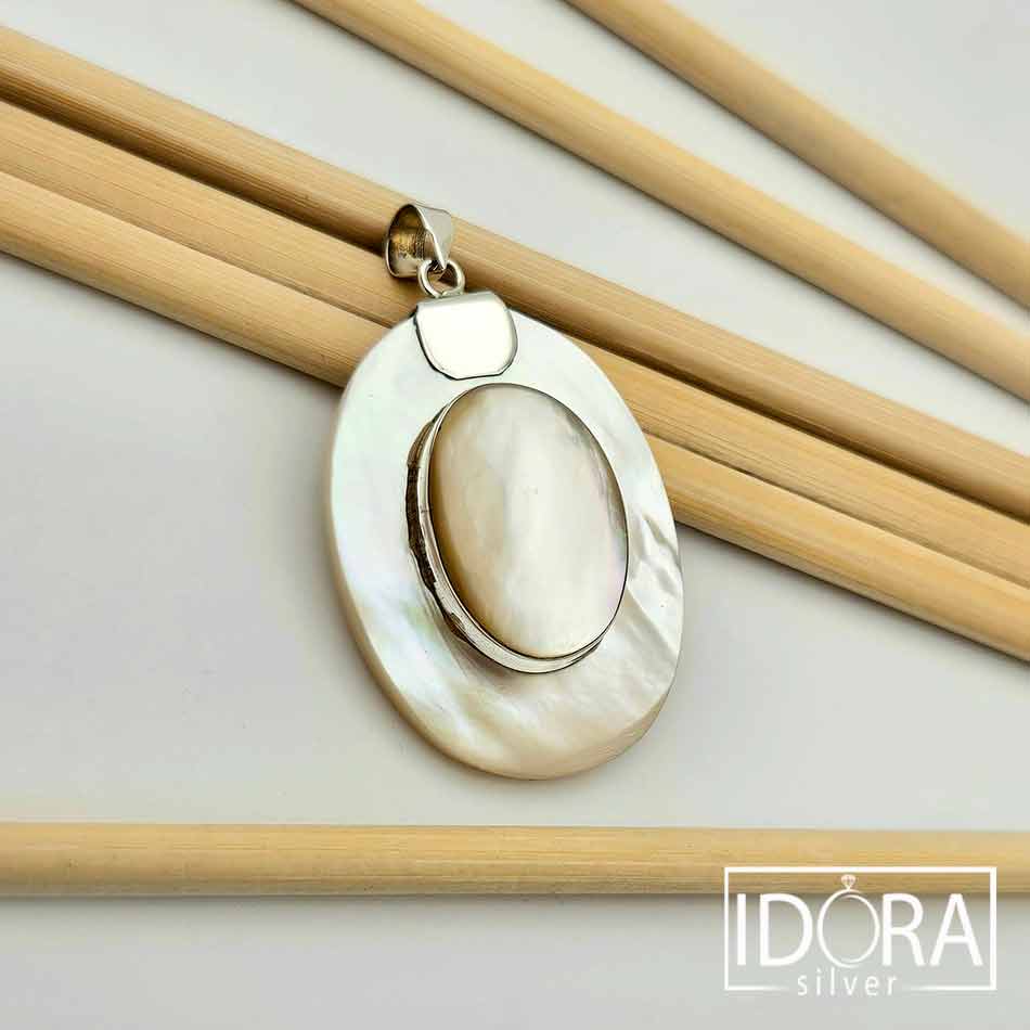 БЯЛ СЕДЕФ в еферия от магнетични отблясъци – централен овал, окован в сребърна рамка, позициониран върху едра плочка от седеф, носещ израз на чистота, изтънченост и тиха сила.