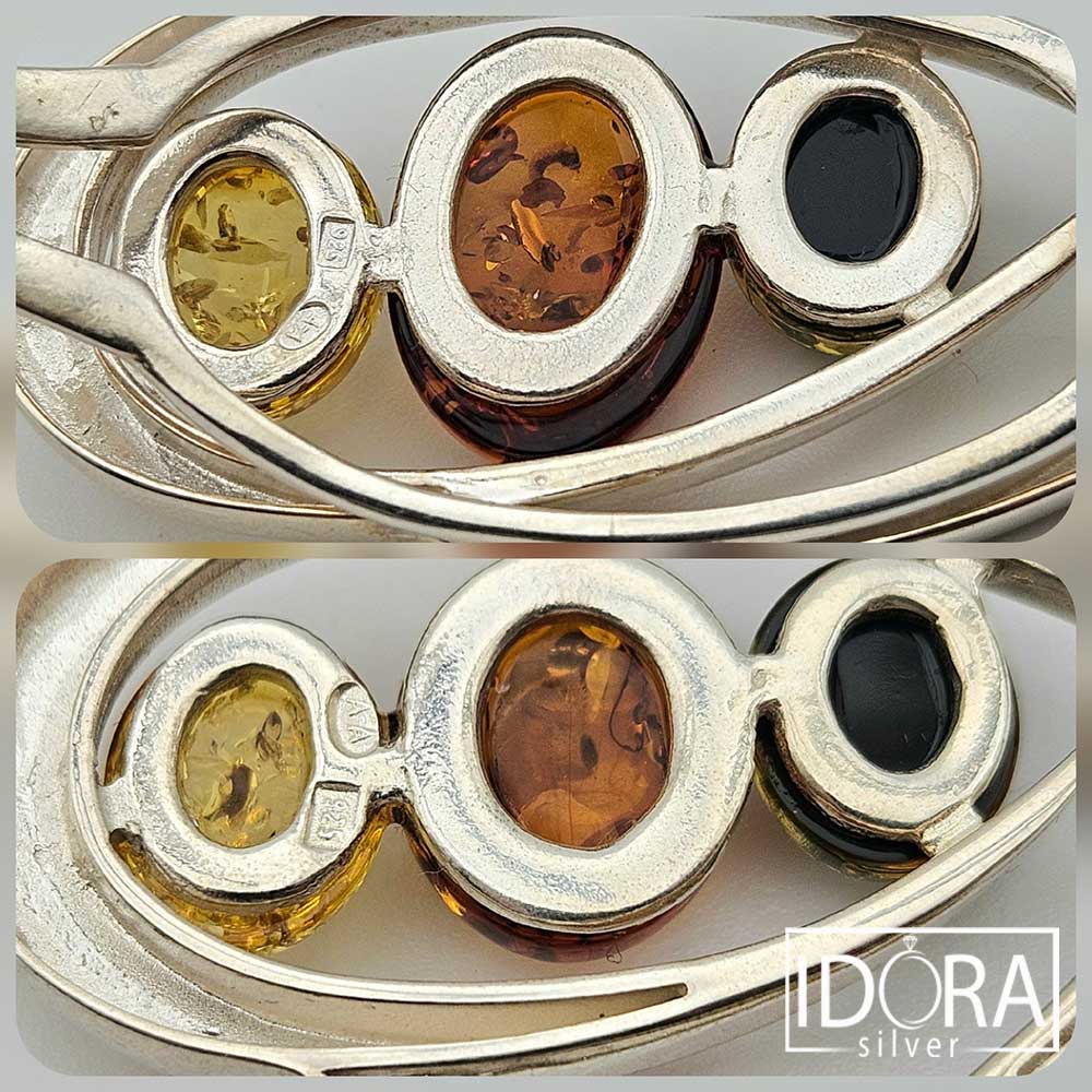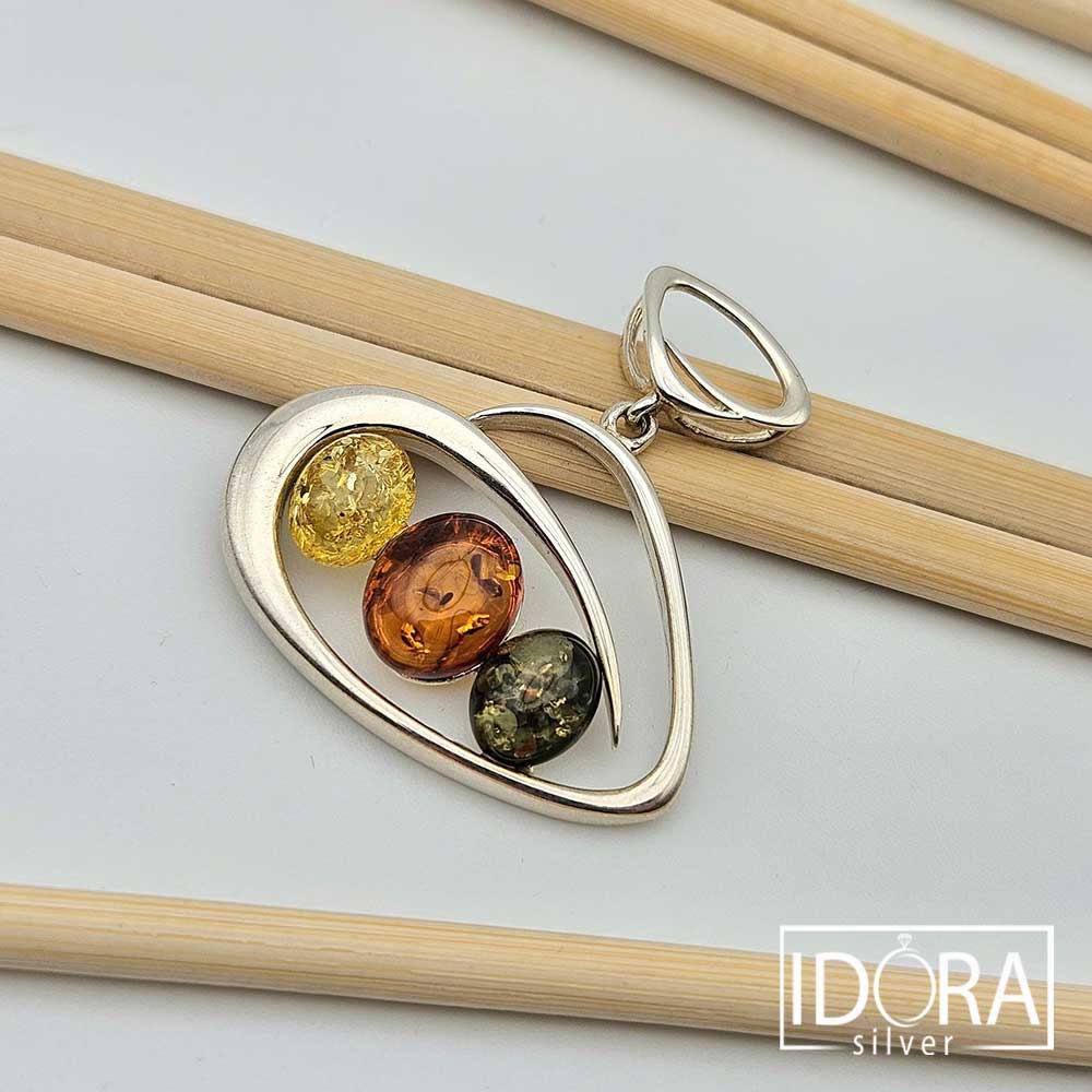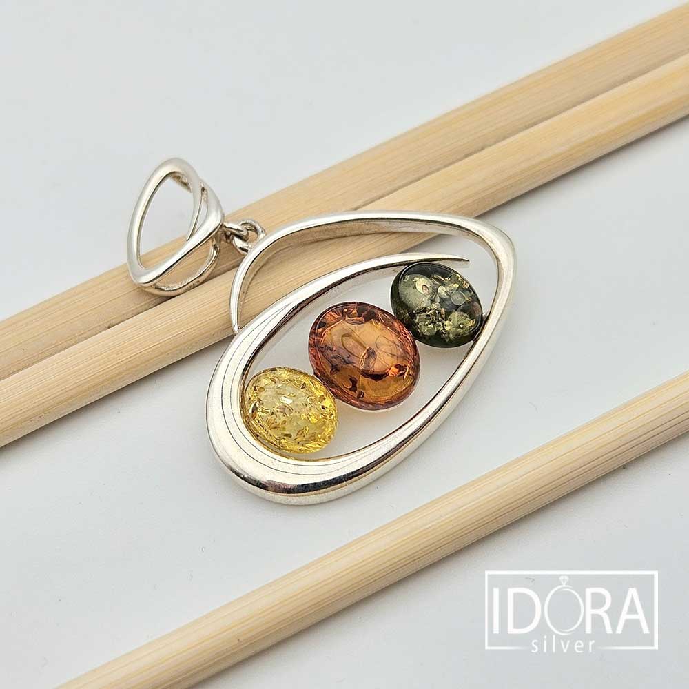Изящнен медальон от сребро и КЕХЛИБАР с усещане за хармония между природа и изкуство. Меките линии на среброто обгръщат три сияйни камъка – слънчево жълто, топло медено и дълбоко зелено, уловили лъчите на изгрева, жарта на пладнето и мистиката на здрача. Три цвята, три момента от деня, три отражения на светлината, събрани в една символика – хармония между минало, настояще и бъдеще.