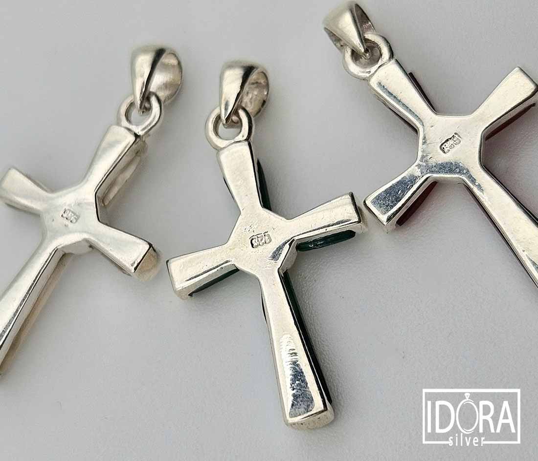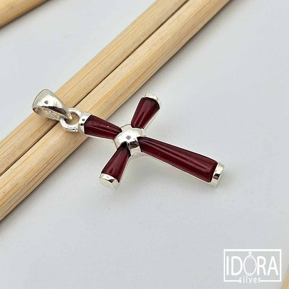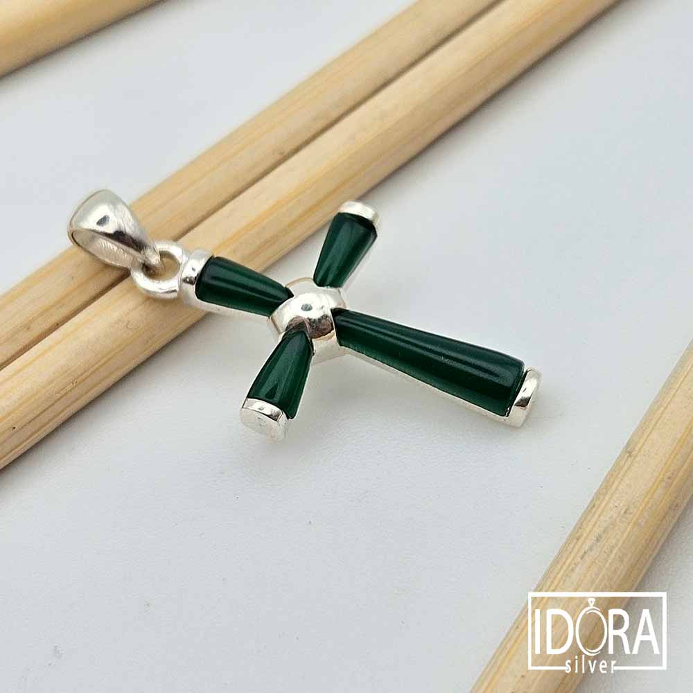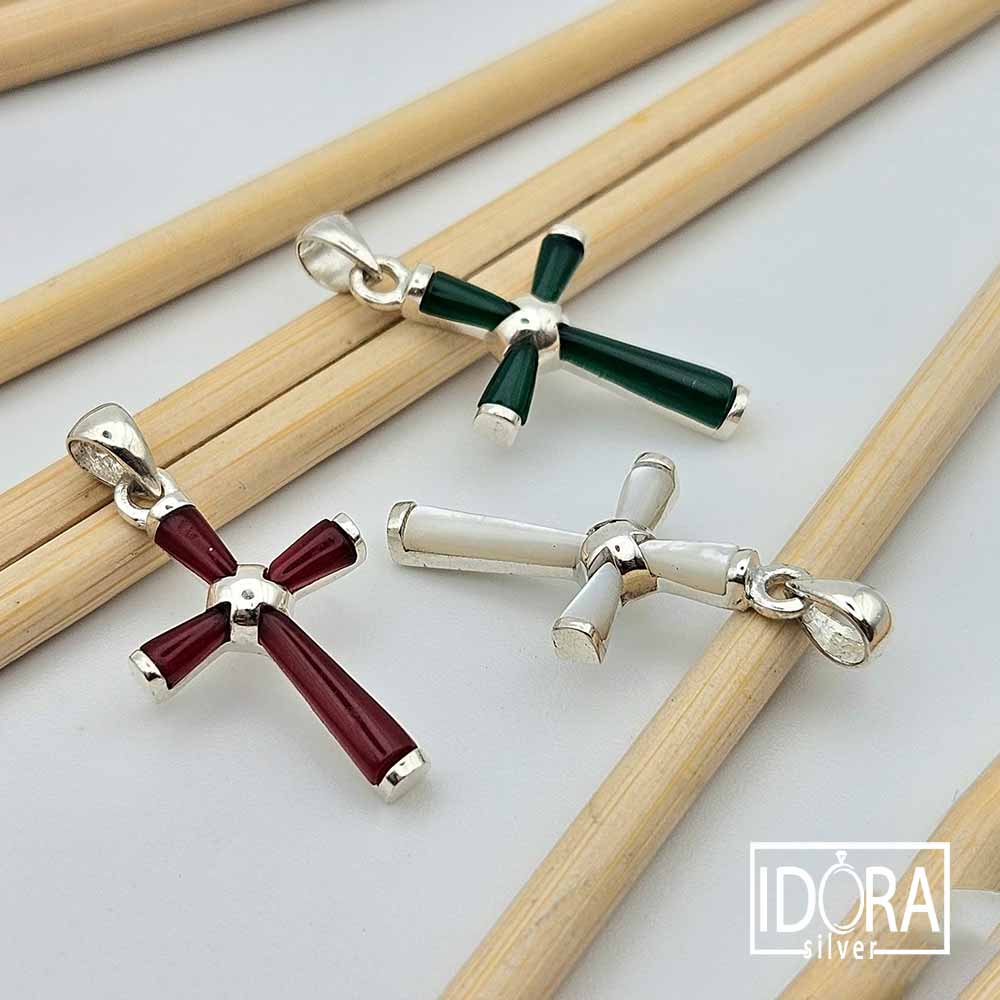 Изящен кръст с инкрустация в три цветови вариации – бял, зелен и червен. Всеки от четирите края на кръста е в конусовидна форма, придавайки му модерна и елегантна визия. Гладката повърхност на седефа създава усещане за чистота и духовност, елегантно допълнено от сребърния обков.