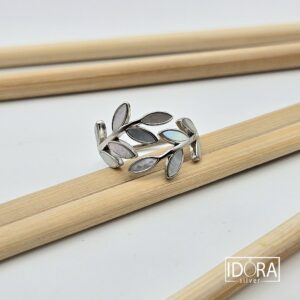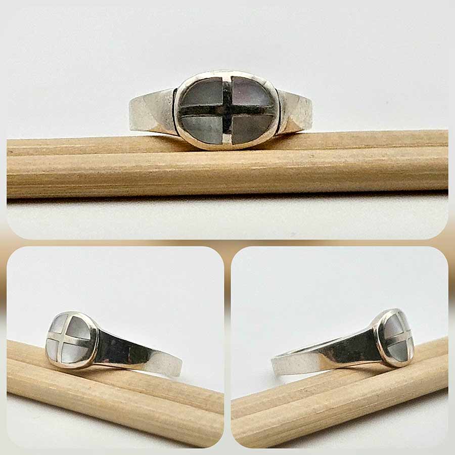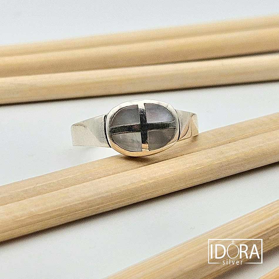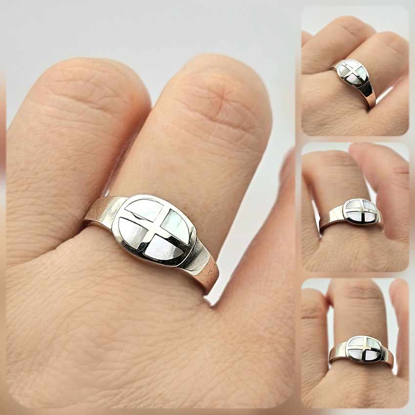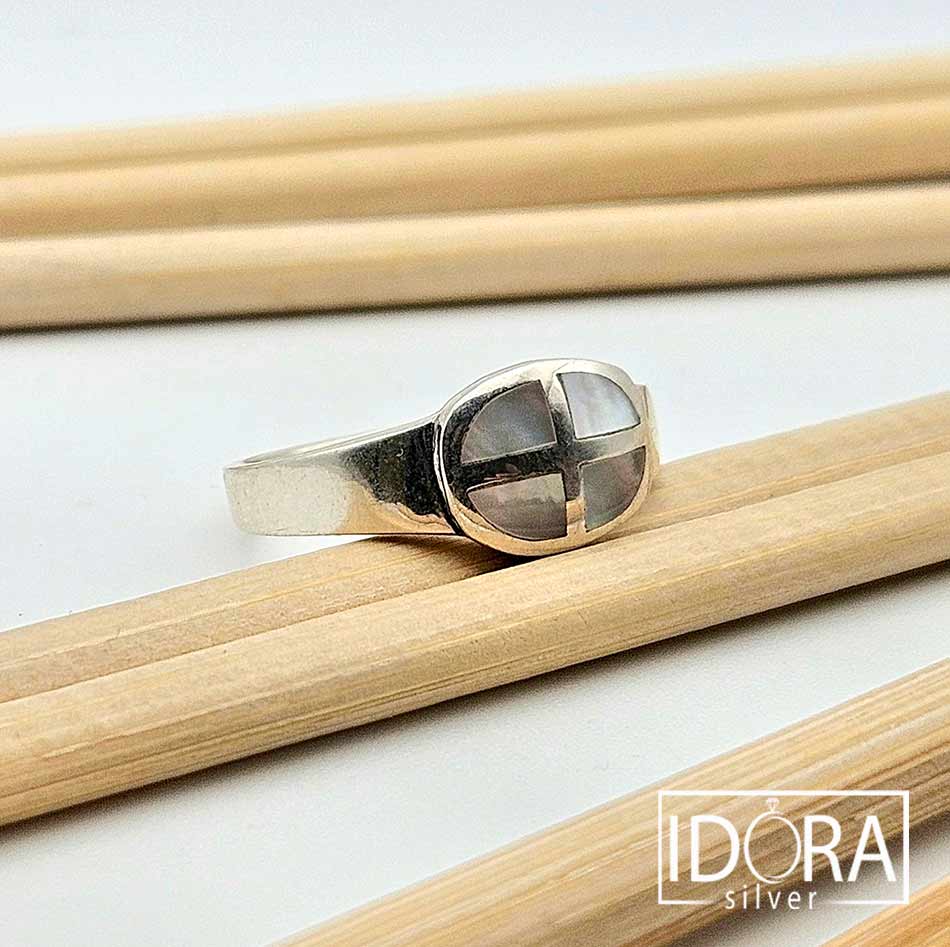 Инкрустиран БЯЛ СЕДЕФ, оформящ сребърен кръст, събран в семпла овална корона, носена от стабилна халка – сърцевина, събрала дълбок символизъм в модерна естетика.