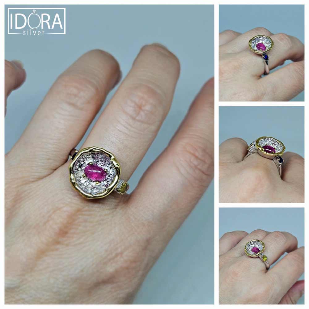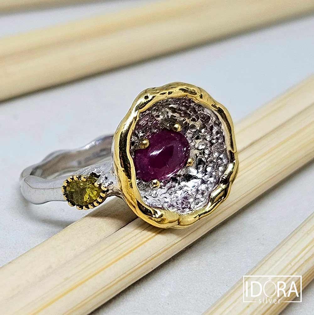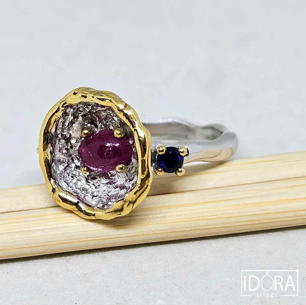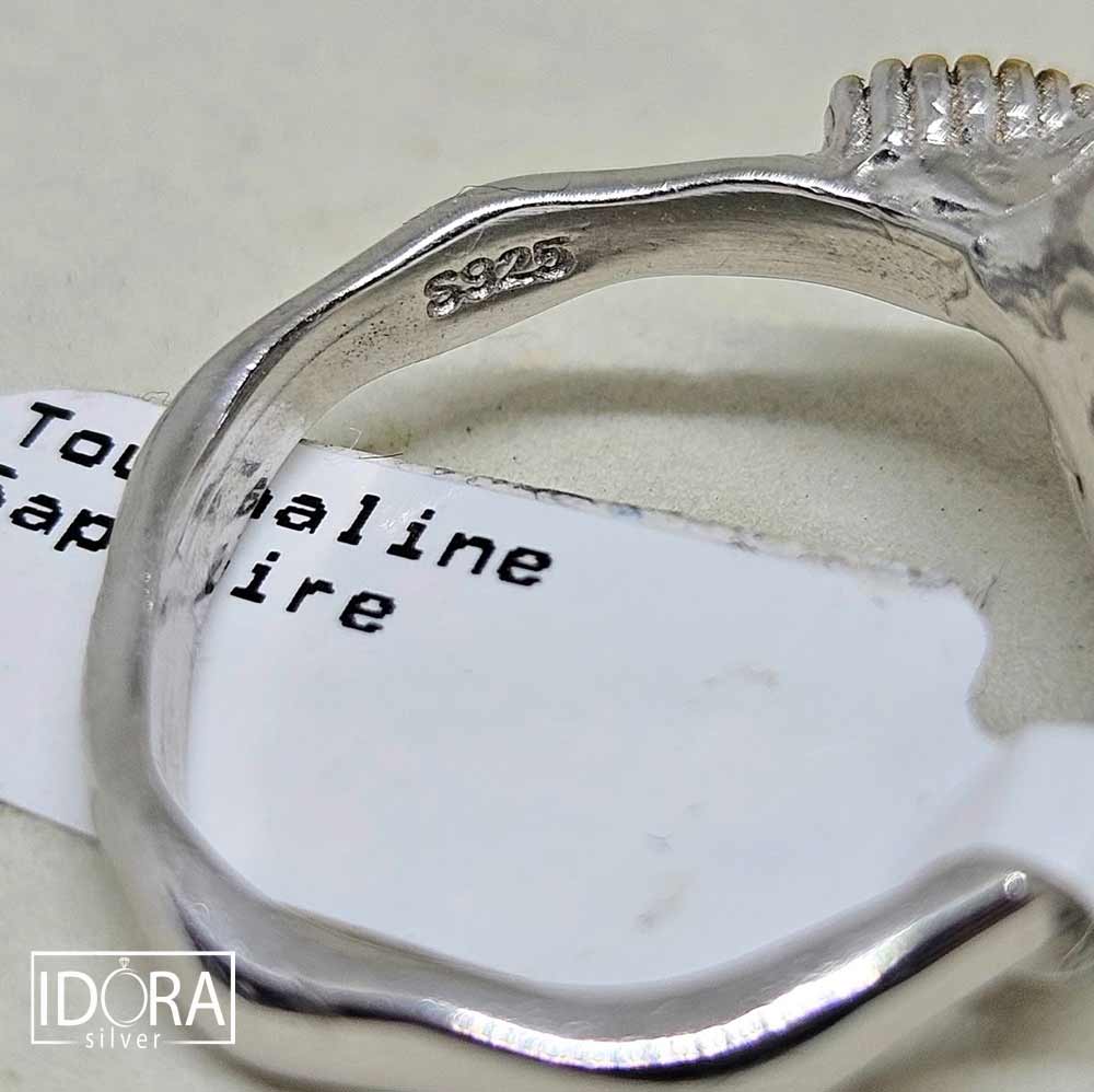 Два ТУРМАЛИНА с деликатно партньорство на САПФИР – истински каменни цветове, родиево покритие, позлата, релефна халка..комбинация, съчетала екстремно различен дизайн с модерен отенък и много специален стил.