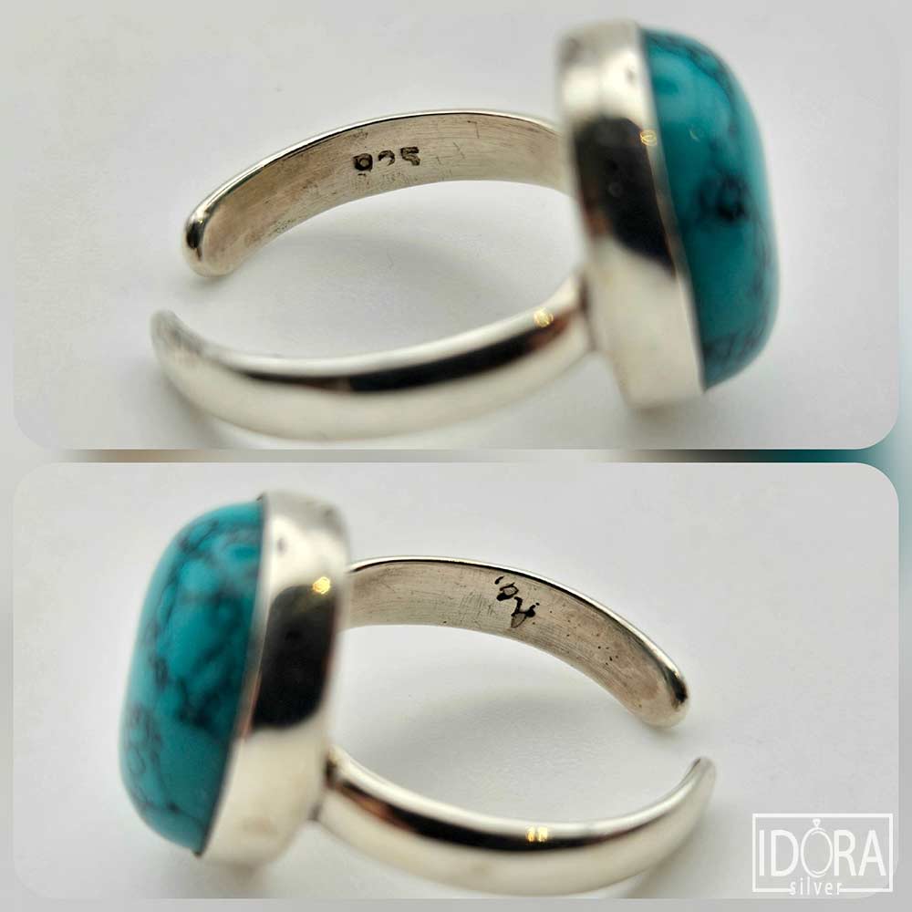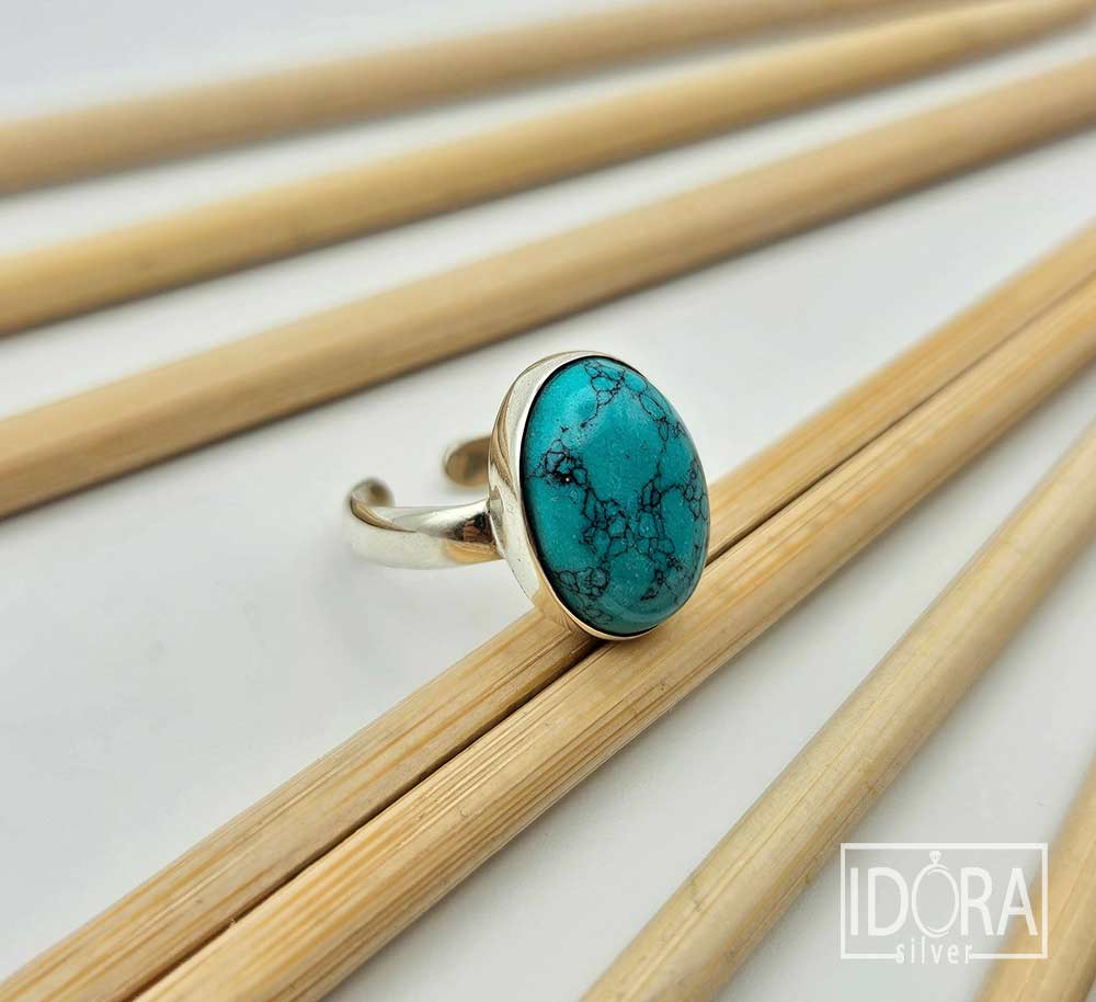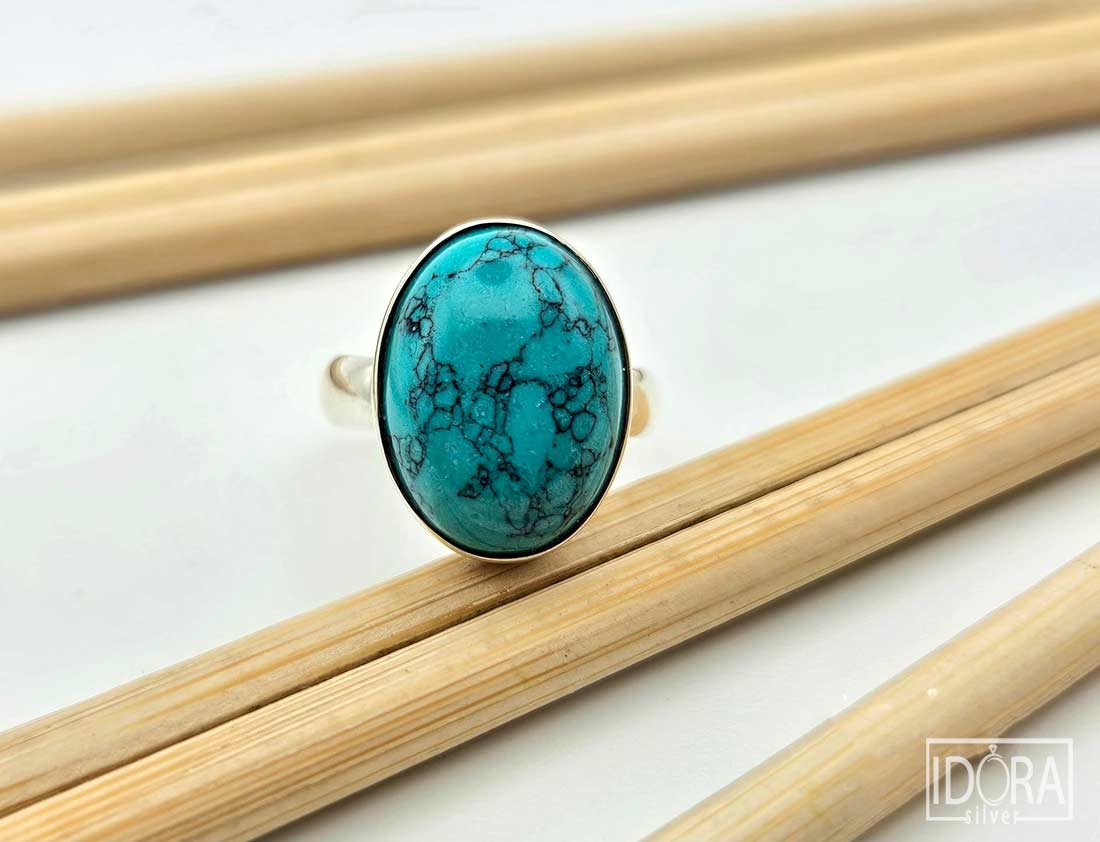 Тюркоаз в сияен синьо-зелен нюанс, прорязан от фини черни жилки – природни рисунки, които придават неповторим характер и индивидуалност, като древна карта, съхранила тайни от отминали времена. Смятан за камък на закрилата и хармонията, тюркоазът носи усещане за спокойствие, духовна сила и баланс, превръщайки се в не само красиво украшение, но и в символ на вътрешна стабилност и вдъхновение.