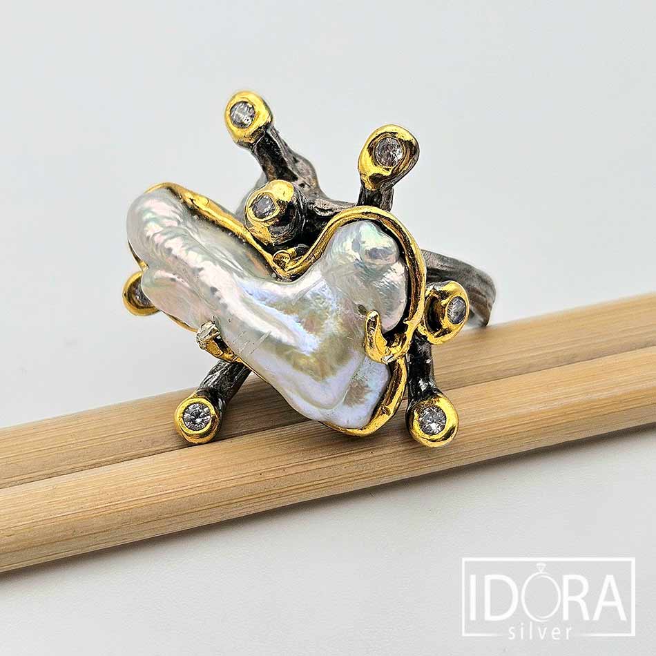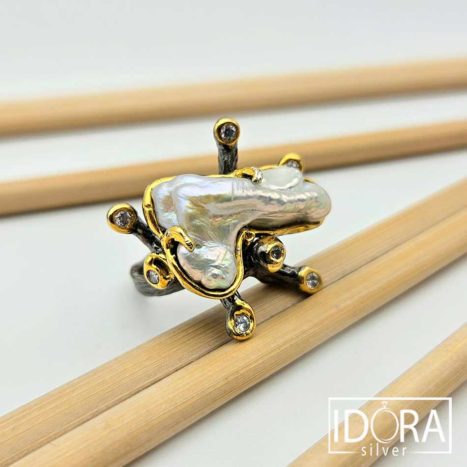 Притеснително докосваща и влияеща красота. БАРОКОВА ПЕРЛА прихваната в умопомрачителен дизайн. Черен родий, позлата, релеф, циркони – лукс улавящ погледа в повик на чувства, останалото е без думи.
