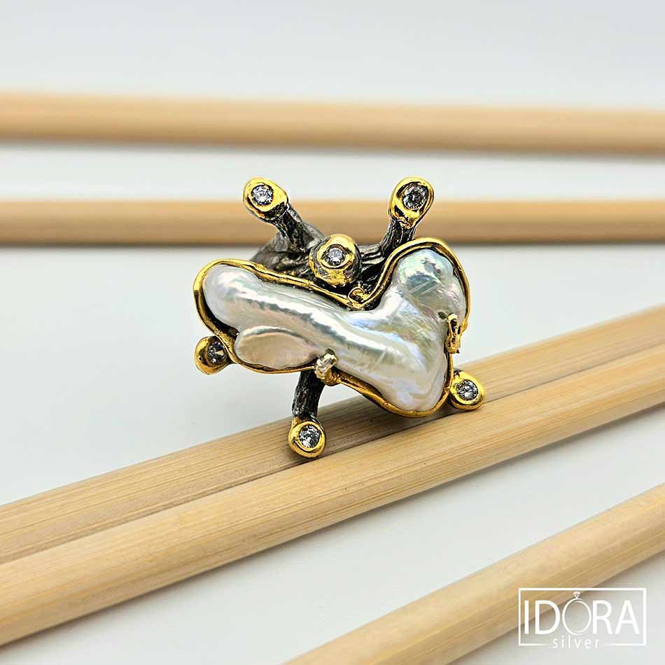 Притеснително докосваща и въздействаща красота. Барокова перла, елегантно прихваната в умопомрачителен дизайн, който не оставя безразличие. Черен родий, фина позлата, релефни детайли и искрящи циркони се преплитат в смело луксозно излъчване – повик на чувства и емоции, които не се нуждаят от думи.