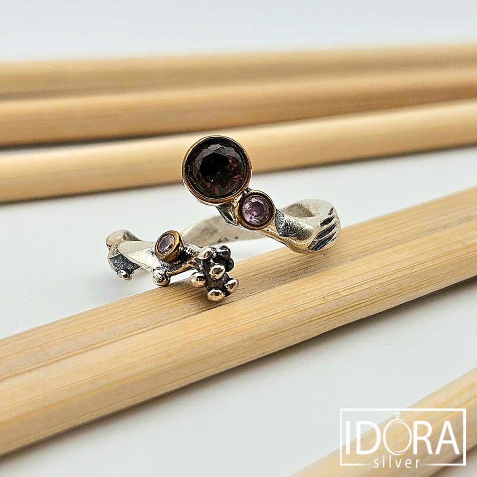 Пръстен с дизайн събрал дъх на земя и време – нестандартни флорални форми в релефна отворена халка, и ЦИРКОНИ обрамчени в позлата с лекота улавящи светлината с тъмните си дълбоки цветове.