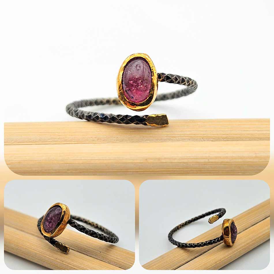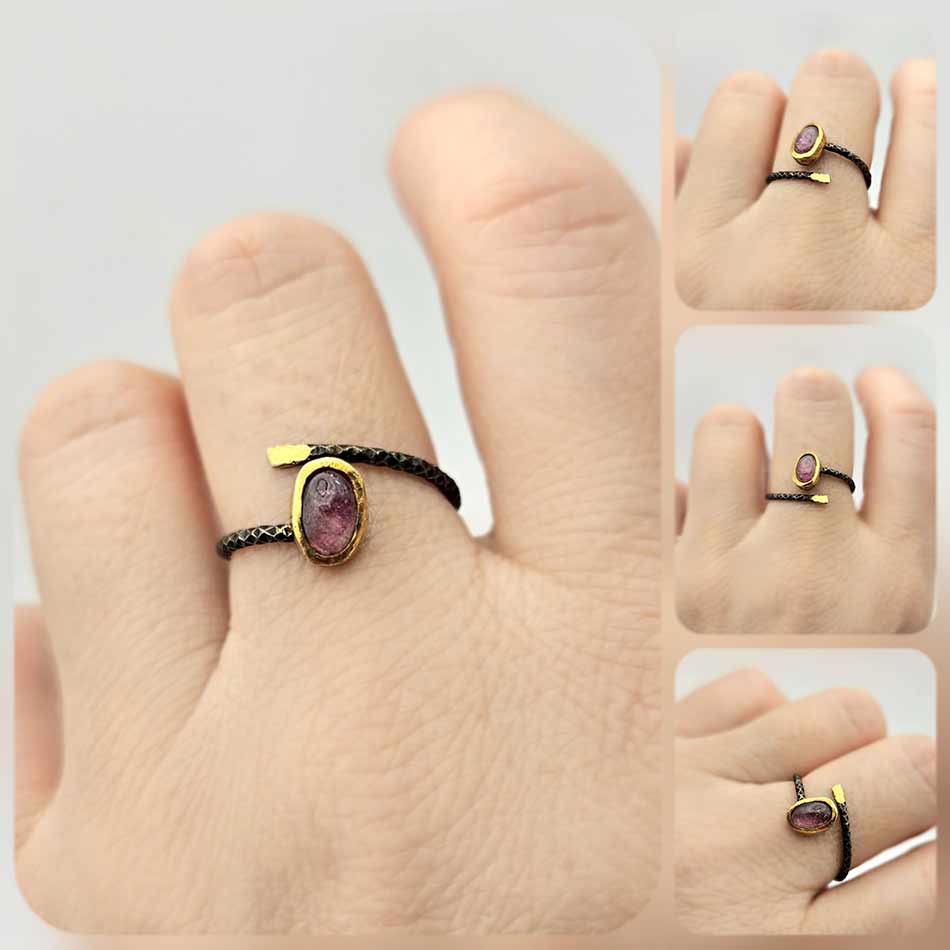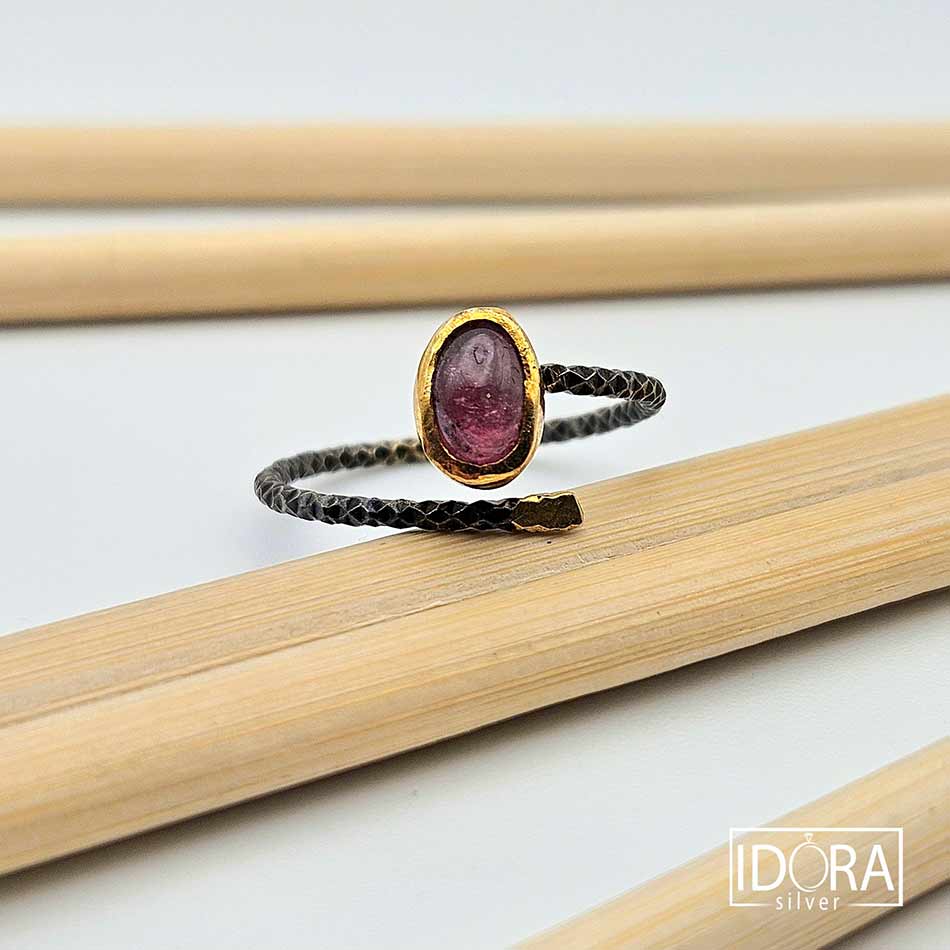 РОЗОВ ТУРМАЛИН в елегантен шедьовър, съчетаващ стилът, природната красота, защитата и баланса обуславящи енергията на камъка, уловен в тънка, здрава рамка с черно родиево покритие.