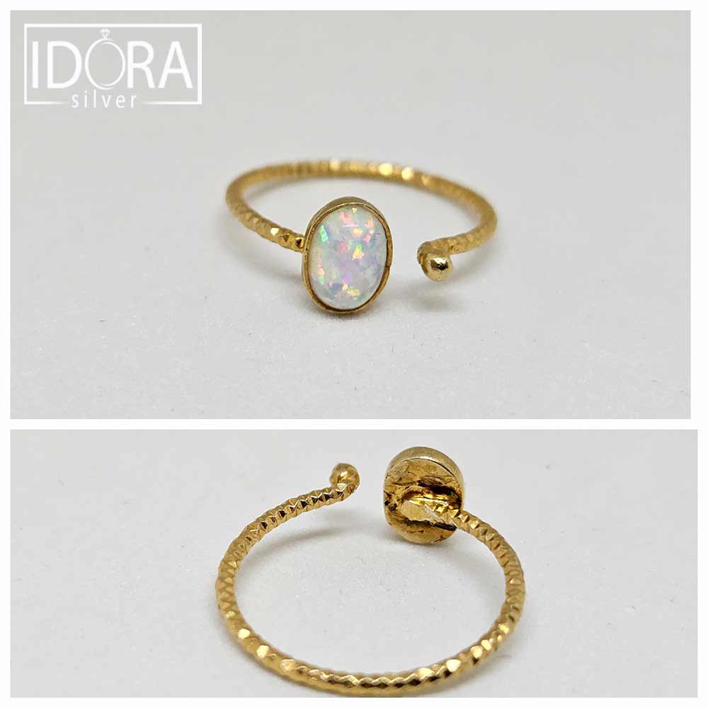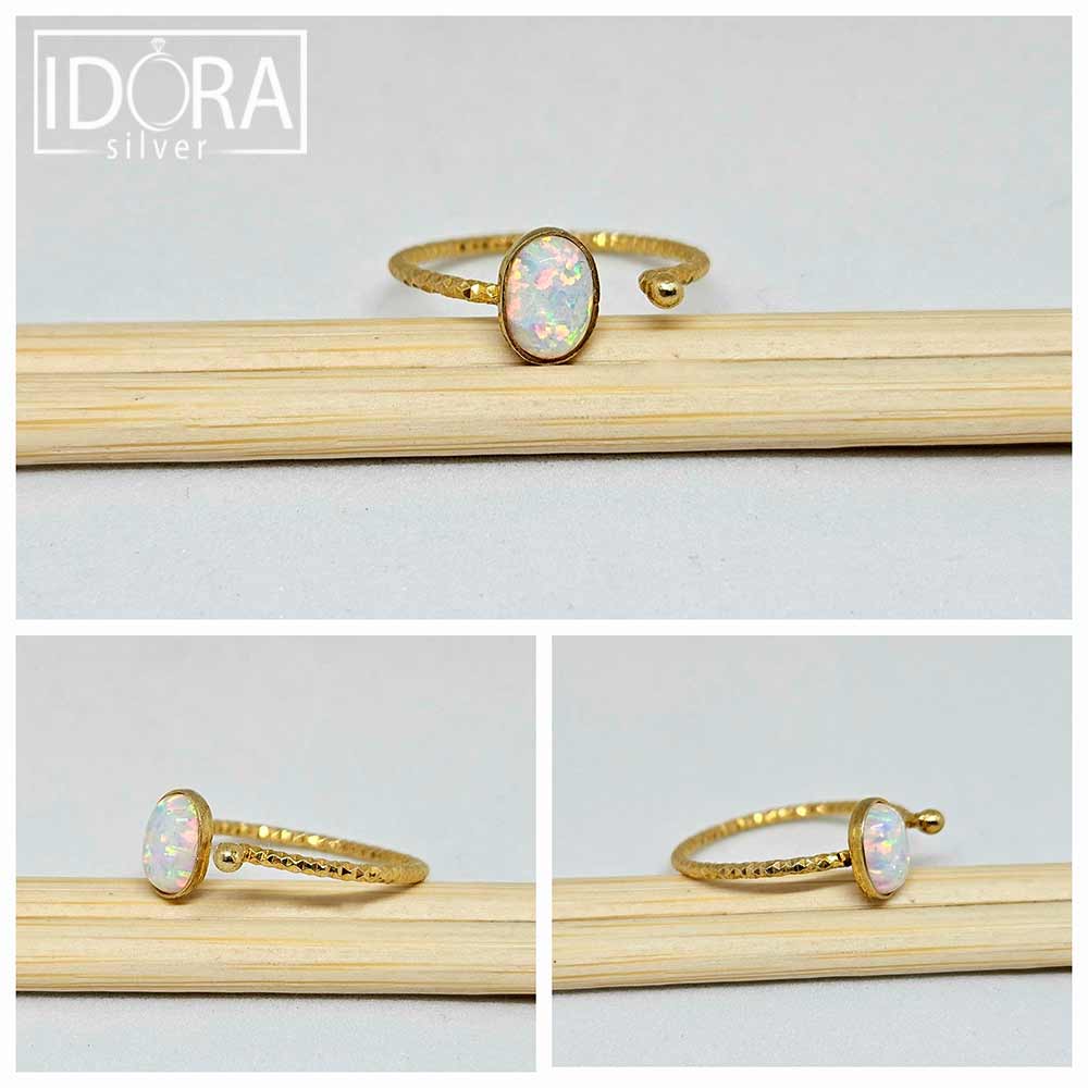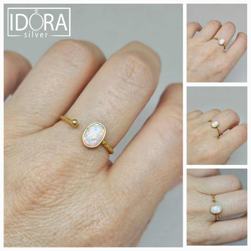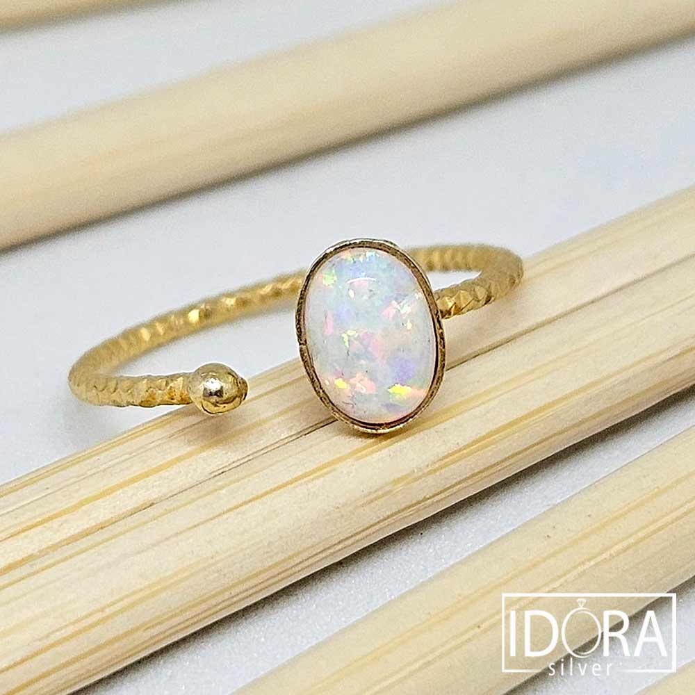 Етиопски опал – камък с магична игра на цветове и вътрешна светлина, застава в центъра като атрактивен акцент на изящна минималистична изработка. Регулируемата релефна халка осигурява удобство и съвършено прилягане, докато топлият блясък на позлатата нежно подчертава сиянието на опала. Съчетаващи се в хармония, тези елементи превръщат бижуто в символ на деликатна елегантност и съвременен стил.