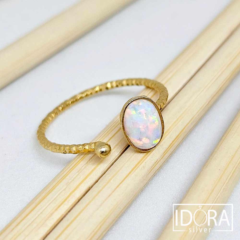 ЕТИОПСКИ ОПАЛ в ролята на атрактивен акцент на минималистична изработка с регулируема релефна халка, допълваща с блясъка от позлатата си нежното сияние на камъка.
