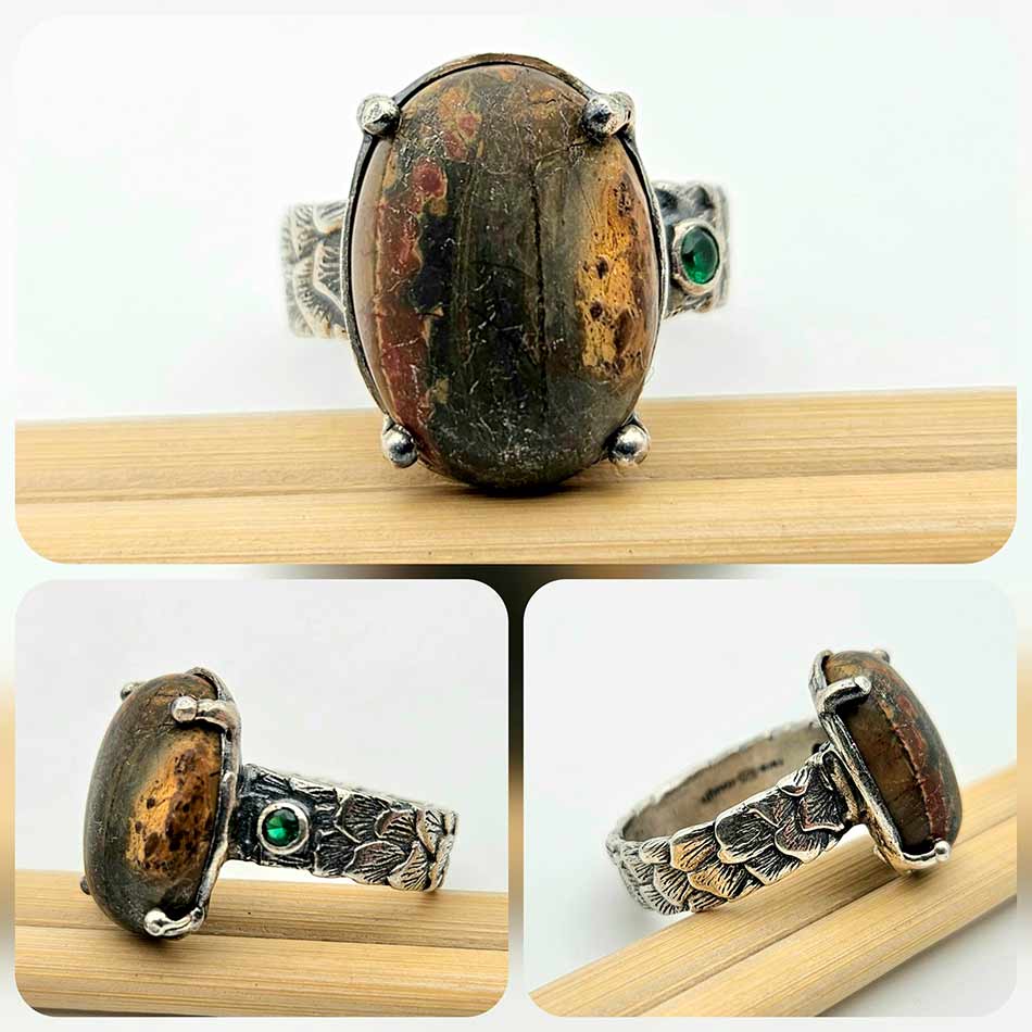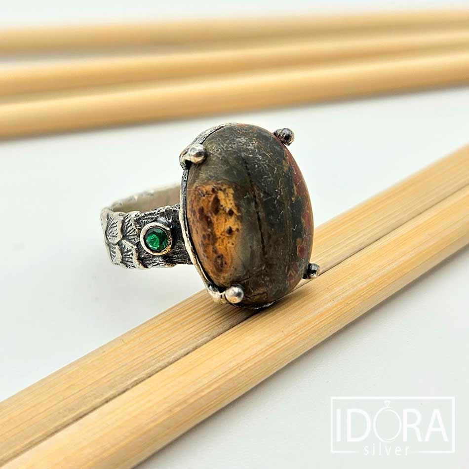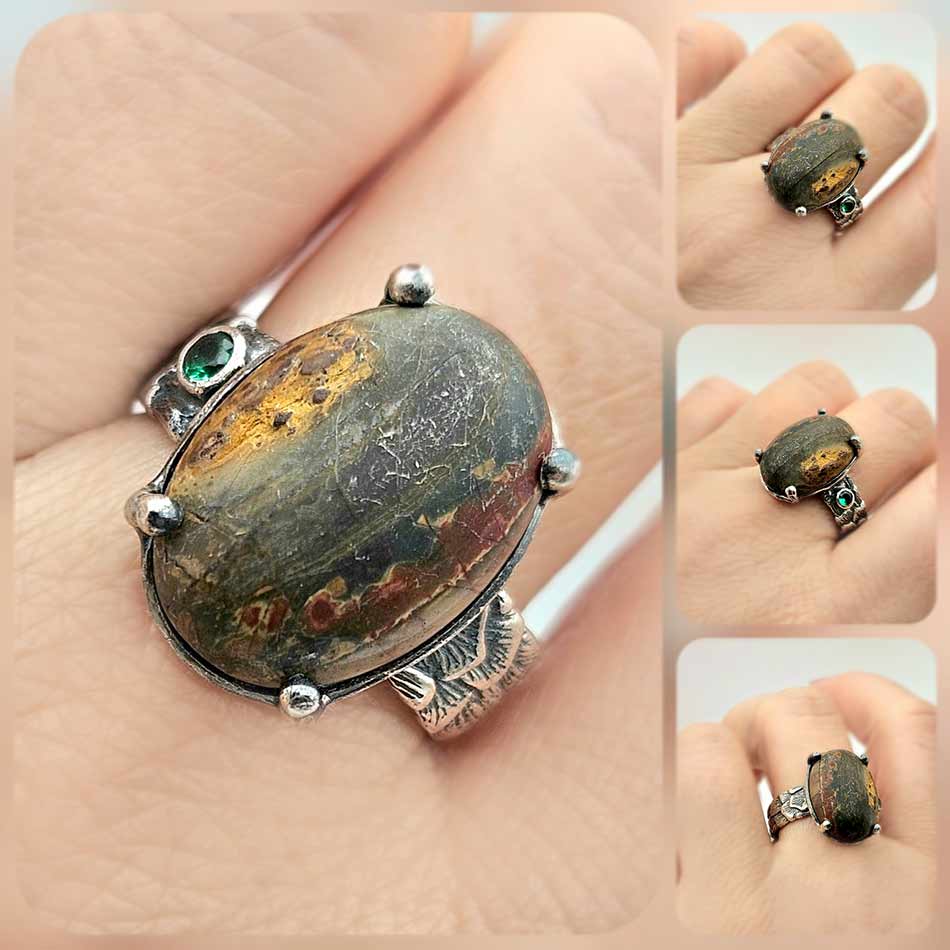 Овален ЯСПИС от разновидност ТАЙГЪР АЙРЪН (съчетание от хематит, червен яспис и тигрово око)във великолепие от цветове, преплетени в нюанси на тъмен зелен и златисто кафяв оттенък, напомнящи мраморен пейзаж, прорязан от фини златисти линии. Полиран до съвършенство..събрал илюзия за древност и носталгия.