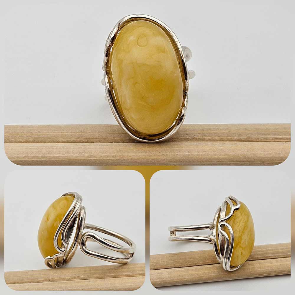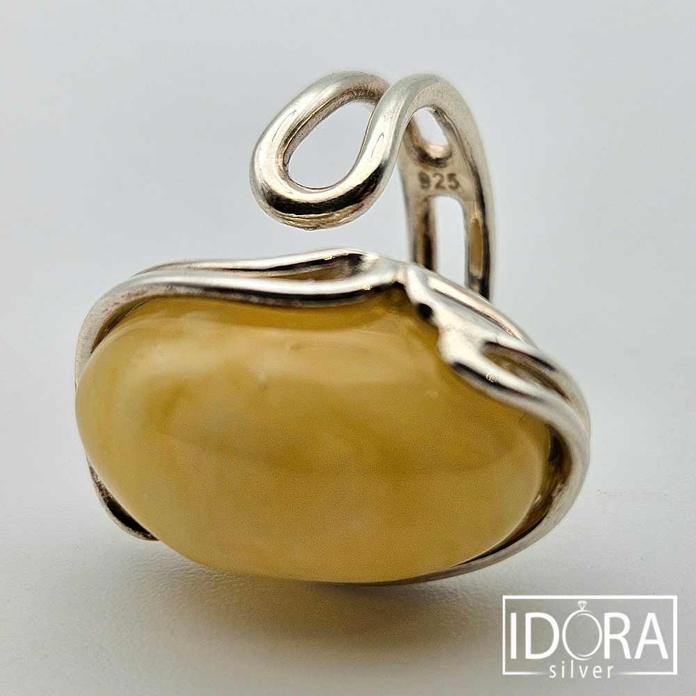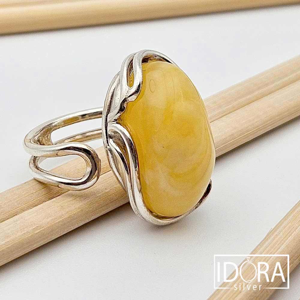 ЯЙЧЕН КЕХЛИБАР във впечатляваща скулптура – топлият жълт цвят с млечни облаци във вътрешността си, напомня на залез уловен и запечатан във вечност. Сребърната рамка от лиани, прегръща кехлибара, позволявайки му да диша и да излъчва собствената си светлина. Пръстенът носи усещане за естественост, свобода и леко бохемска елегантност.