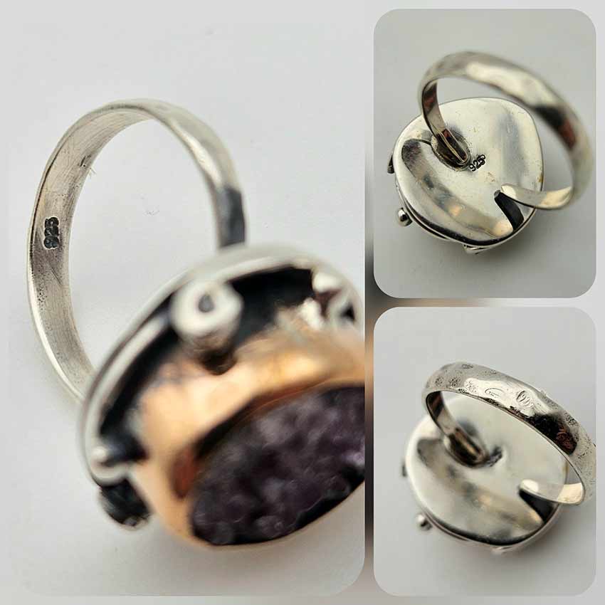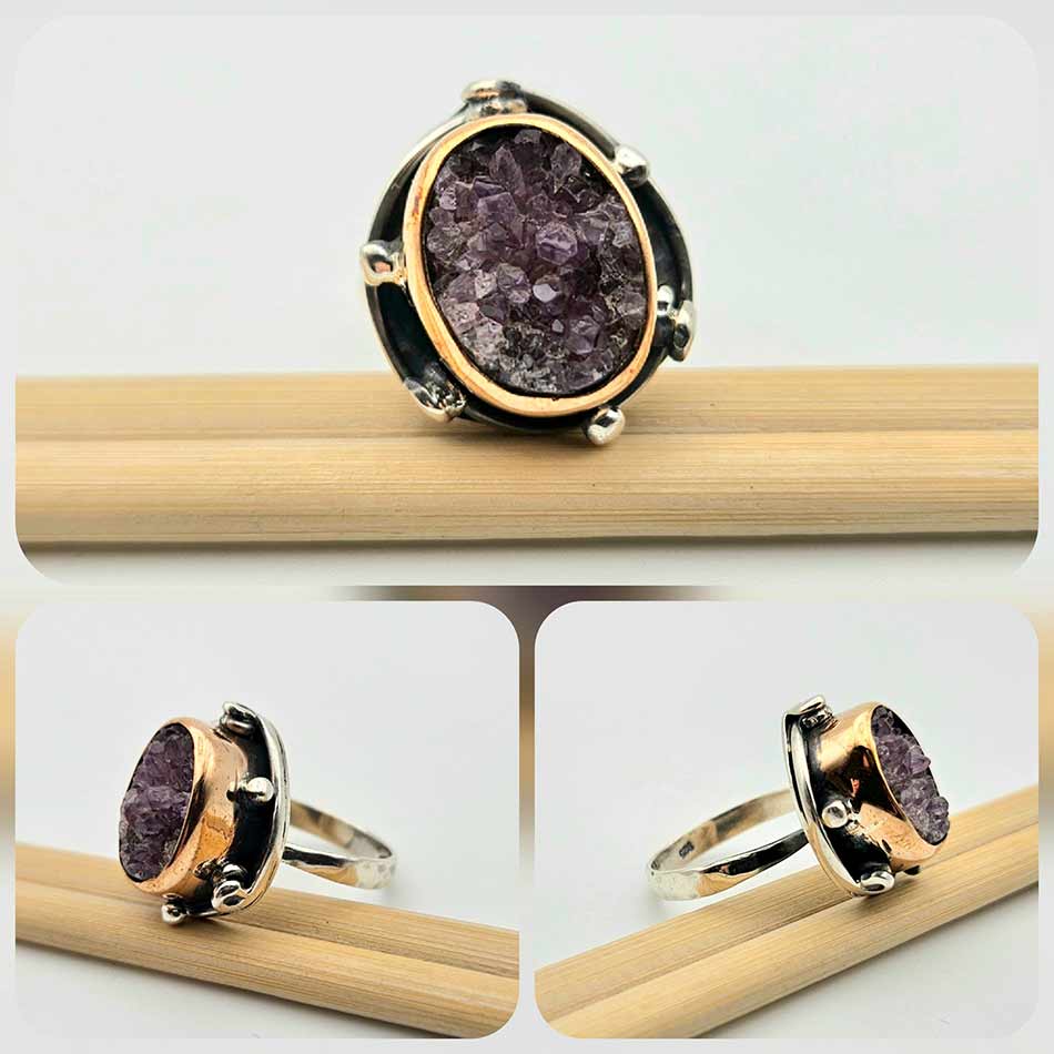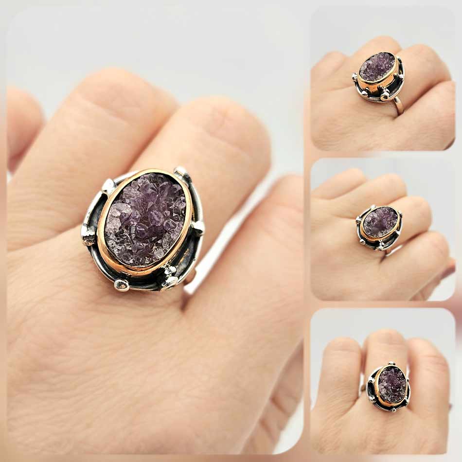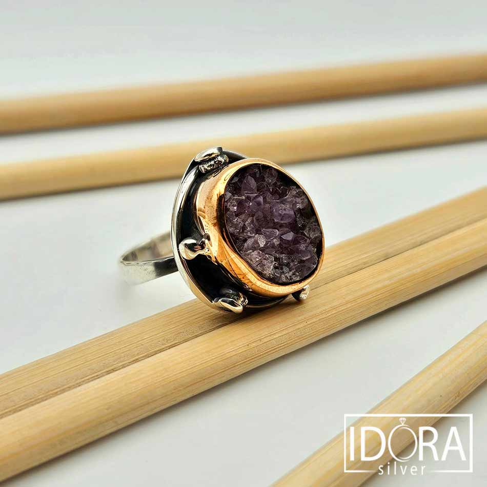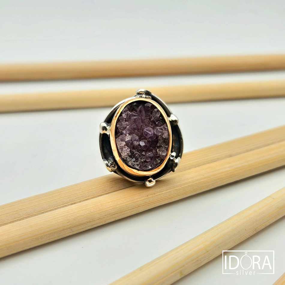Суров АМЕТИСТ в скали от дълбоки лилави нюанси, обграден от нежно проектирана сребърна рамка с позлата във висок обков и малки детайли около короната, поднасяща камъка с впечатляваща прецизност към естествената му красота.