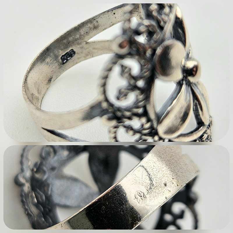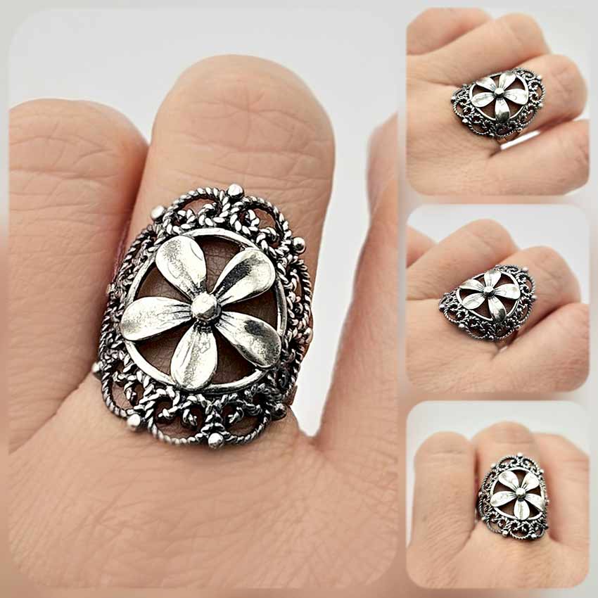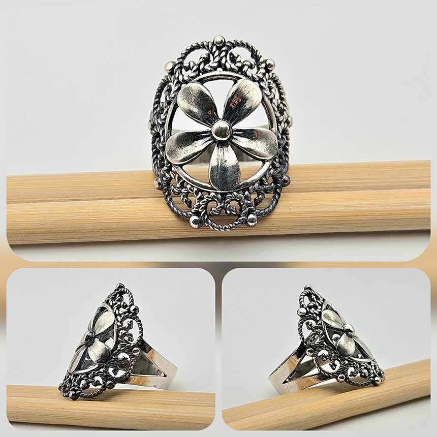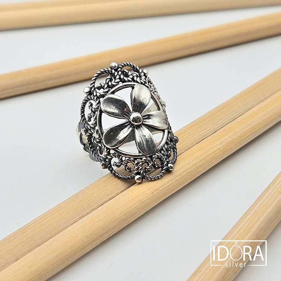 Миниатюрен скулптурен свят със стилизирано цвете рамкирано с орнаменти, вплетени в изящни филигранни извивки, напомнящи тайна градина, съхранена в широка деликатна композиция.