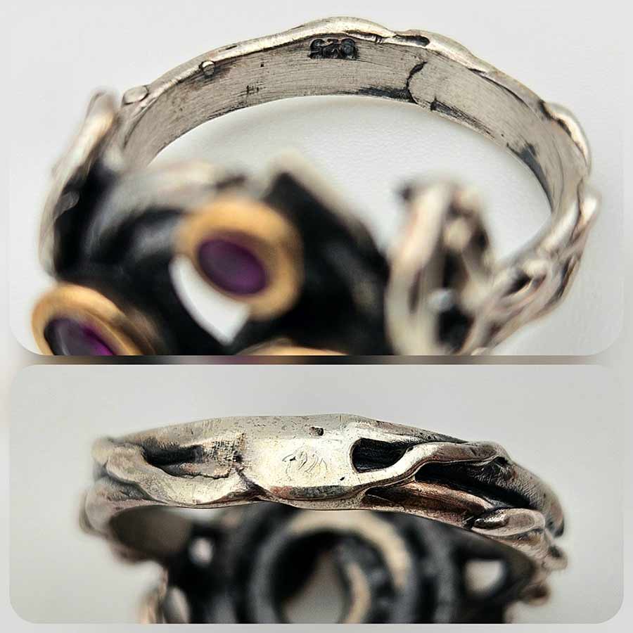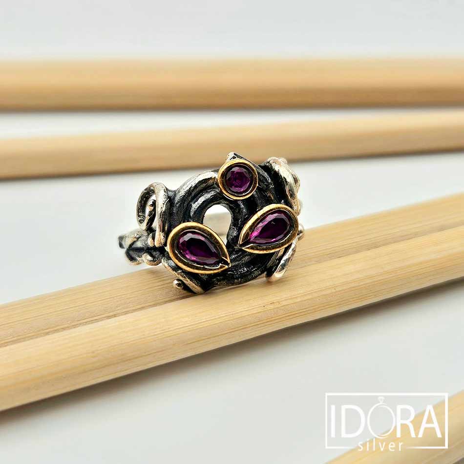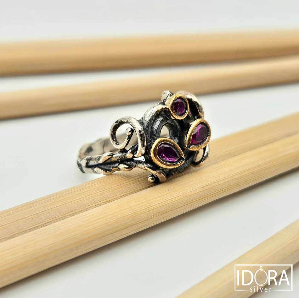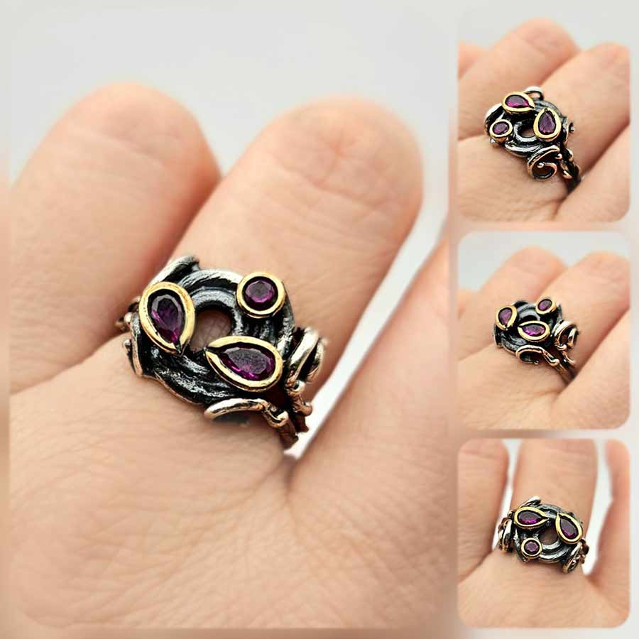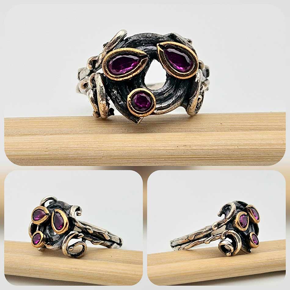 Излязъл от тиха приказка, този пръстен носи духа на древна магия, мистерия и съвременно майсторство. Формата му напомня за органични извивки, морско създание, застинало в сребро с топли златни обкови като слънчеви ореоли, прегръщащи наситено пурпурните камъни, които проблясват като капки вино.. или тайни очи – бижу, което не претендира за блясък, а за смисъл.