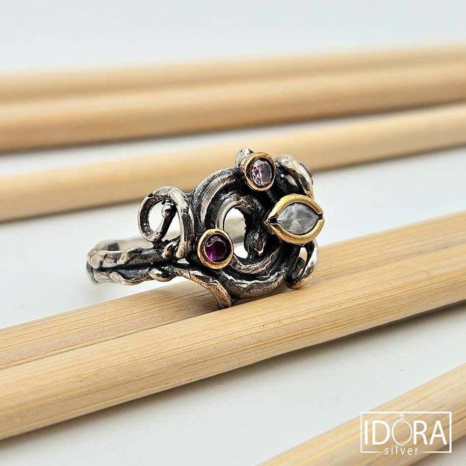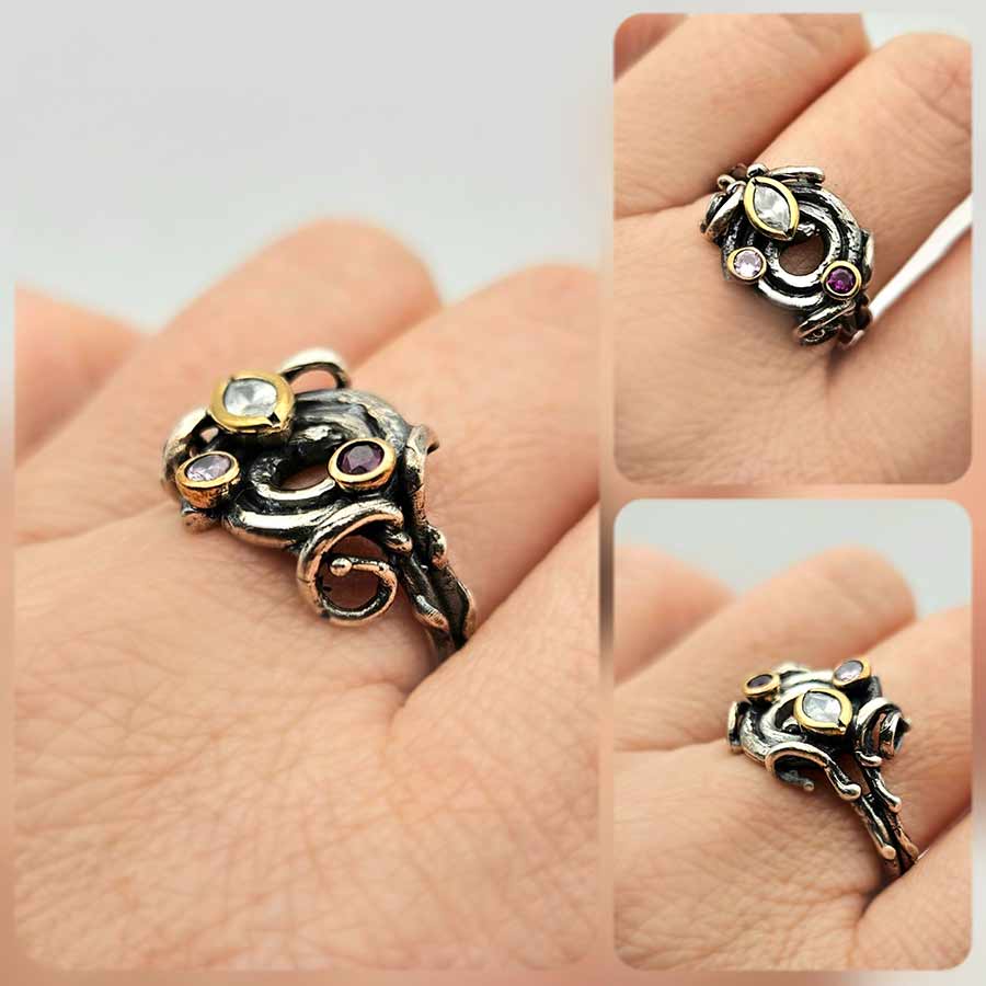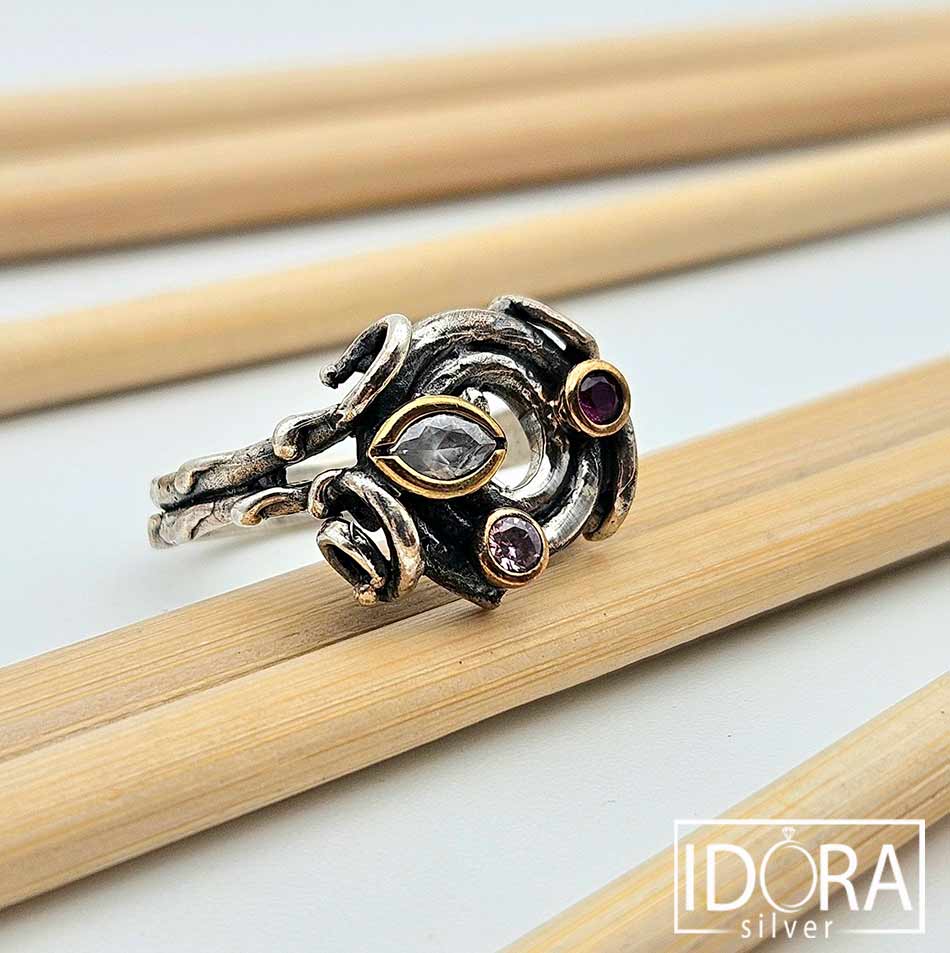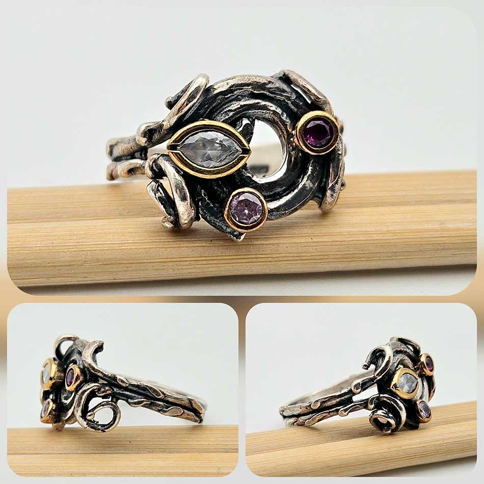Излязъл от тиха приказка, с дъх на древна магия, мистерия и съвременно майсторство. Релефна халка държаща корона с форма напомняща за органични извивки, застинали в сребро с топли позлатени обкови като слънчеви ореоли, прегръщащи наситено блестящите разноцветни ЦИРКОНИ – бижу, което не претендира за блясък, а за смисъл.