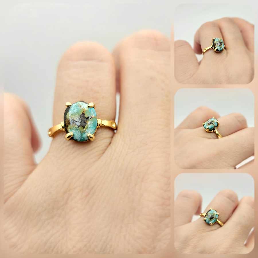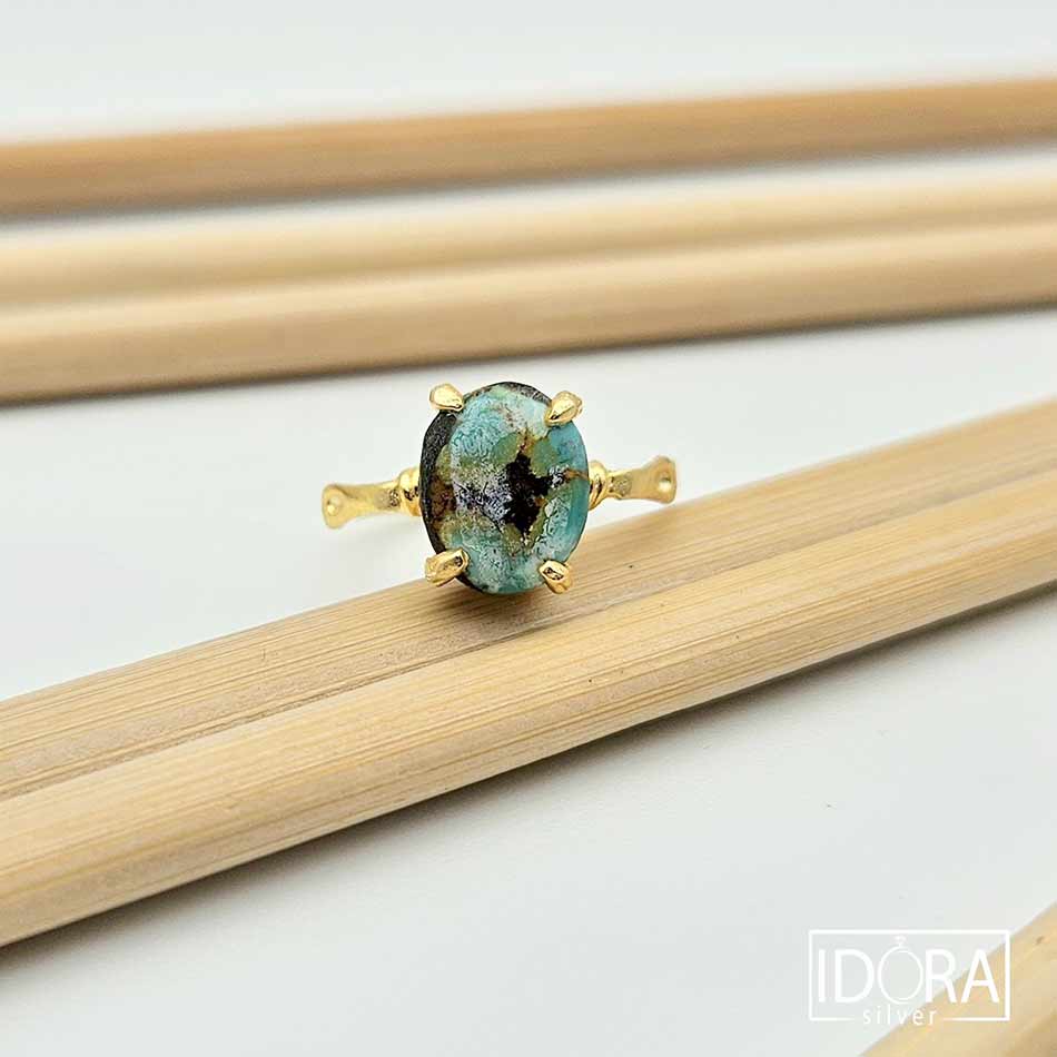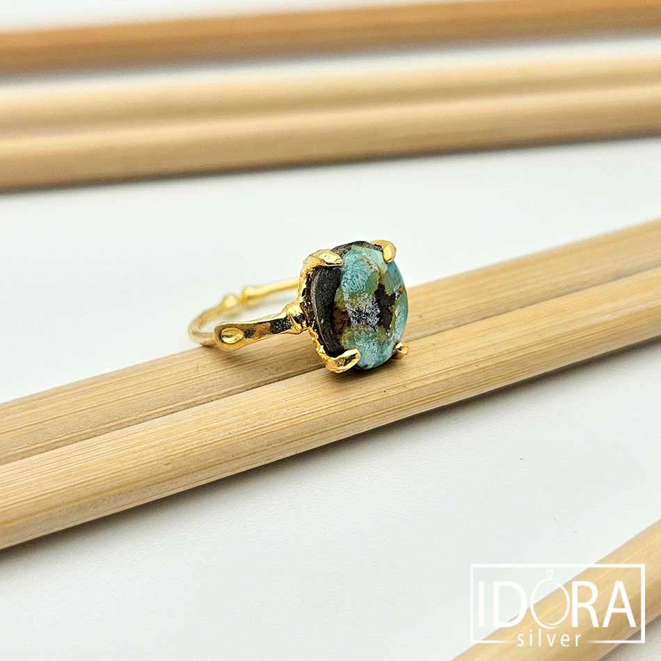 Лек и елегантен дизайн като впечатляващ пример за изящна и живописна комбинация от цветове, привличащи вниманието и внушаващи усещане за уникалност. Естествен ТЮРКОАЗ, обграден от халка и фина корона в позлата, подчертаваща нежните синьозелени нюанси на камъка, придавайки му артистичен характер. Нежността на формите в комбинацията с позлата създават усещане за лукс и изтънченост.