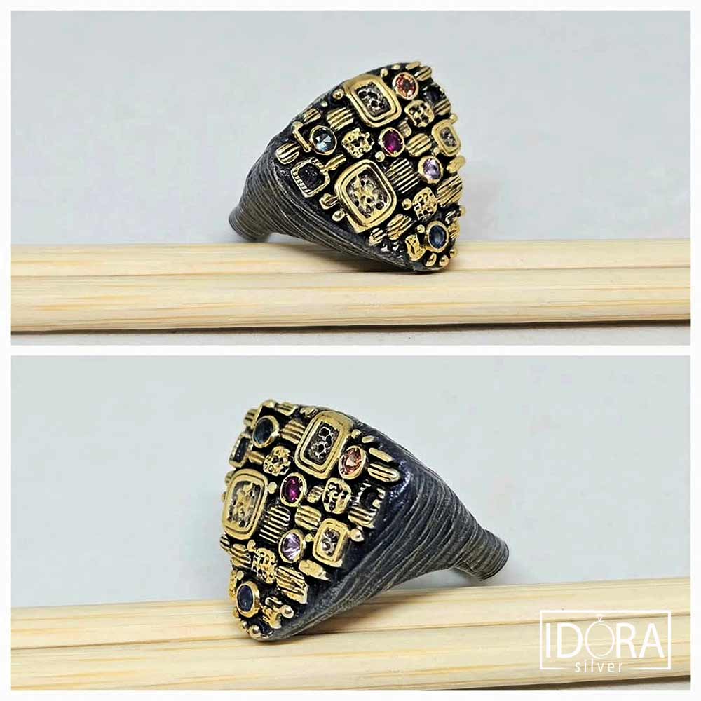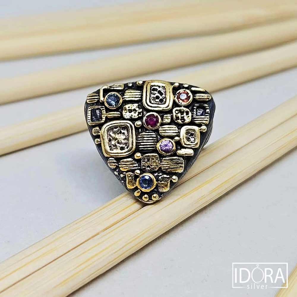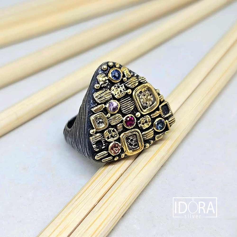 Минималистичен символизъм в богатство от златиста мозайка от рубин, оранжев сапфир, син сапфир, аметист, топаз върху черен родий, в букет от орнаменти, създаващи усещане за луксозения и сияен ефект на златната живопис.