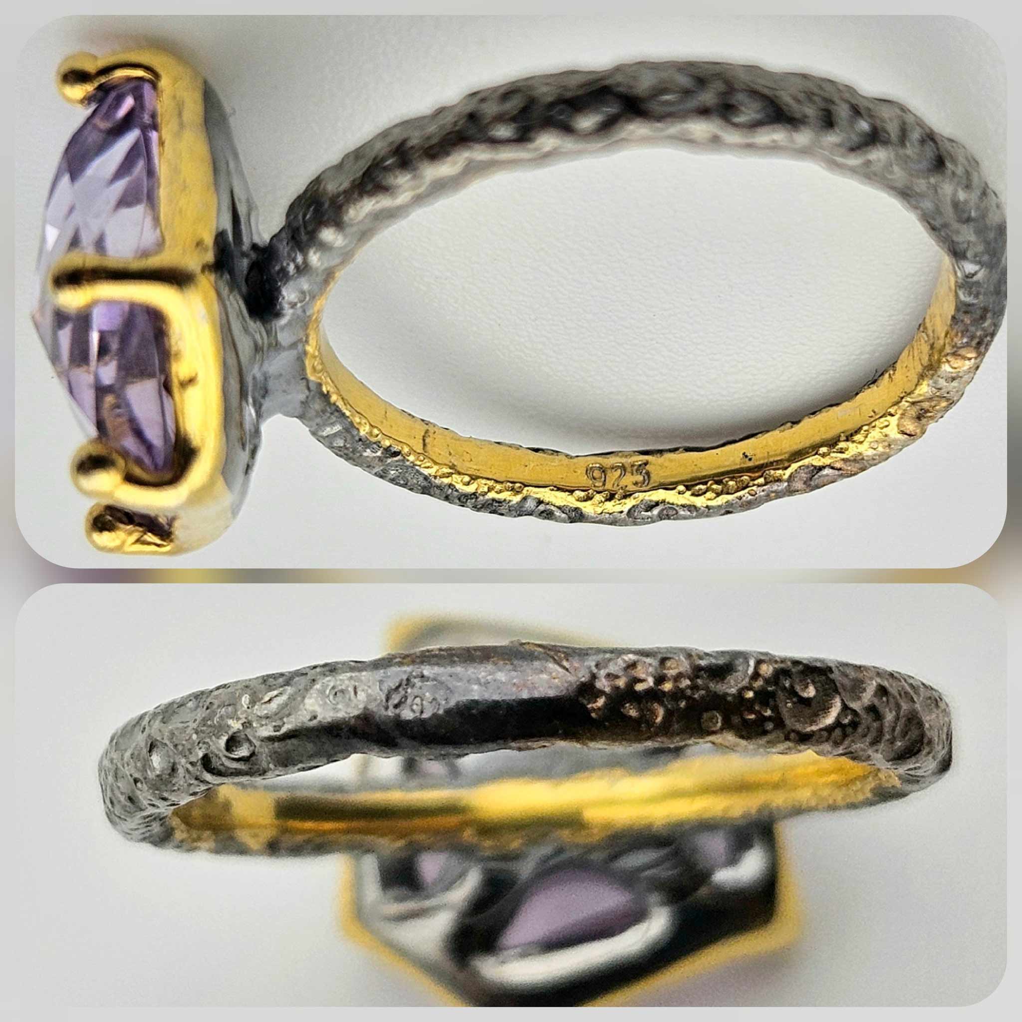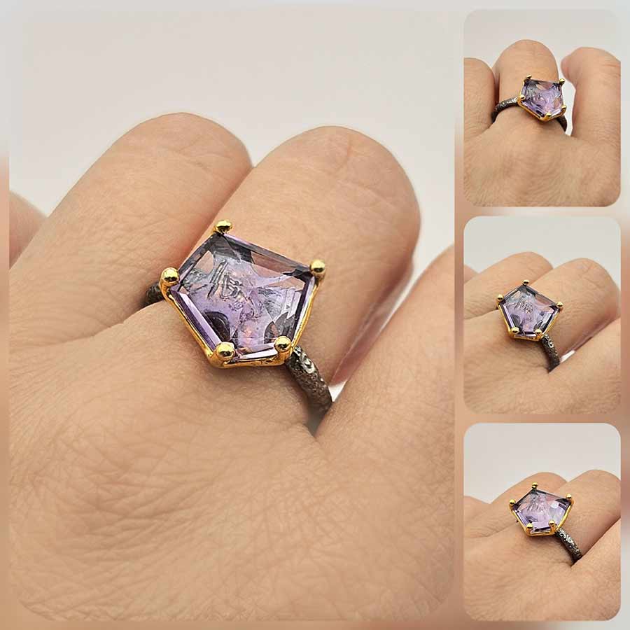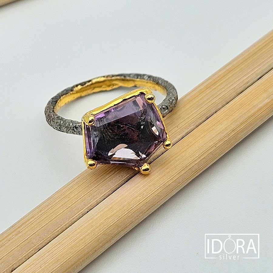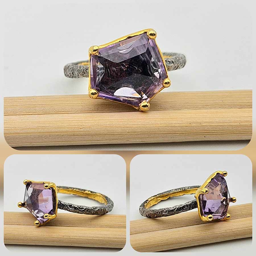 Фасетиран АМЕТИСТ с неправилна, почти скулптурна форма, блести в корона в дълбоки виолетови нюанси, напомнящи за мистичната светлина на здрача. Обковът с позлата носи топъл контраст на камъка и се откроява върху родираната халка, чието текстурирано покритие придава усещане за древност и ръчна изработка.