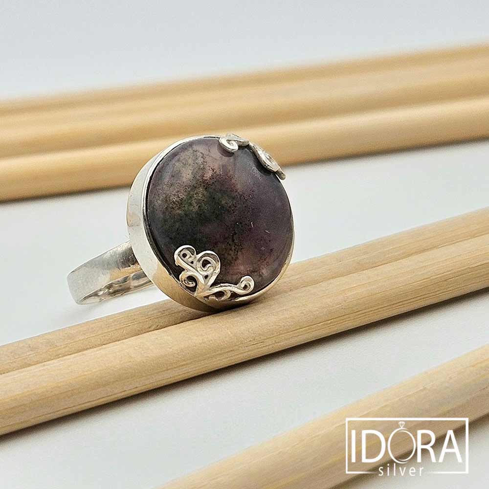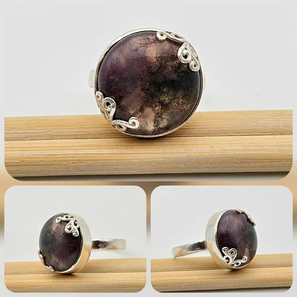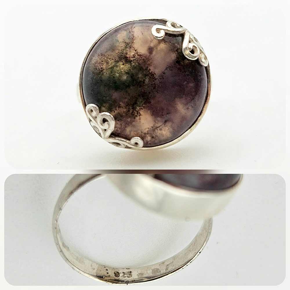 Авторска изработка и МЪХОВ АХАТ събрали в малко произведение на изкуството една миниатюрна вселена, уловена в сребро. Наситеният с дълбоки нюанси на тъмно виолетово, кафяво и зеленикаво камък напомня нощно небе обвито в мъгла, скрило в себе си усещане за древна тайна приказка, символика на мъдрост, вътрешна сила и докосване до невидимото.