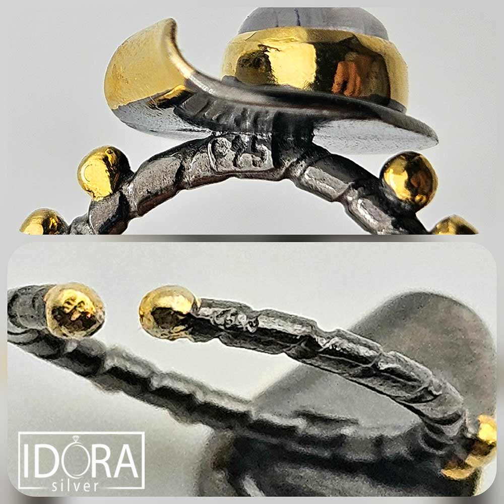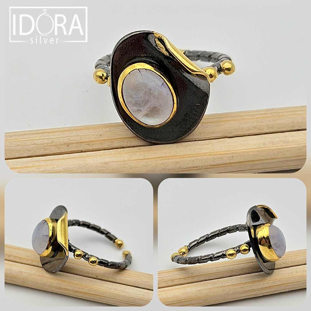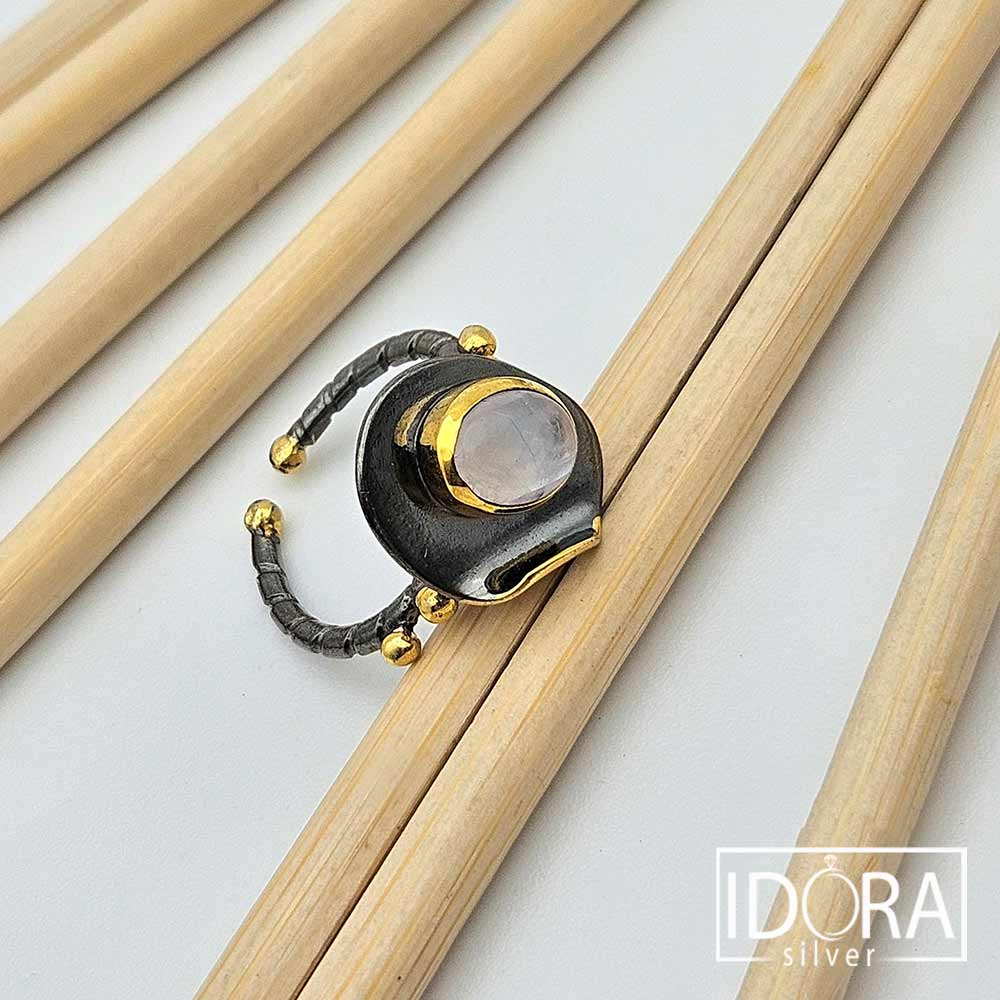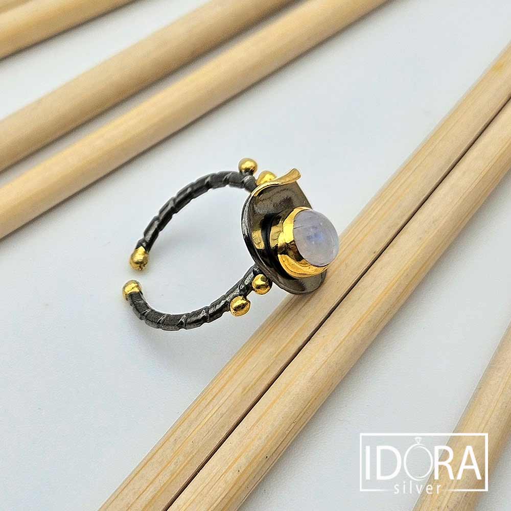 ЛУНЕН КАМЪК с нежна опалесцираща светлина, обграден от обков в позлата, излъчващ топлина и блясък на фона на покритие от черен родий, в дълбок контраст с позлатените детайли, напомнящи капчици, прецизно поставени като акценти.