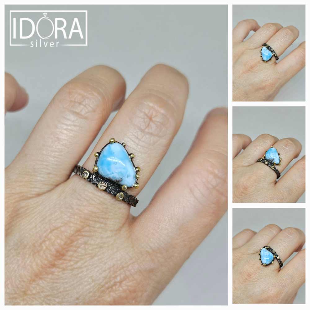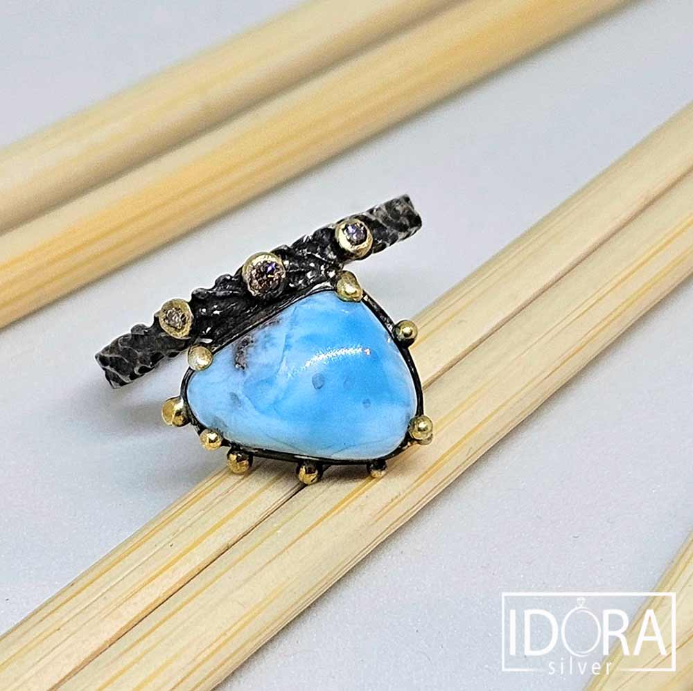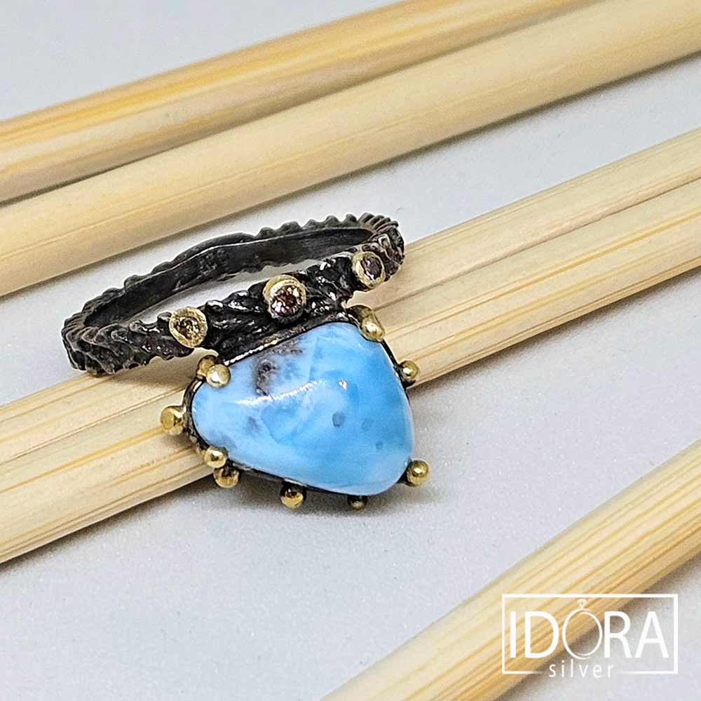 Трио КАФЯВИ ДИАМАНТИ в партньорство с ясно син ЛАРИМАР, носени от релефна халка облечена в черен родий и елементна позлата.