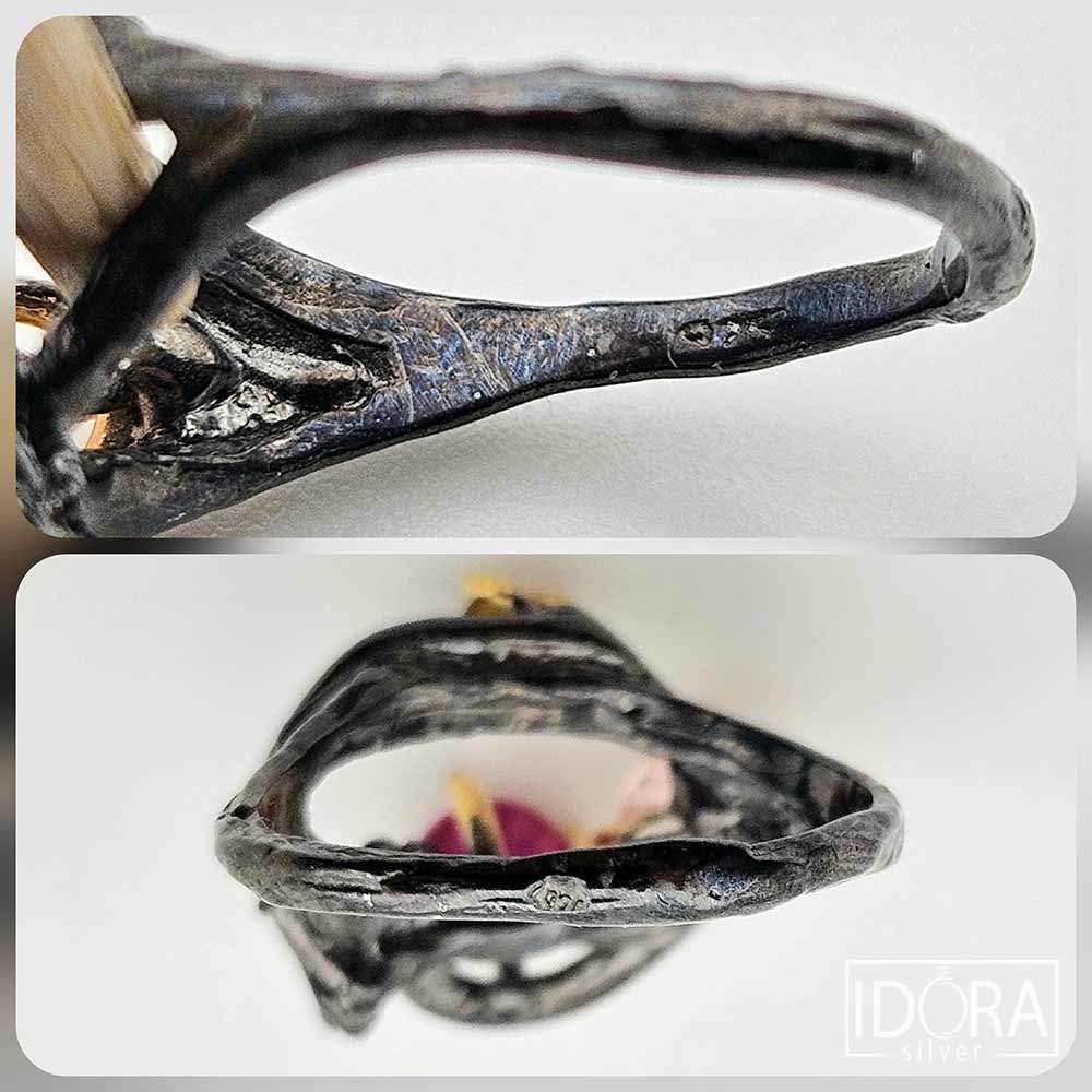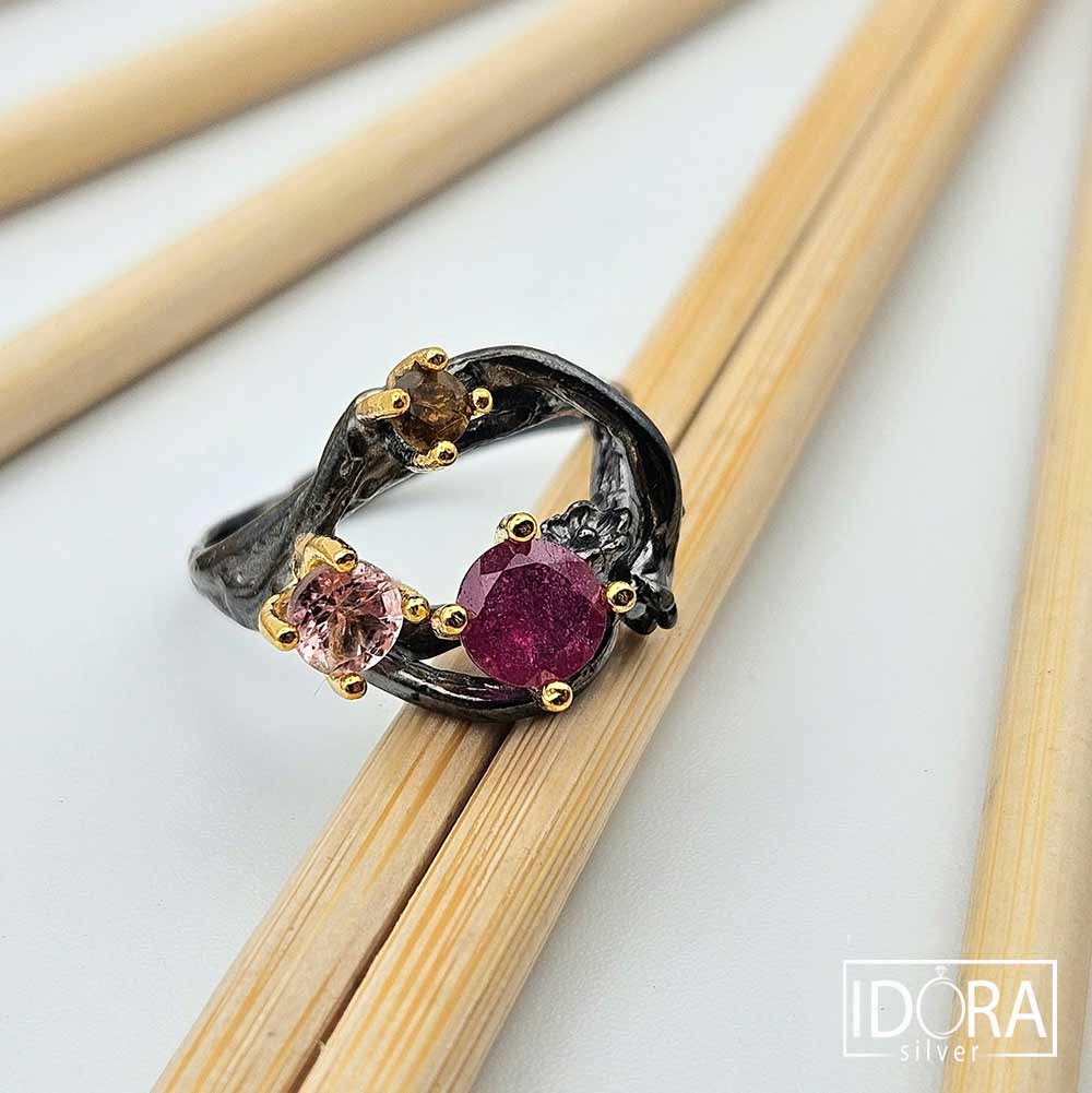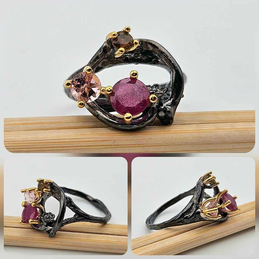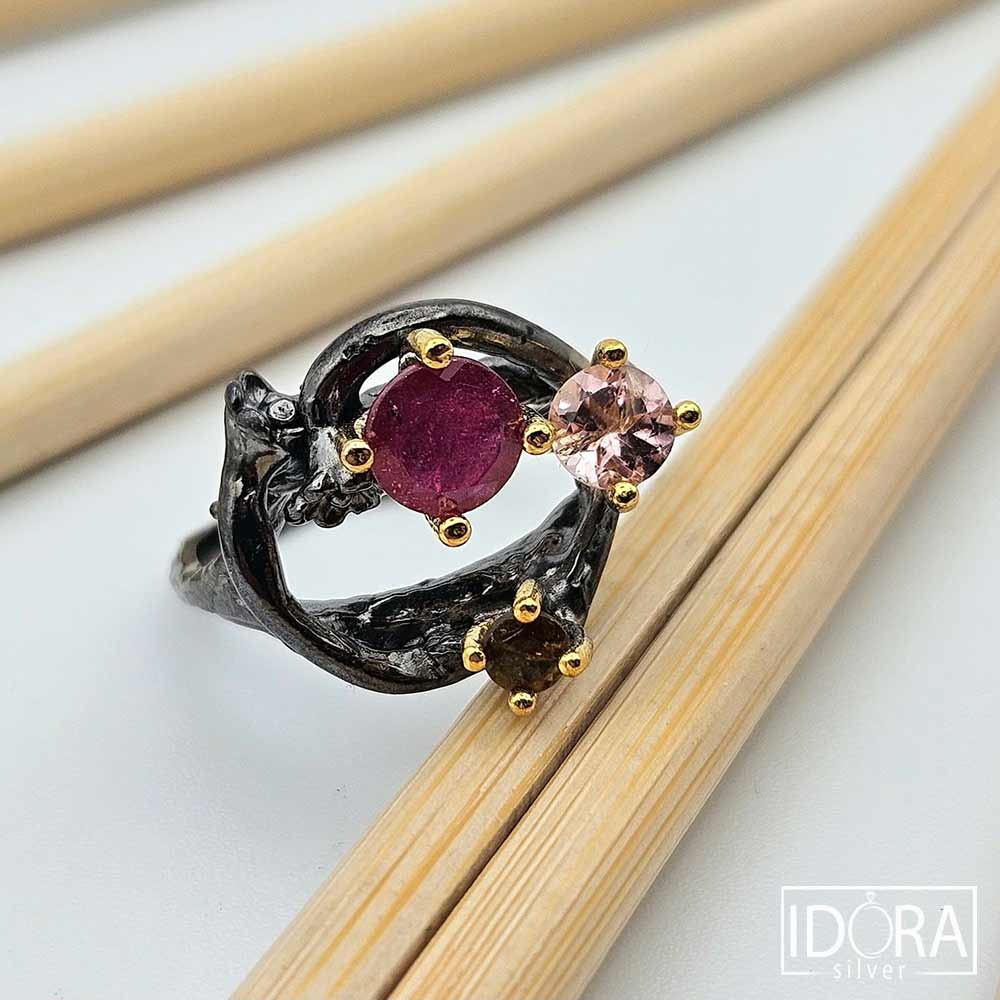 Фасетирани РУБИН, ТУРМАЛИН и СУЛТАНИТ – три камъка със собствен характер и магия – са нежно прегърнати от плътни сребърни лиани, вплетени в композиция, наподобяваща застинал танц върху цветя. Покритието от черен родий придава дълбочина и драматичност, докато фините акценти от позлата подчертават игривите цветови отражения и хармонията между камъните. Резултатът е бижу със силно артистично излъчване – съчетание от природа, символика и изящество, където всяко движение на светлината разказва нова история.