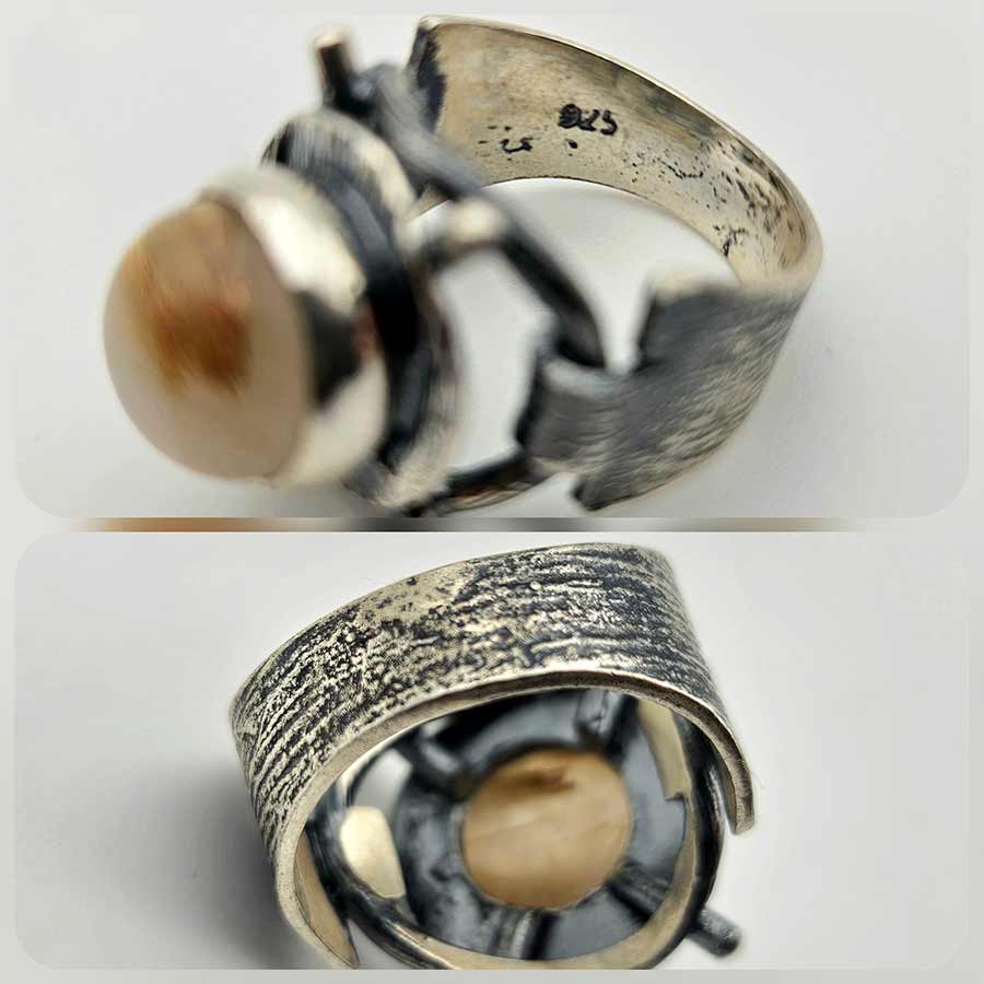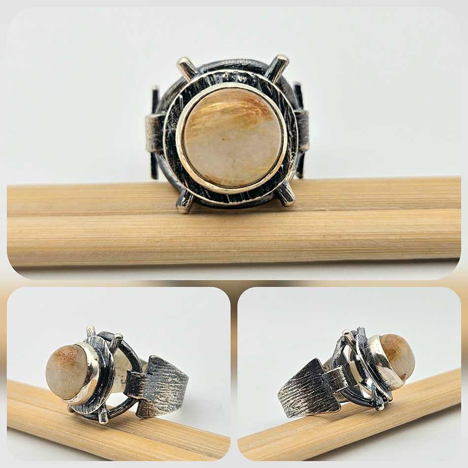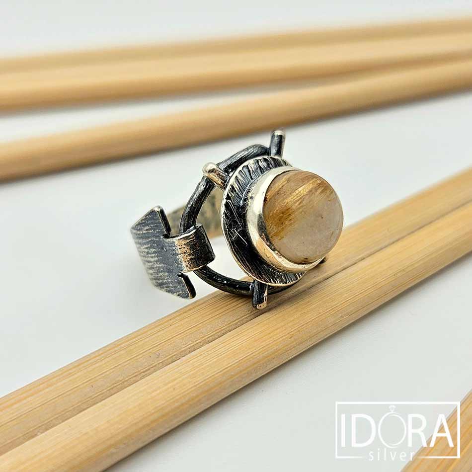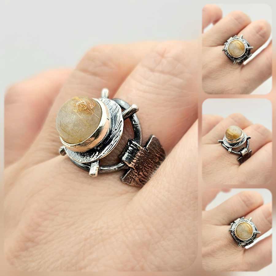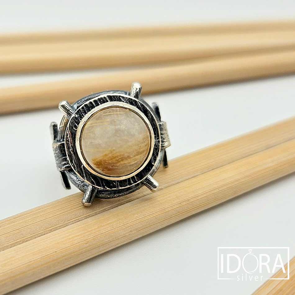 РУТИЛОВ КВАРЦ (Косите на Венера) — суров, мистичен и изящно оригинален. Масивният сребърен обков напомня на корабен рул, древен механизъм или талисман, изваден от забравено царство и уловил топлия камък пропит със светлина, застинала във времето с фини включения преминаващи като следи от слънчеви лъчи, заключени под повърхността.