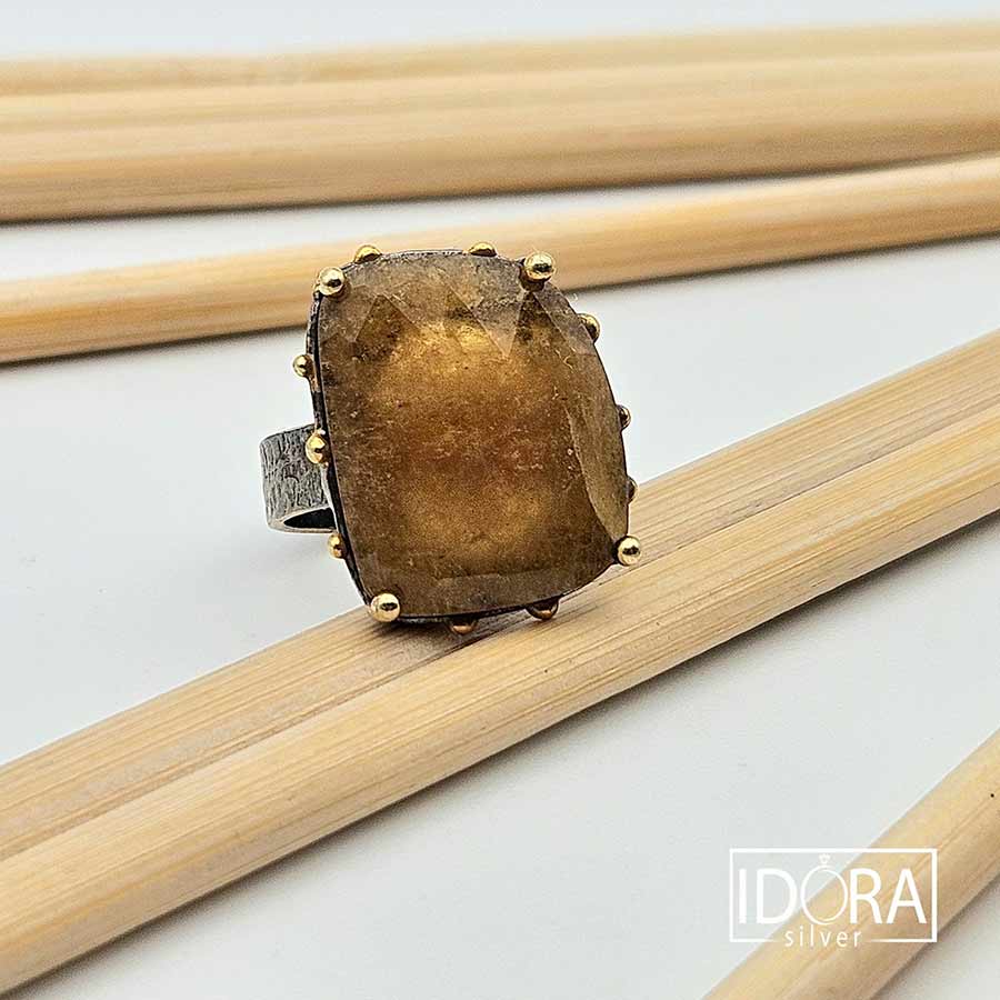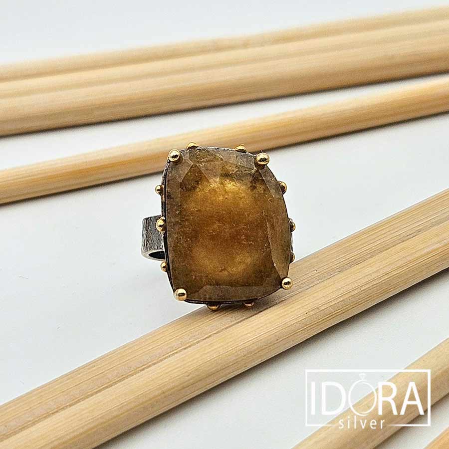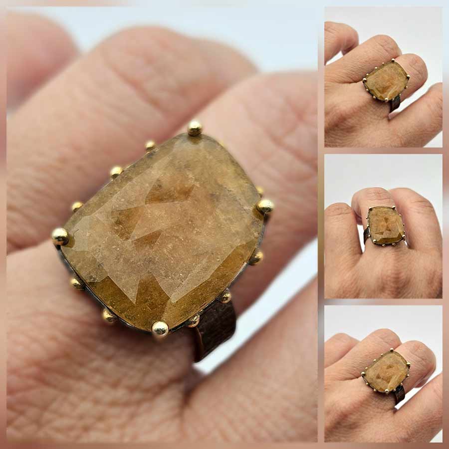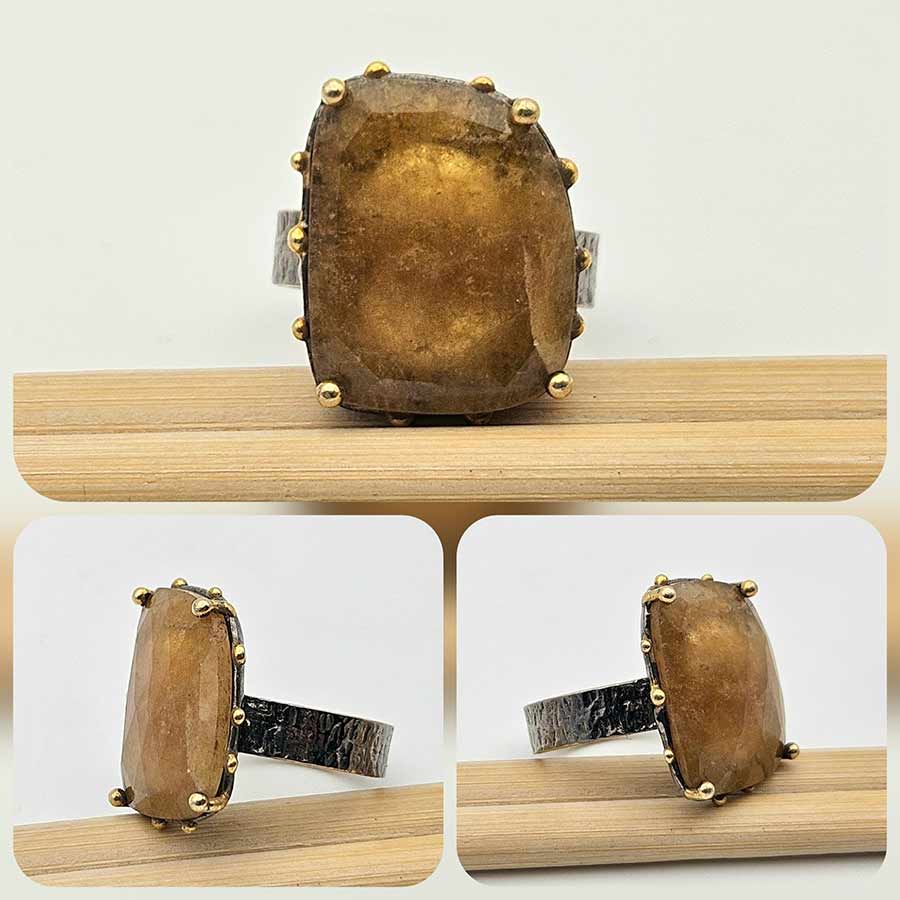 Красиво фасетиран натурален ЖЪЛТ САПФИР, поднасящ цялата си сурова скъпоценна красота в изтънченото изкуство на ювелирството. Масивният камък е в топли златисто-кафяви нюанси, напомнящи изгарящ залез, уловен в минерална форма — земен, дълбок и загадъчен.