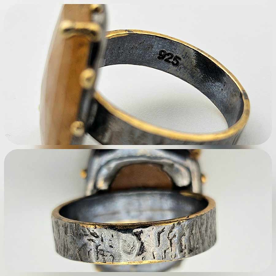 Широка халка с ръчно обработена текстура, елементна позлата и покритие от черен родий, подчертава магнетичната красота на камъка.