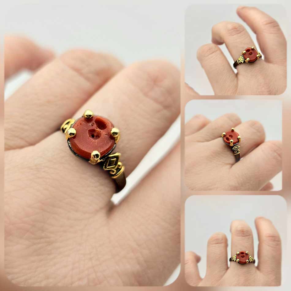 КОРАЛ в дълбокочервен, топъл и плътен цвят, носещ естествените следи на времето, подчертавайки естественият му характер и душа. Орнаменти в позлата контрастират с тъмната основа от чернородиево покритие, създавайки усещане за сила и елегантност, ритъм и древна символика.