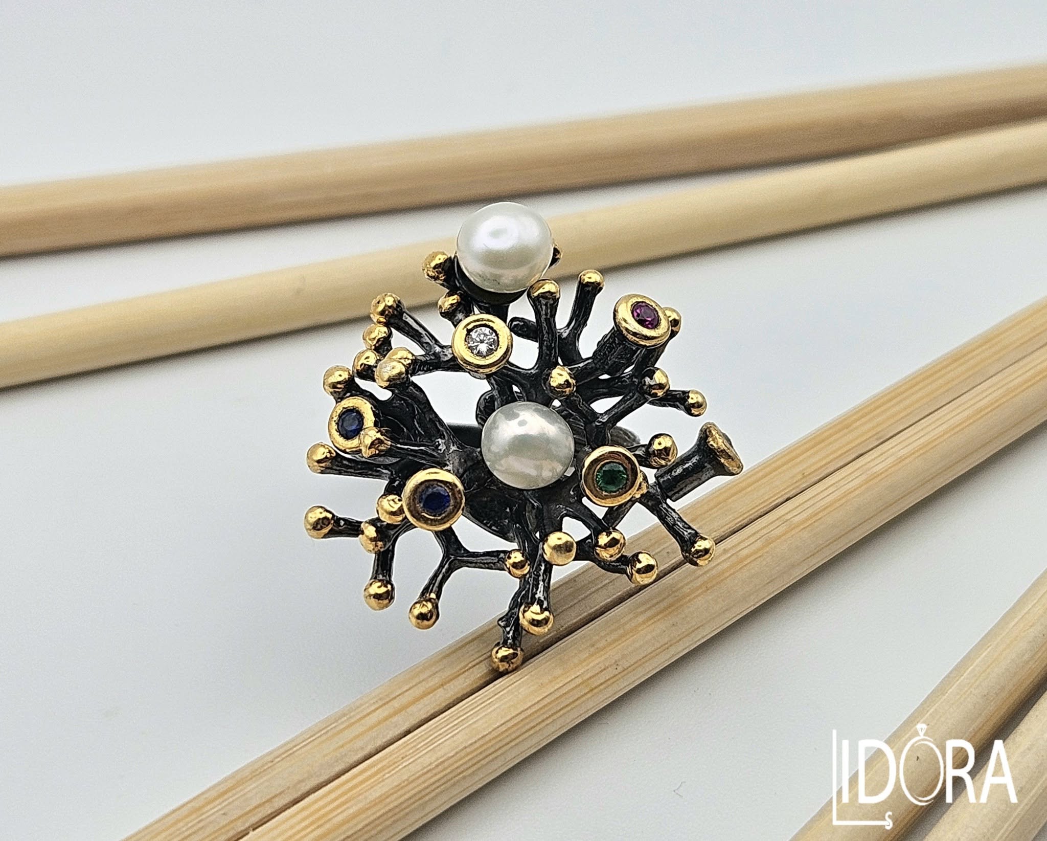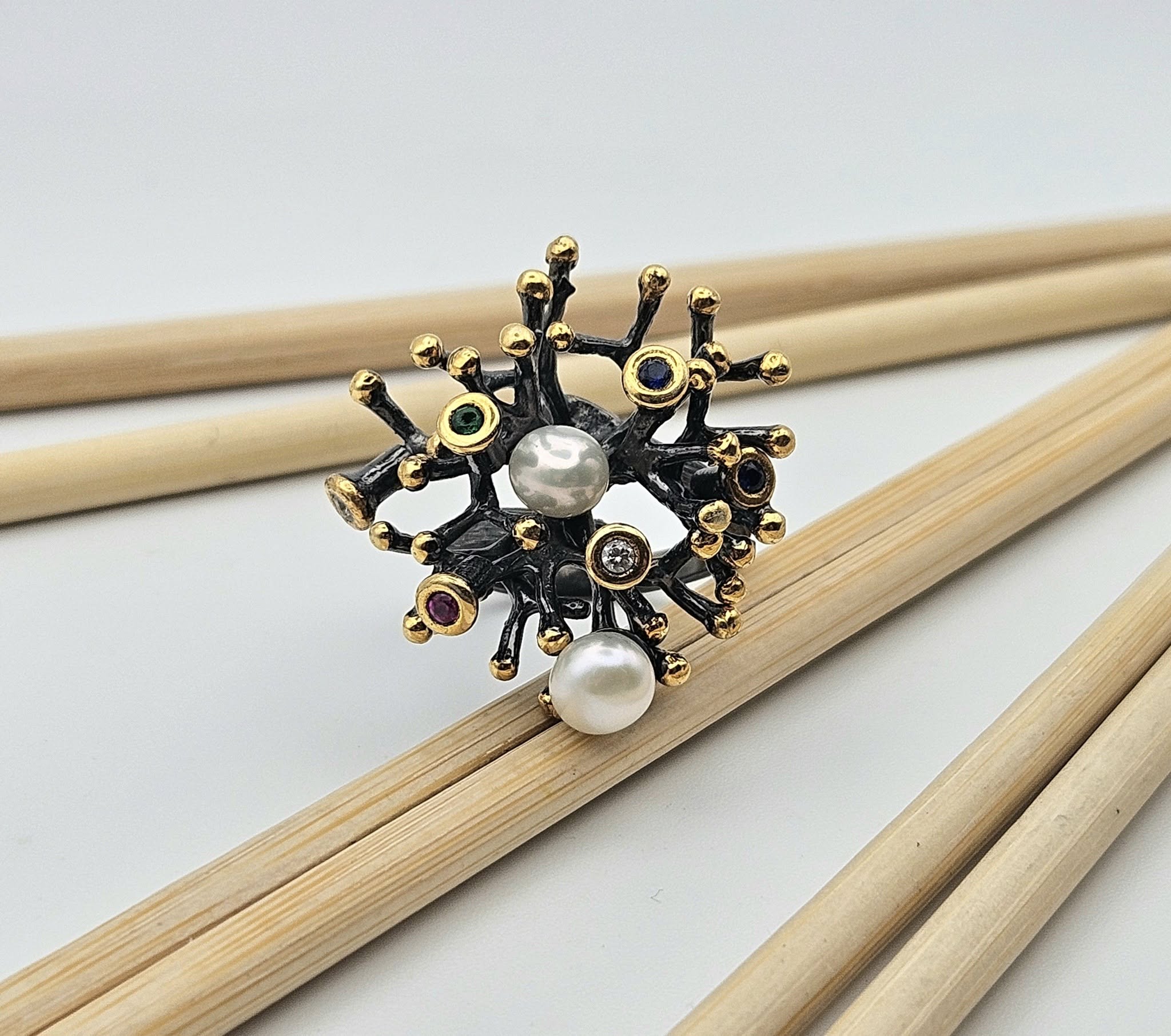 Това не е просто пръстен – това е малка скулптурна вселена, в която се срещат изящество, артистизъм, изтънченост и органична хармония. Формата му носи усещане за приказна магия, сякаш е откъснат от свят на фантазия и превърнат в бижу. Покритието от черен родий придава дълбочина и драматичност, докато позлатените акценти озаряват композицията с топъл блясък. Разноцветните камъни внасят игривост и динамика, сякаш разпилени искри от светлина, а двойката перли в центъра добавя финален щрих на класа, мекота и лукс. Пръстенът е не само украшение, а израз на индивидуалност и въображение.