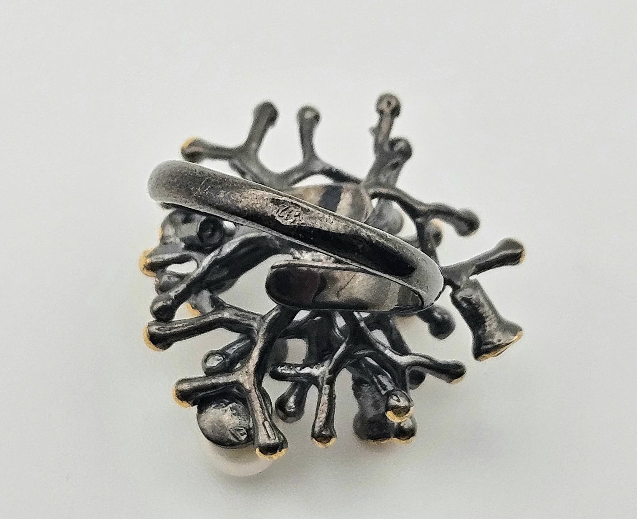 Това не е просто пръстен. Това е бижу, съчетало изящество, артистизъм, изтънченост и органичност в скулптурна форма, превръщаща го в приказна магия. Покритието от черен родий създава драматичен контраст с акцентите в позлата и игривостта на разноцветните камъни, избягали от фокуса в композицията – двойка перли, носещи нюанс на класа, мекота и лукс.