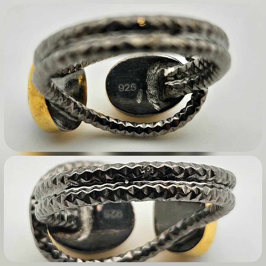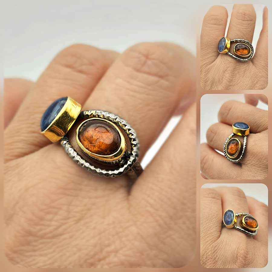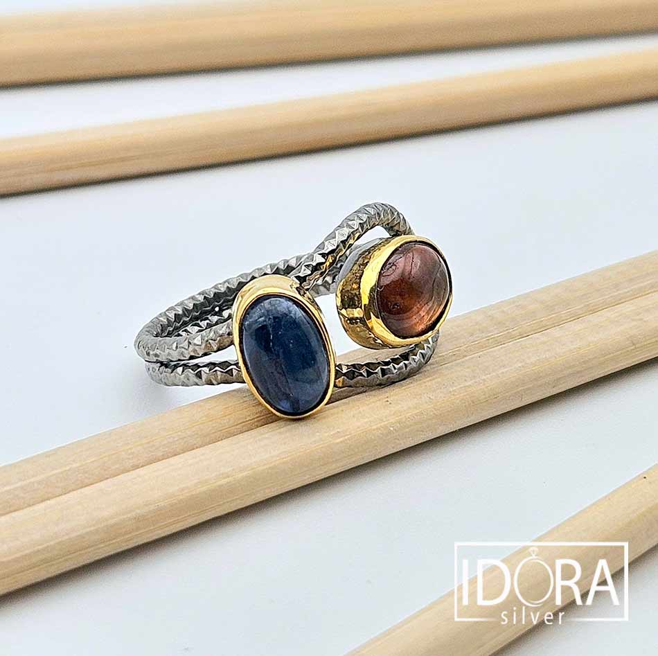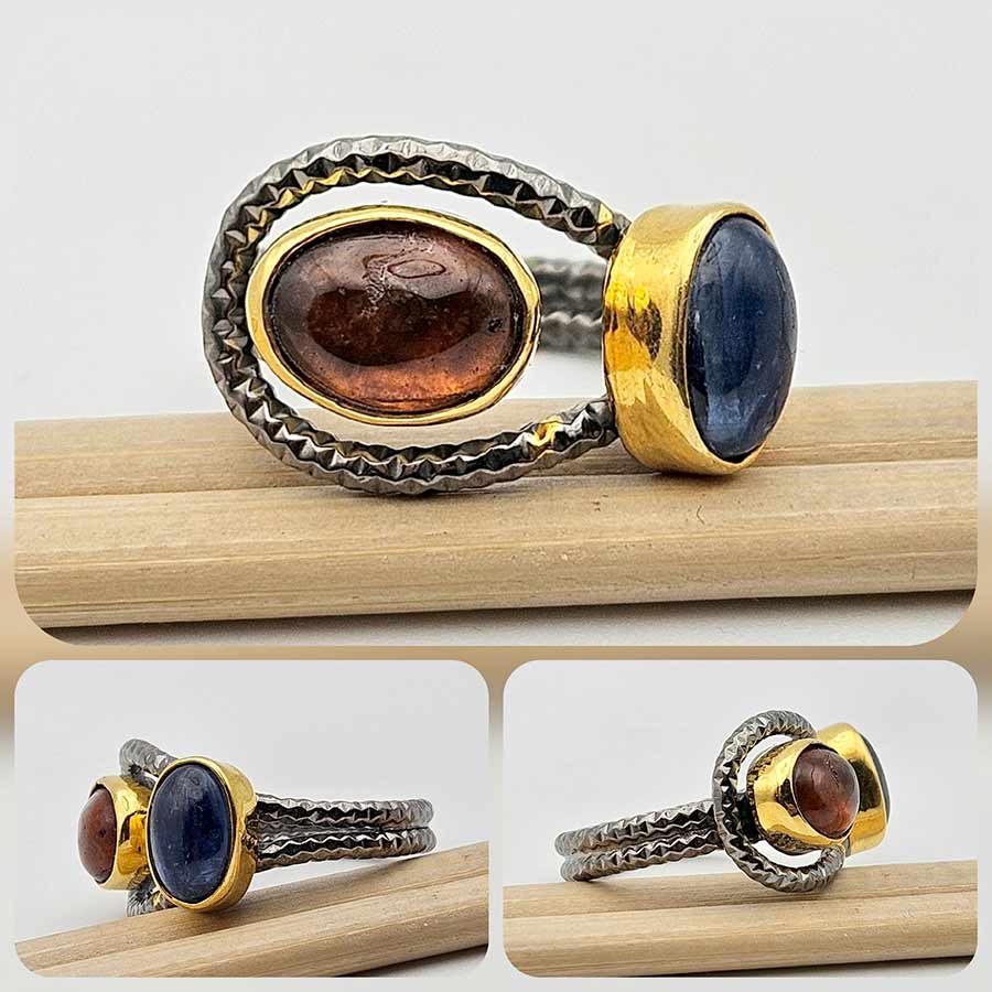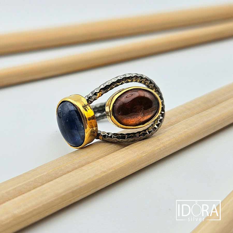 Масивен изящен пръстен, в който се срещат сила, контраст и хармония. Асиметрично разположени КИАНИТИ – единият дълбок като нощно небе в тъмносиня гама, другият, топъл, меднокафяв и загадъчен като залез. Камъните са обгърнати от позлатени обкови, които придават благороден блясък и подчертават естествената им красота. Контрастът между родираното сребро, топлата позлата и живите цветове на камъните създават усещане за баланс между елементите – земя, въздух, огън и вода. Една малка скулптура, която носи духа на индивидуалност и изтънчен артистичен почерк – съвършен акцент, носещ история и символика в своя стил.