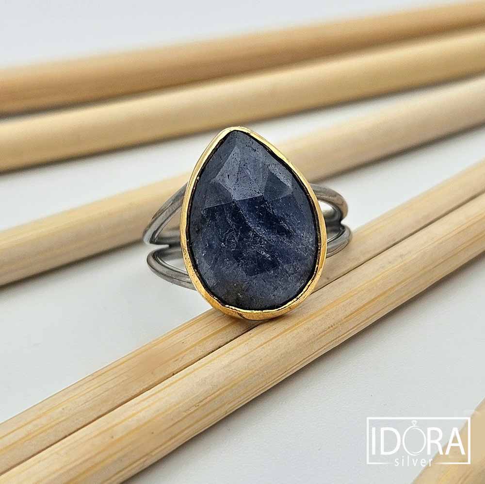 Естествен фасетиран син сапфир, разположен в центъра на изискана двуредова халка, излъчваща елегантността на капковидната форма. Деликатното обковаване в позлата придава топлина и изтънчен контраст на дълбоките нюанси на камъка, докато покритието от черен родий добавя модерен, драматичен акцент. Комбинацията от тези детайли превръща бижуто в съвършено съчетание на класическа елегантност и съвременен шик.