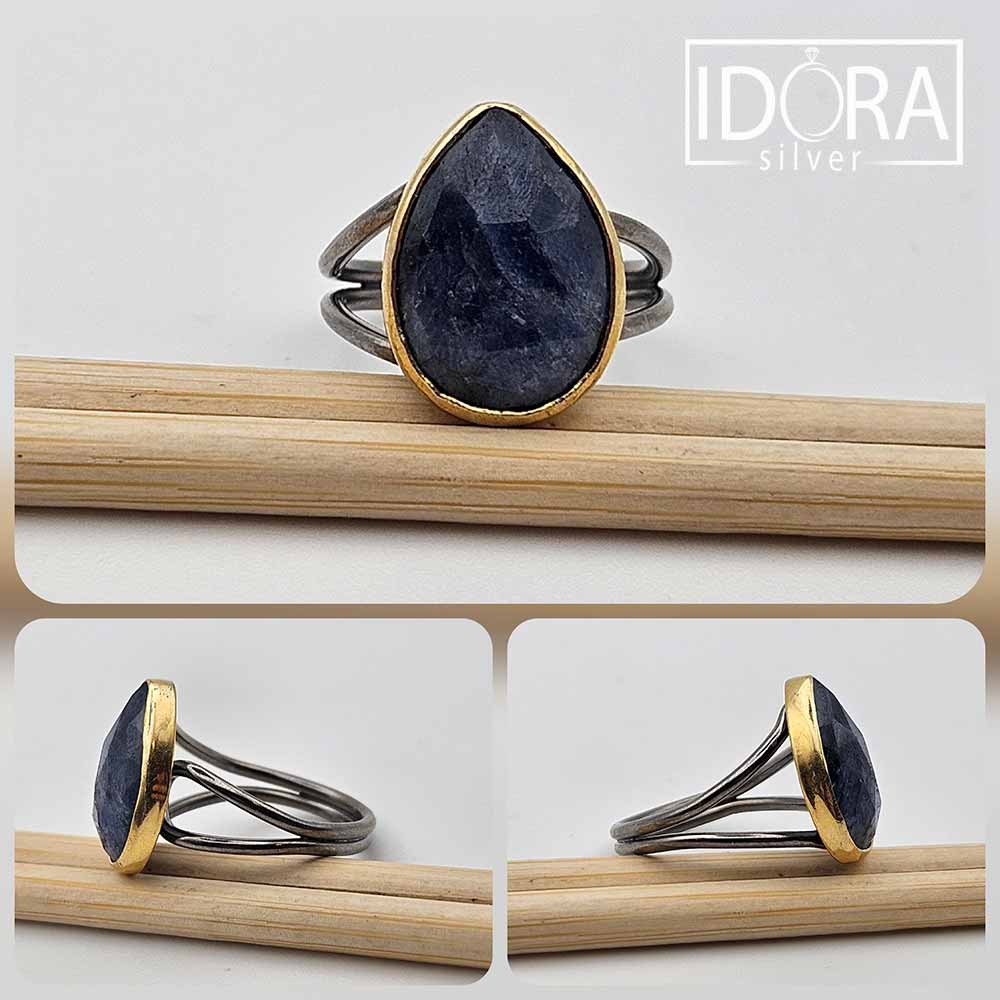 Естествен фасетиран син САПФИР в центъра на двуредова халка, демонстриращ елегантността на капката. Фино обковаване в позлата, придаващо доза топлина и изтънчен контраст на дълбоките, цветови нюанси на камъка. Покритие от черен родий.