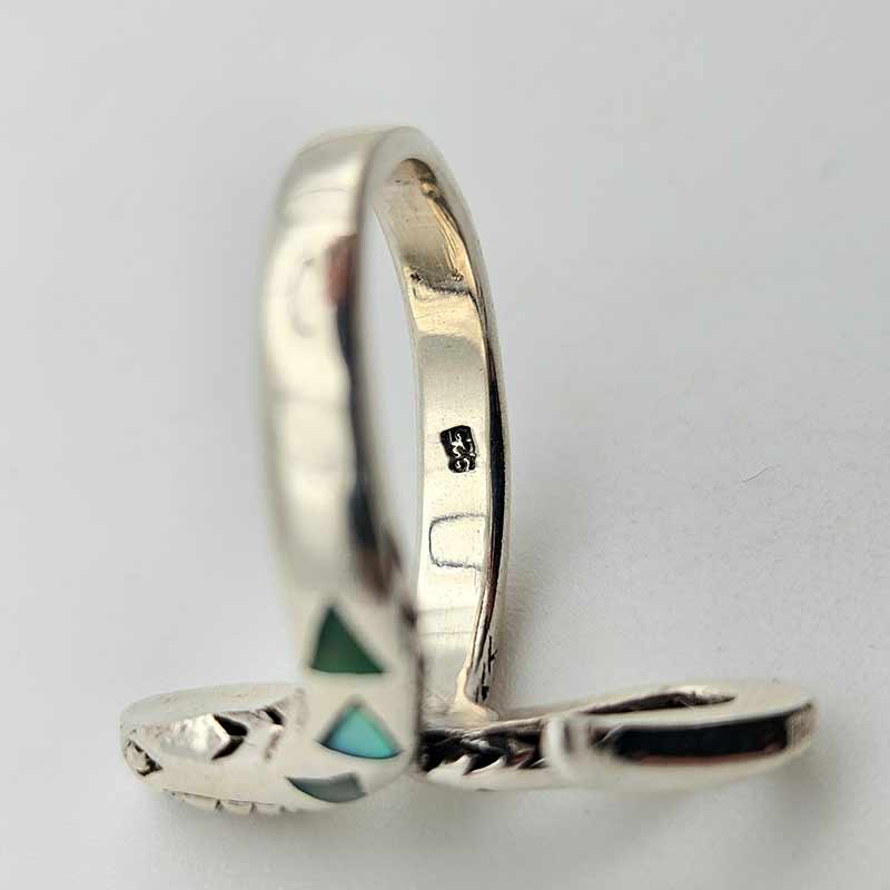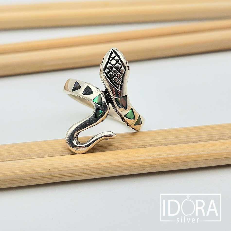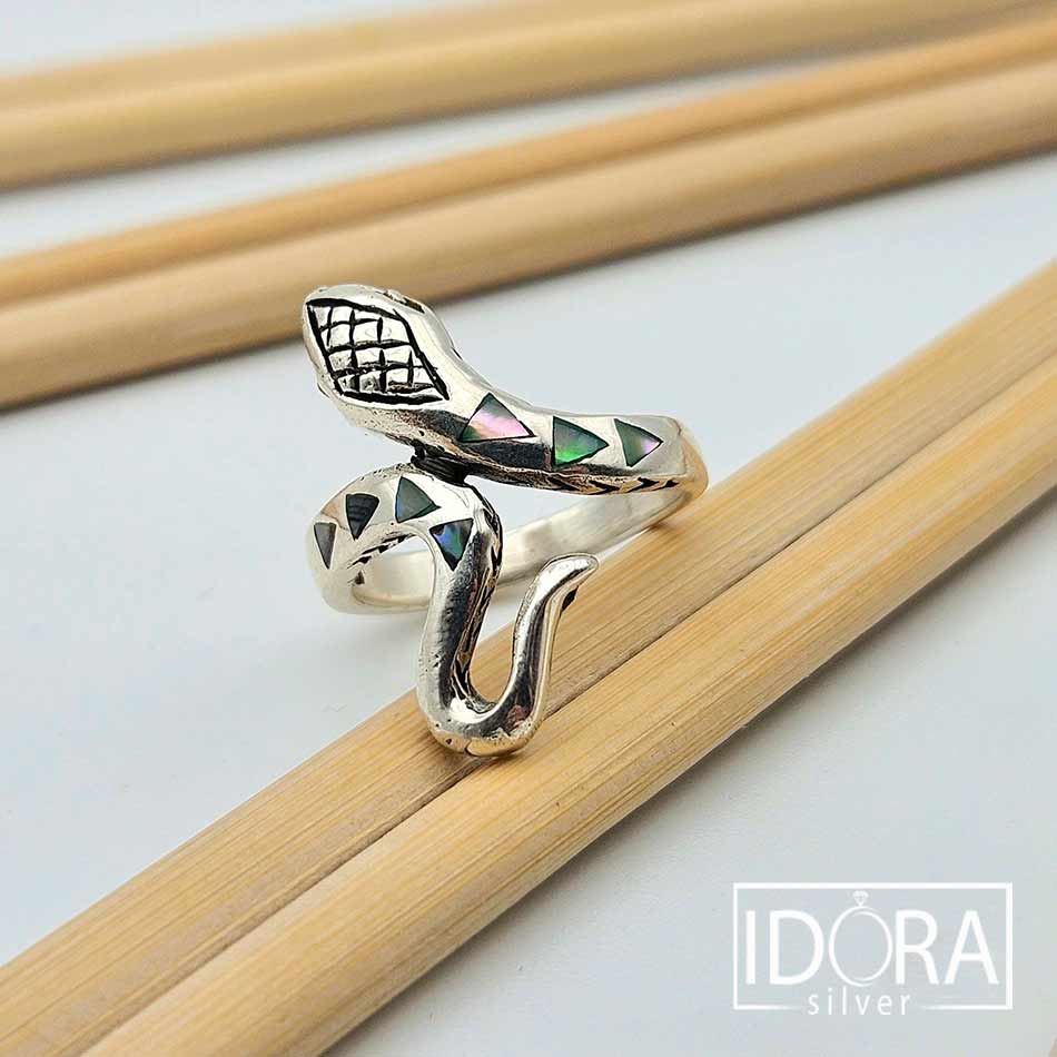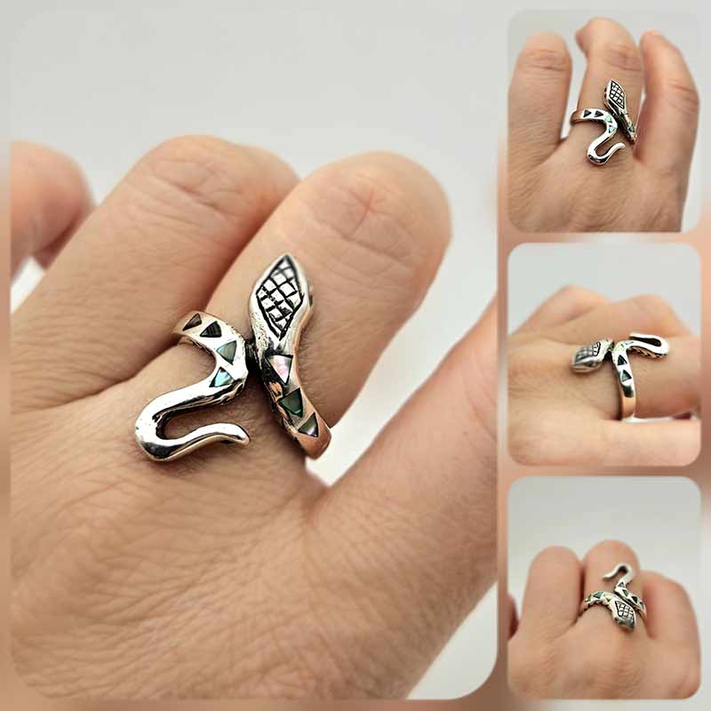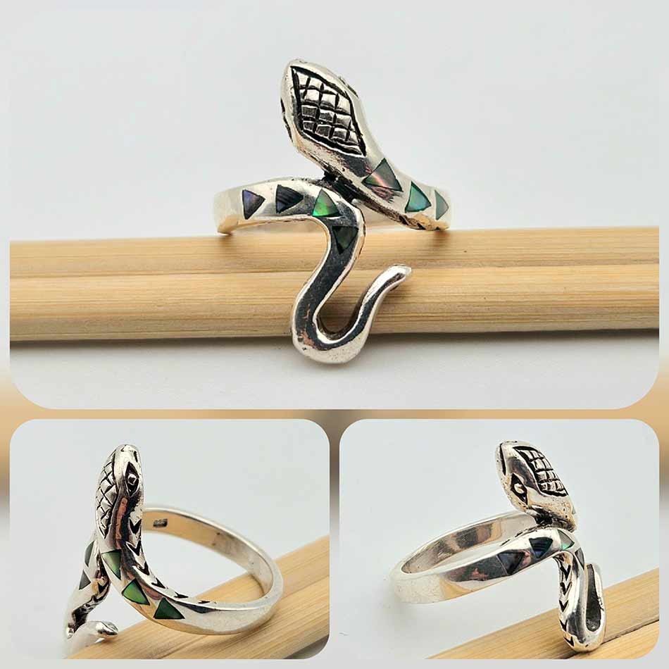 Инкрустирани късчета КРАЛСКИ СЕДЕФ в преливащи цвятове демонстрират вълшебна игра на светлината, следвайки грациозните извивки на стилизирана змия, обгръщаща пръста в застинала елегантност и загадъчност.