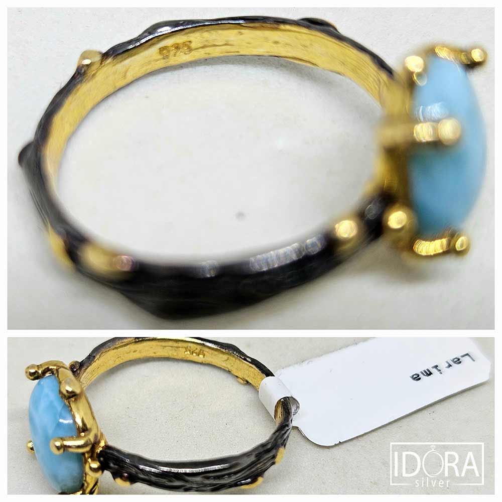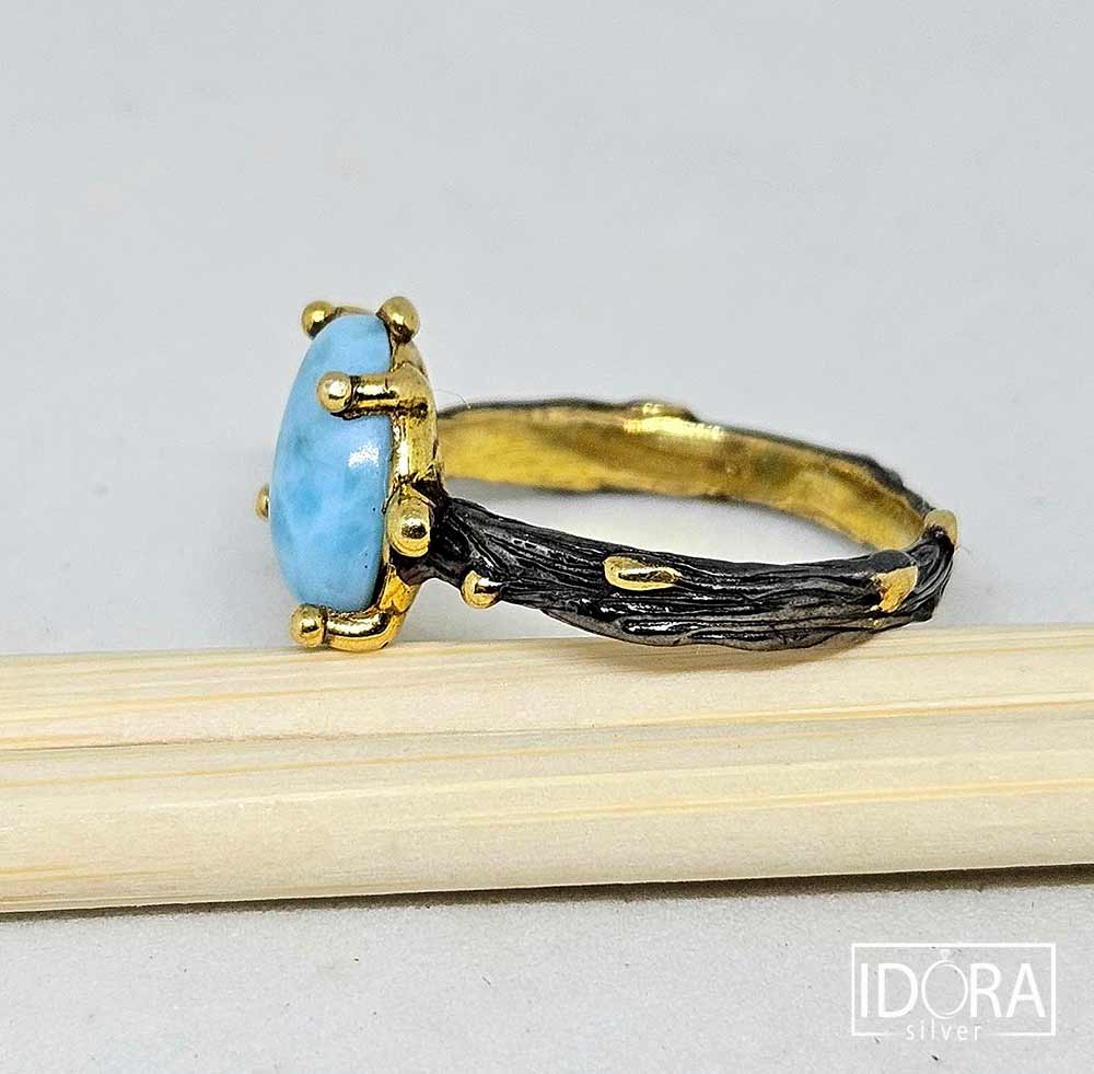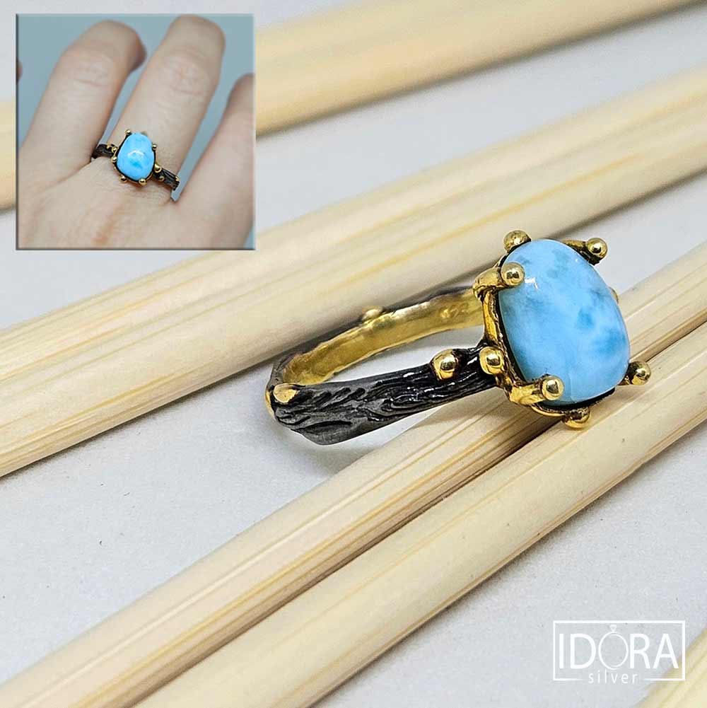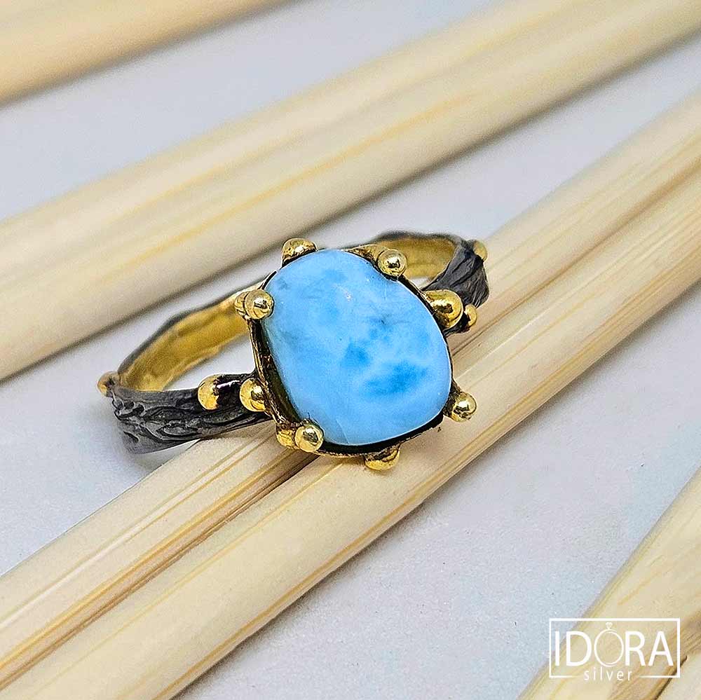 Сребърен пръстен с прелестен ЛАРИМАР, наситен син оттенък, който сякаш събира в себе си дълбочината на океана и неговото спокойно величие, примесено с мистична загадъчност. Обгърнат от черен родий, бижуто придобива изискан и съвременен характер, докато фините акценти от елементна позлата внасят топлина и лукс. Контрастът между хладната синева и златистите отблясъци подчертава изключителната красота на камъка и го превръща в истински център на внимание.