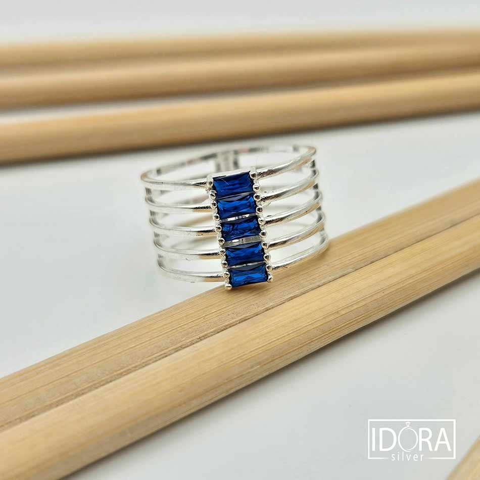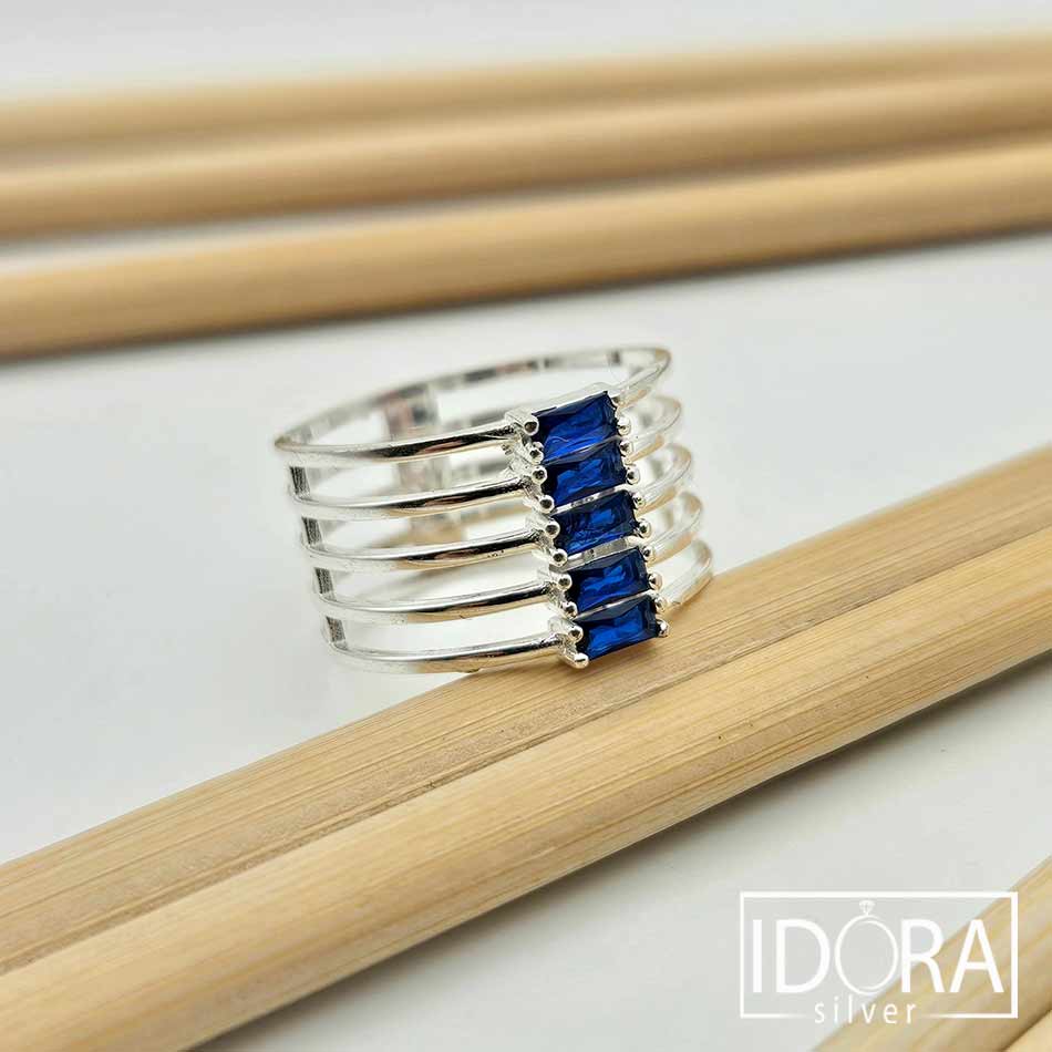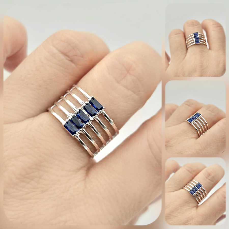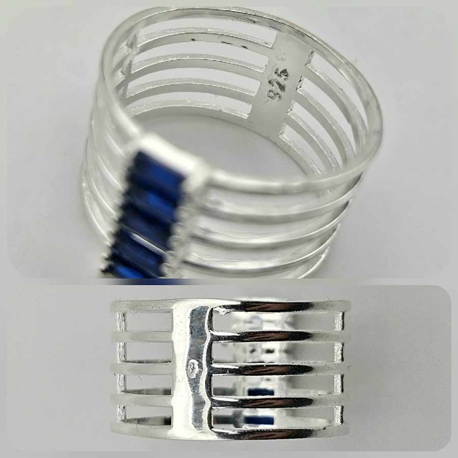 Миниатюрна архитектура от нежно изваяни паралелни обръчи, които се събират в центъра около пет дълбоки сини циркона, подредени ритмично в широка халка като малки прозорци към нощно небе.