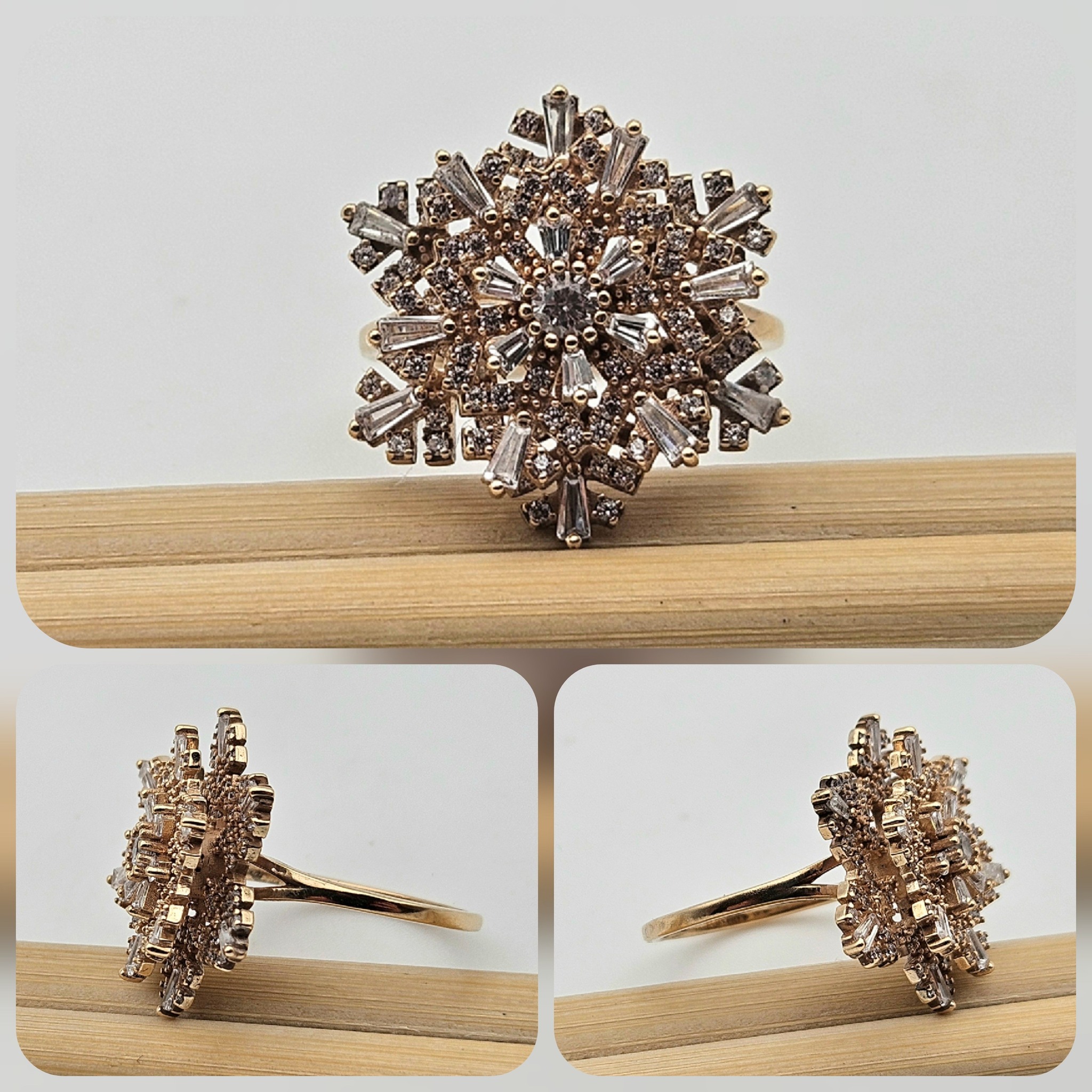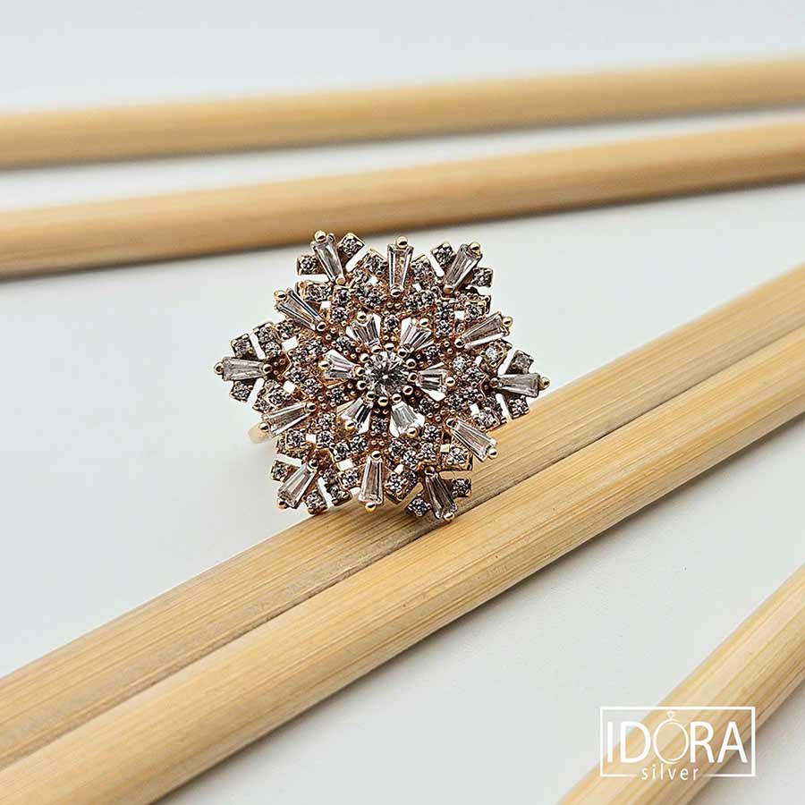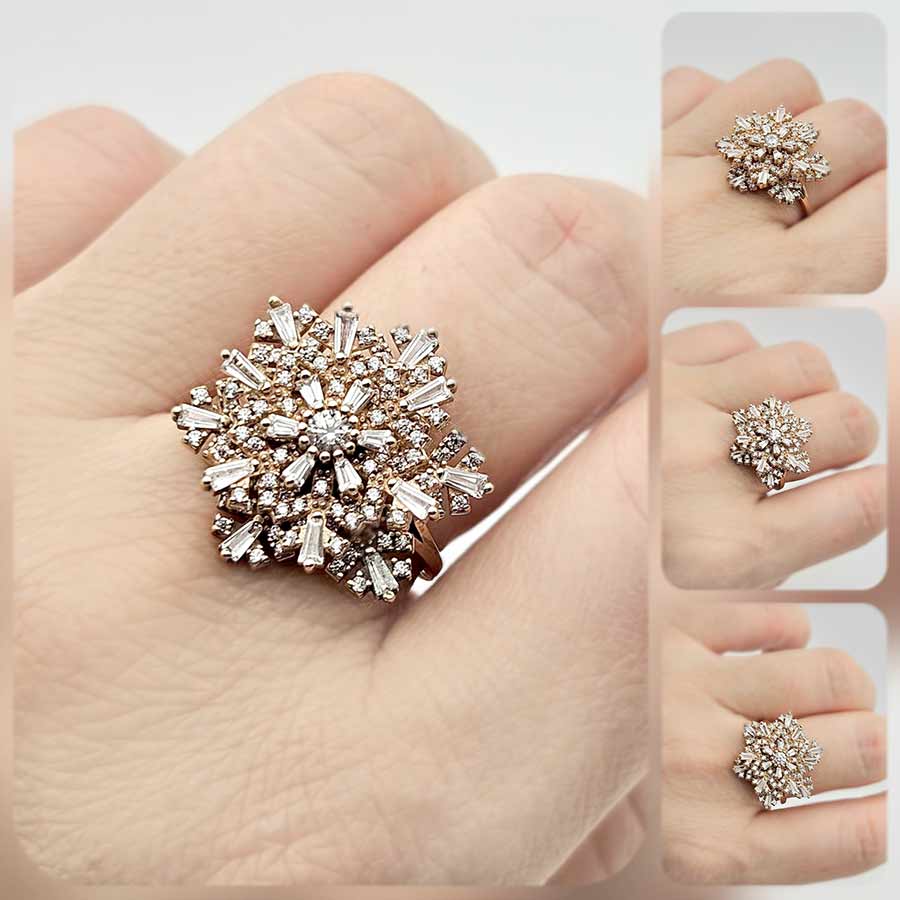 Детайлност на замръзнал скреж уловен в изтънчена, застинала и подвижна прецизност. Крехка и величествена, изградена от блестящи лъчи и фини геометрични циркони, танцуваща снежинка в мека позлата, подчертаваща динамиката в дизайна.