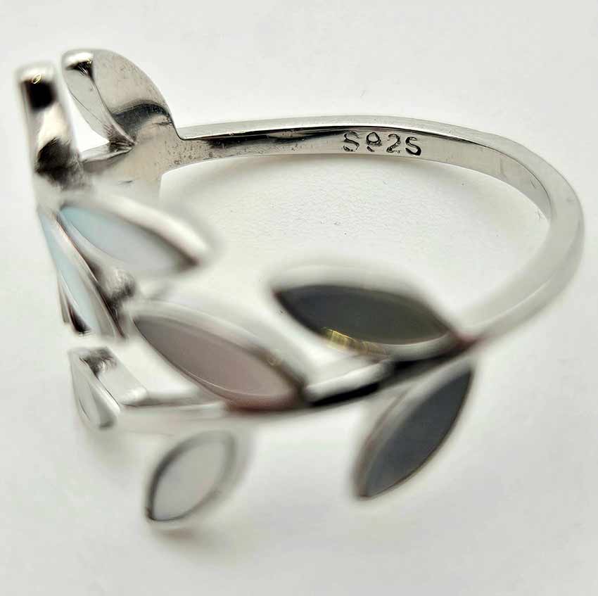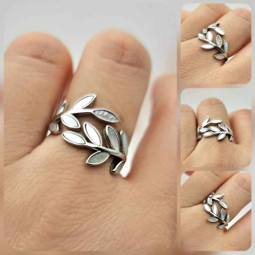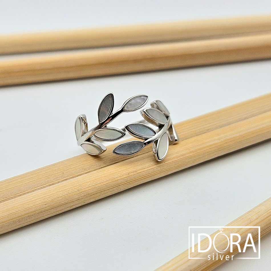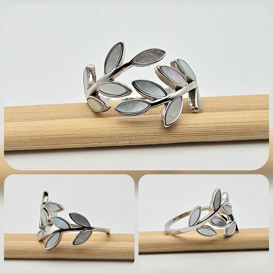 Нежна лаврова клонка, с листа изпълнени с БЯЛ СЕДЕФ в перлени нюанси в цветове, които преливат като светлина върху водна повърхност. Дизайнът е едновременно модерен и природно поетичен, носещ духа на изящната простота и красотата на деликатните семпли детайли.