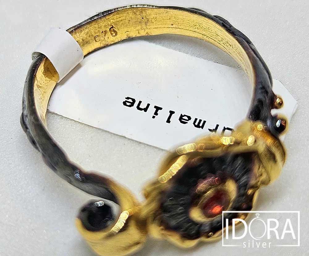 Впечатляващ с цвета си ТУРМАЛИН, в центъра на сцена оплетена в позлата. Плътна, релефна халка с атрактивна извивка в короната, внасяща силна доза елегантност, допълнена от контраста на черния родий и елементната позлата.