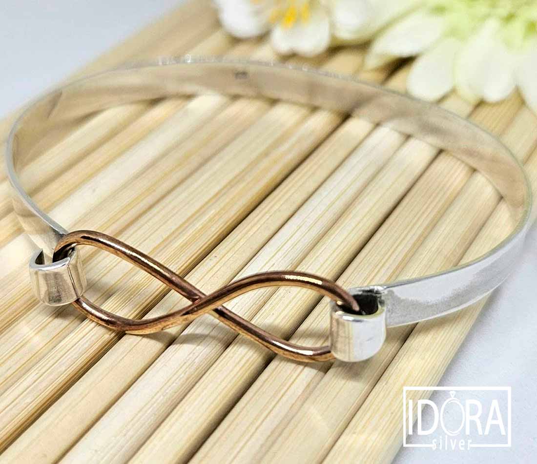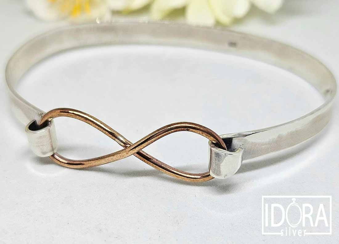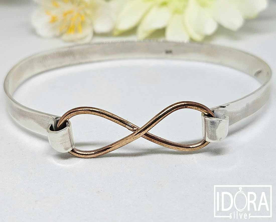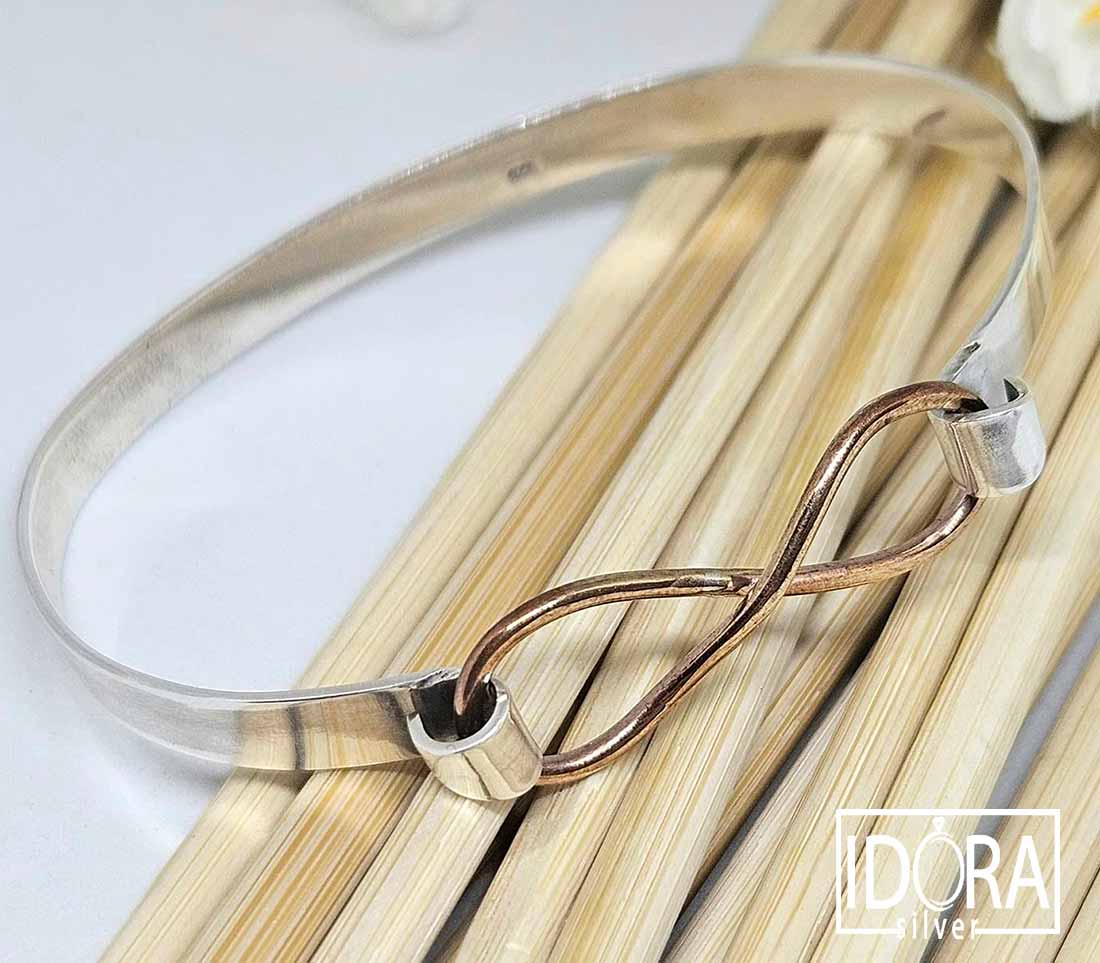 Масивна твърда гривна със символ за безкрайност в цветен закопчаващ елемент.