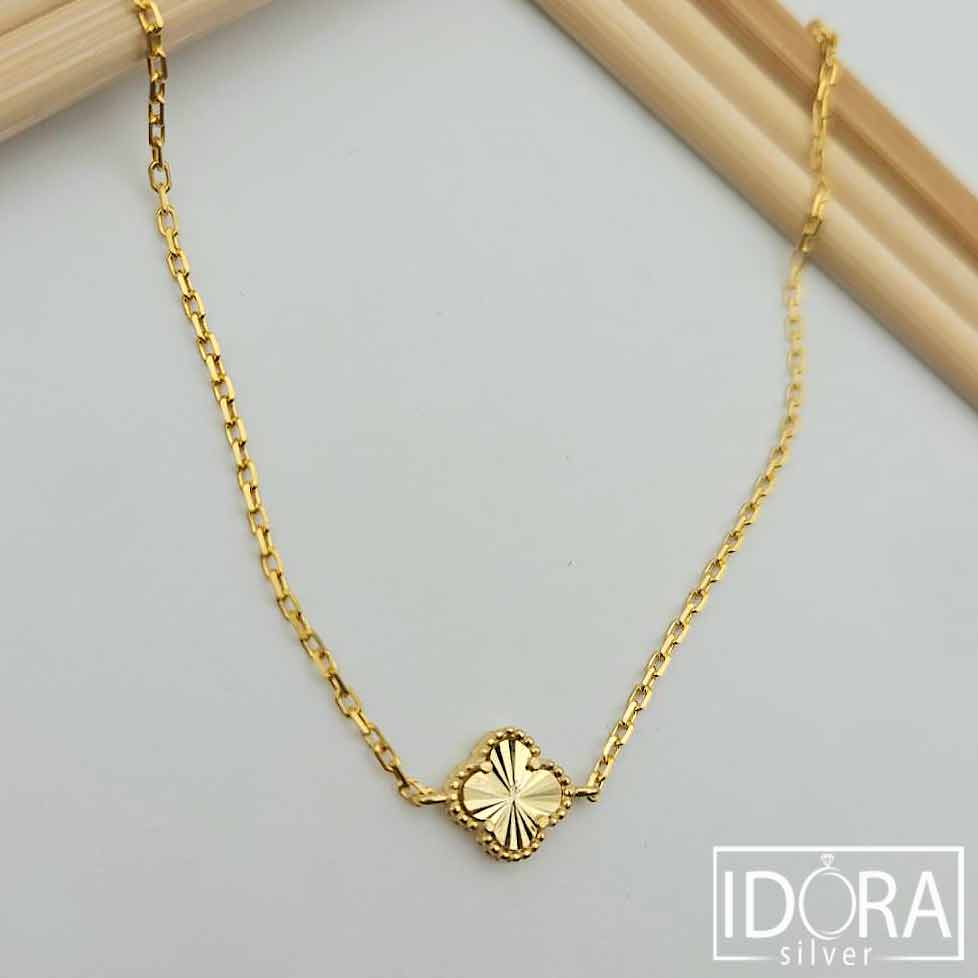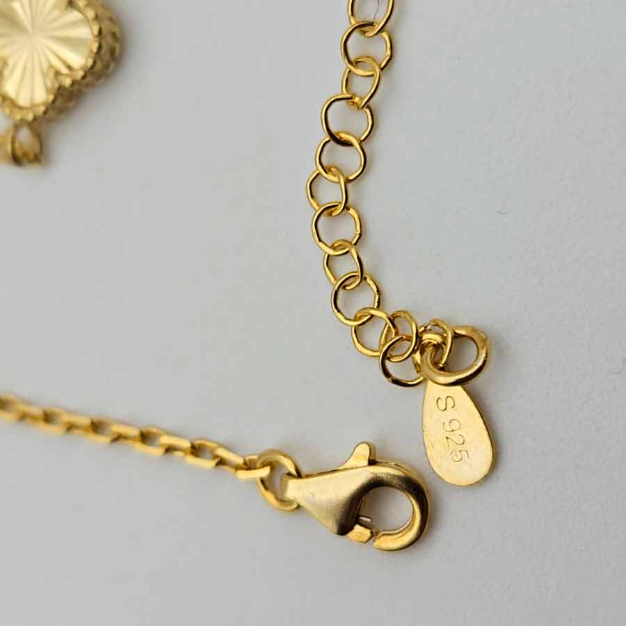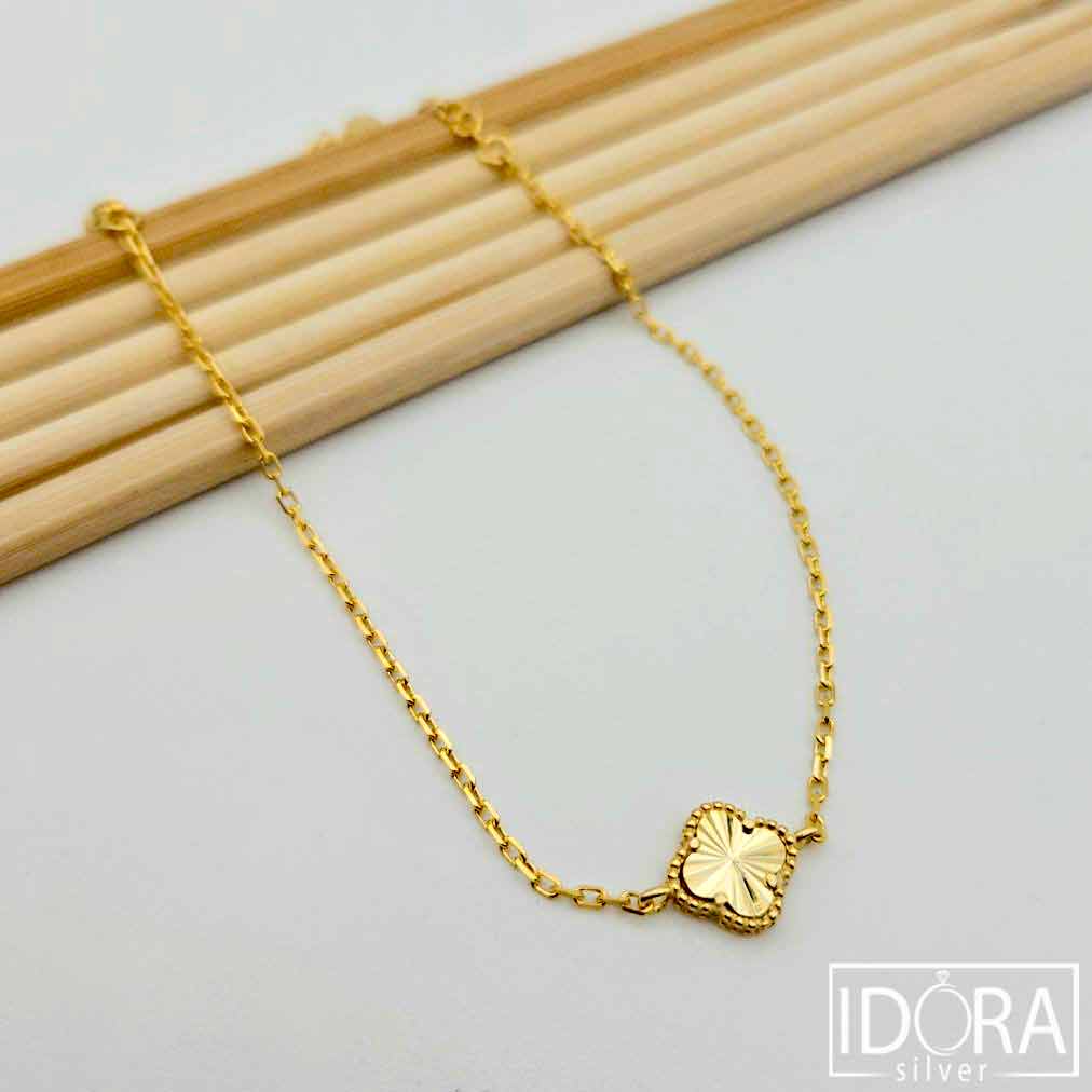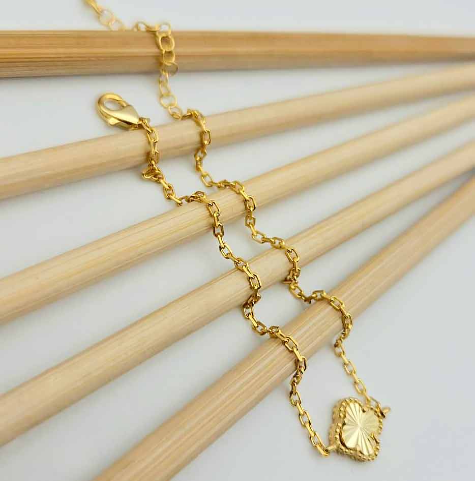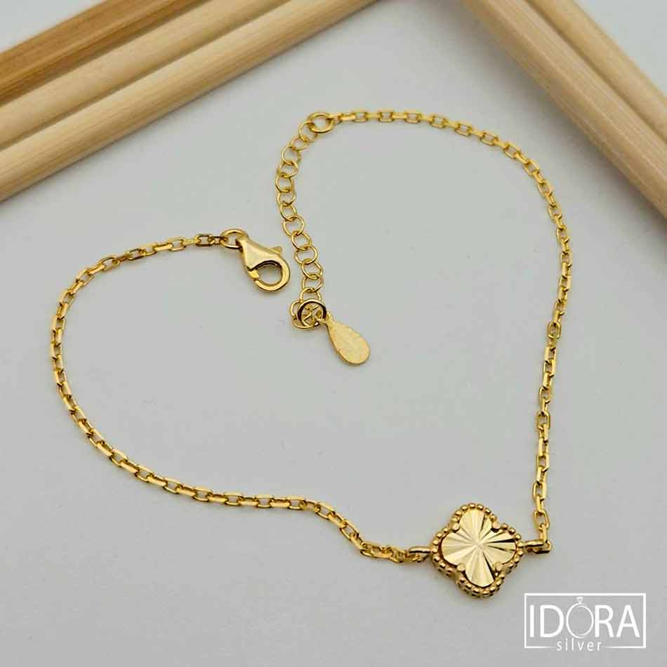 Тънка верижка, предназначена да обгръща китката с нежност, изящество и елегантност, с централен елемент релефна четирилистна детелина, излъчваща блясък, носеща късмет и свежа нотка женственост. Мекото сияние на позлатата допълва финия минимализъм с неподправен чар.