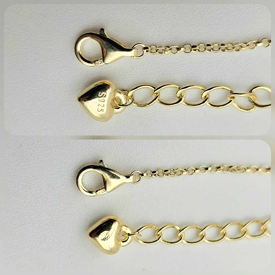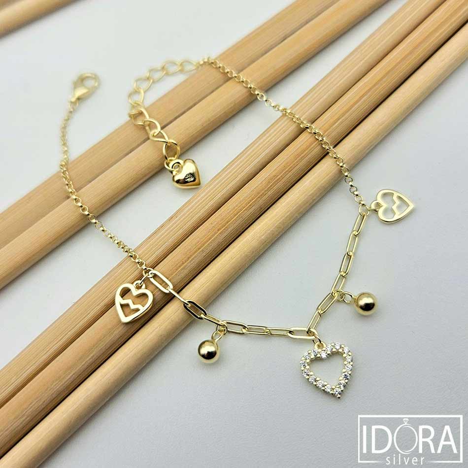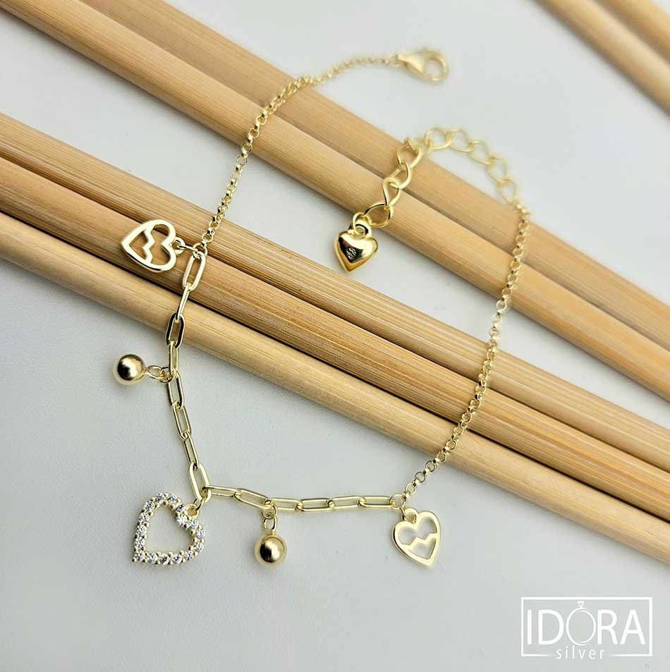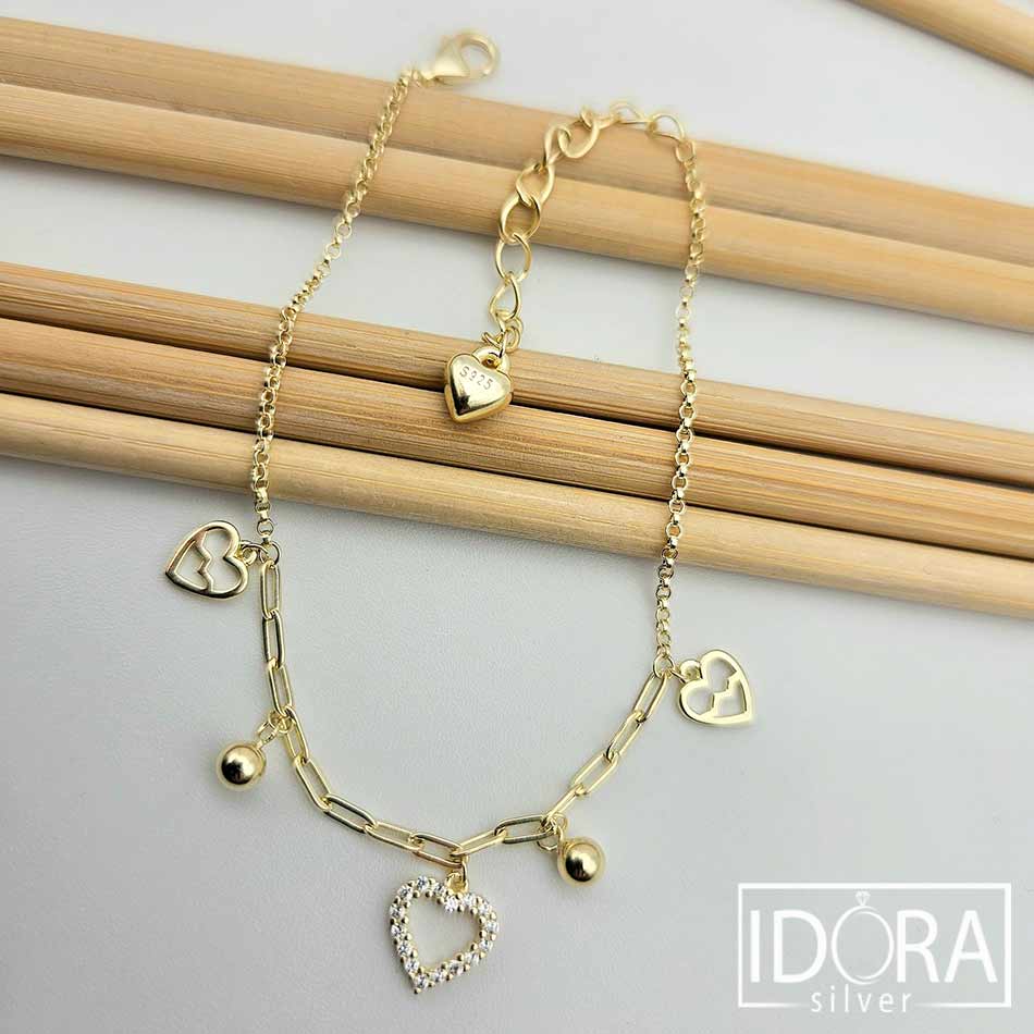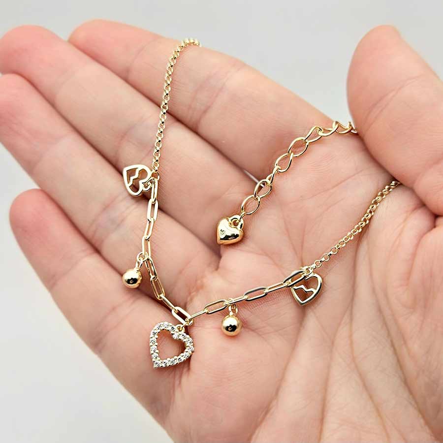 Фина верижка в различни оплетки се извива леко, улавя светлината и я превръща в мек блясък. Висулки от малки сърца – едни плътни, други ефирно очертани, трети обсипани с искрящи камъчета – разказват за различните нюанси на любовта: нежна, игрива, сияйна. Две сфери добавят ритъм и баланс в общото усещане за елегантна лекота, интимност и близост.