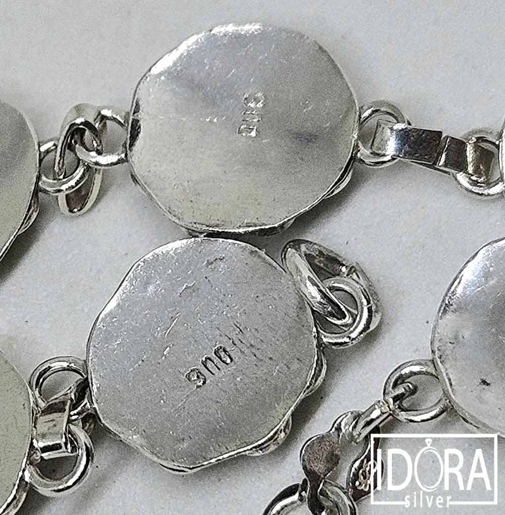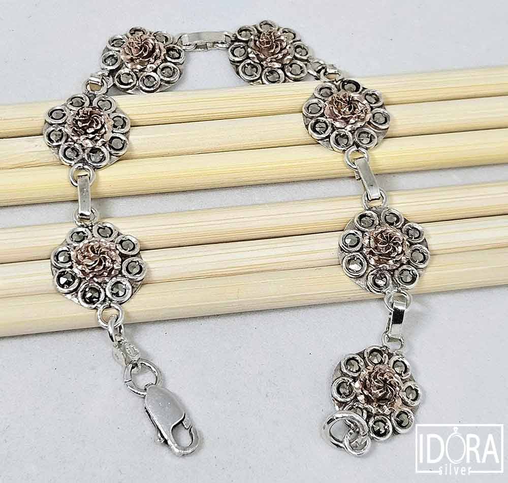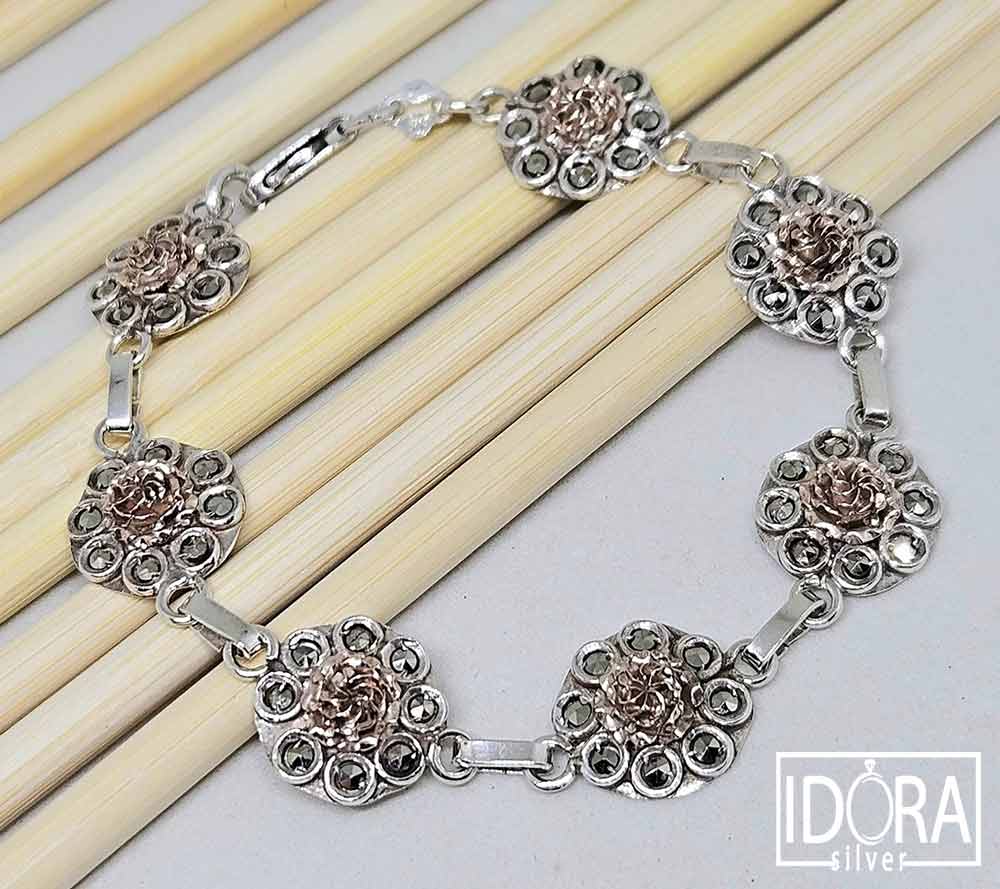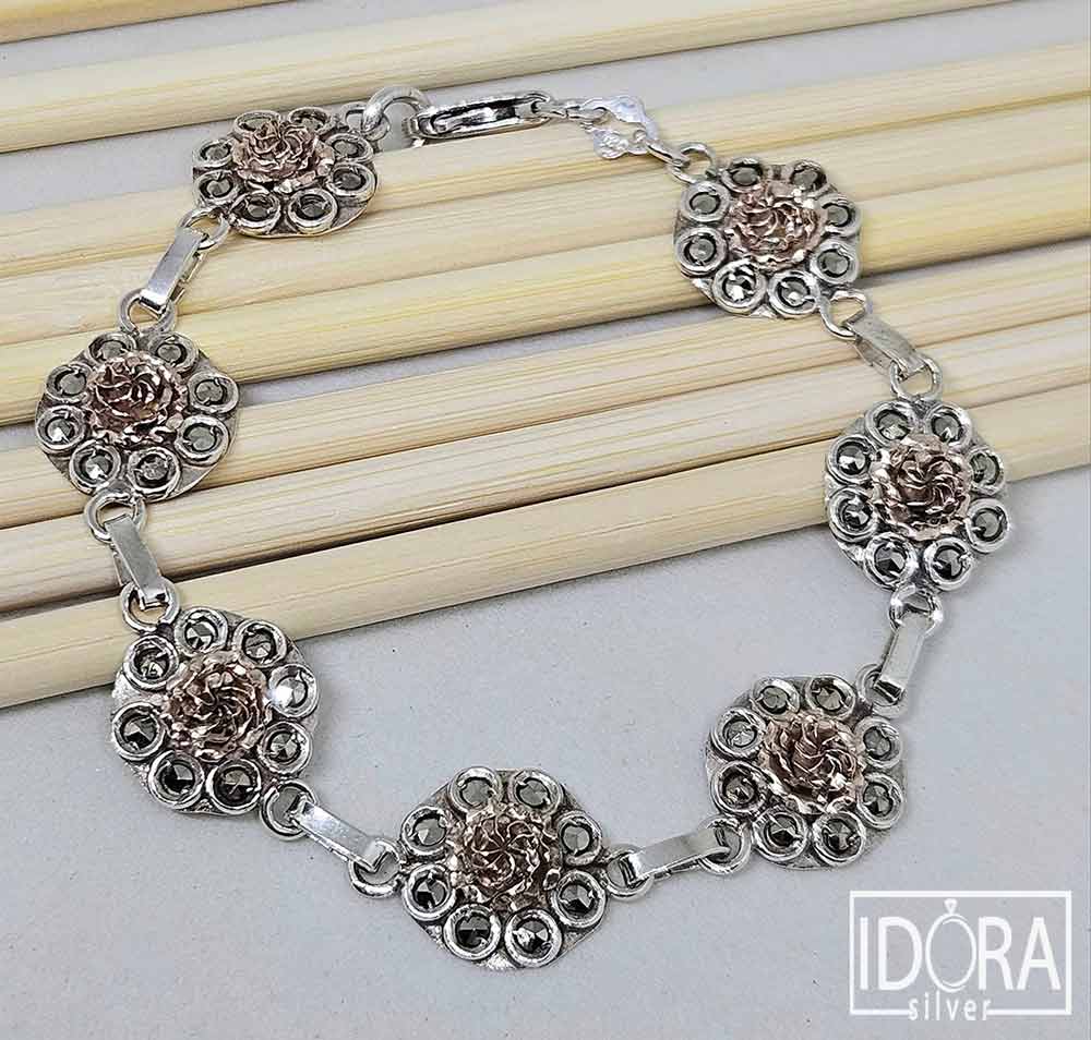 Сребърна гривна от седем прецизно оформени елемента, всеки обсипан с блестящи марказити, които придават изискан ретро чар. В центъра се разгръща обемно позлатено цвете – сияен акцент, който съчетава романтика и величие.
