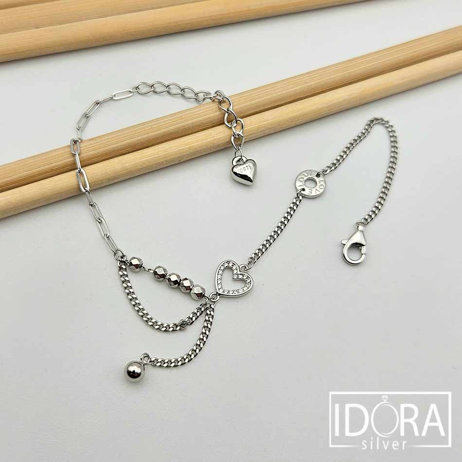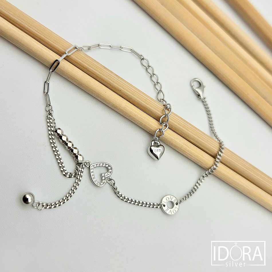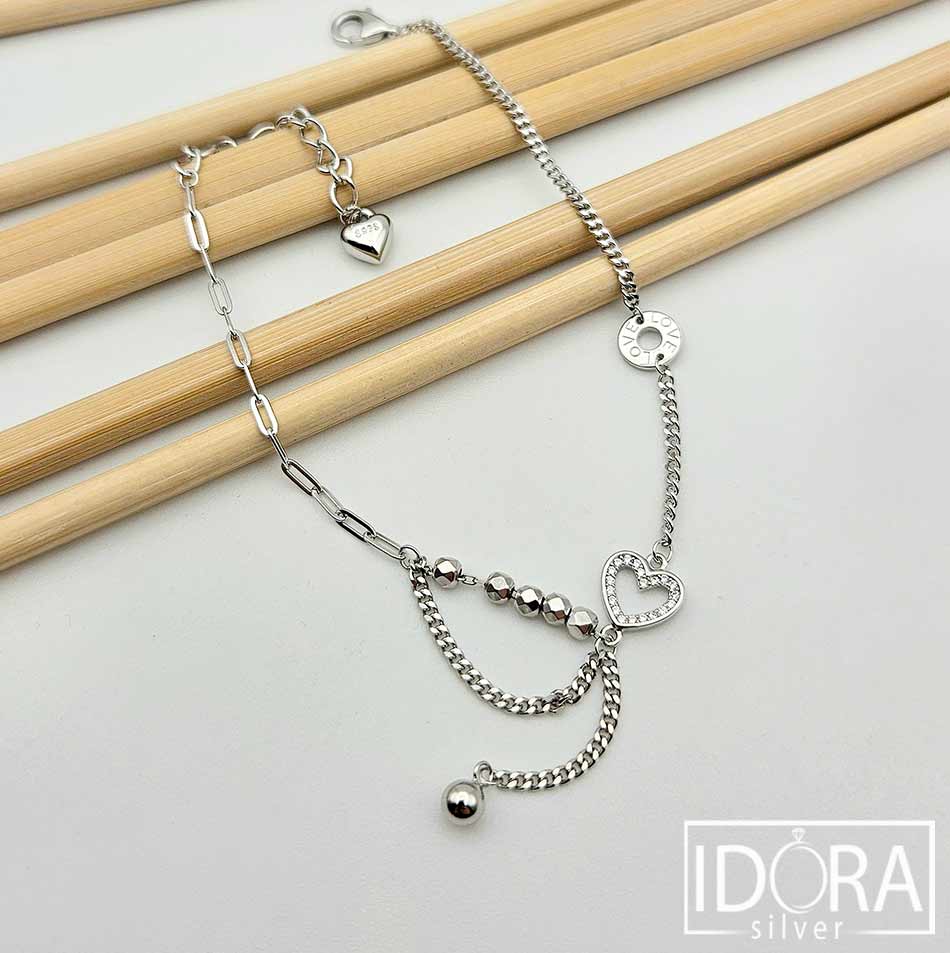 Перфектната комбинация от верижки в нежност и блясък, деликатност и стил, съчетани с фини детайли, привличащи вниманието – формата на сърце, обсипано с камъчета, малък акцент с надпис “LOVE”, подвижни релефни топченца, всички мини елементи добавят нотка на романтично докосване, усещане за връзка и обич.