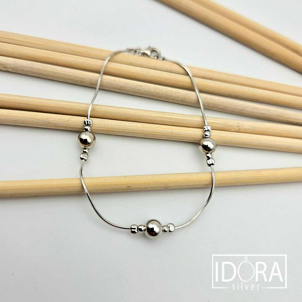 Изискана гривна, деликатно изработена от фино сребро с гладки, елегантни линии с родирана повърхност. Основният акцент са малки сребърни сфери, равномерно разпределени по дължината на верижката, добавяйки усещане за баланс и хармония. Гривната излъчва елегантност, лекота и съвременен минимализъм.