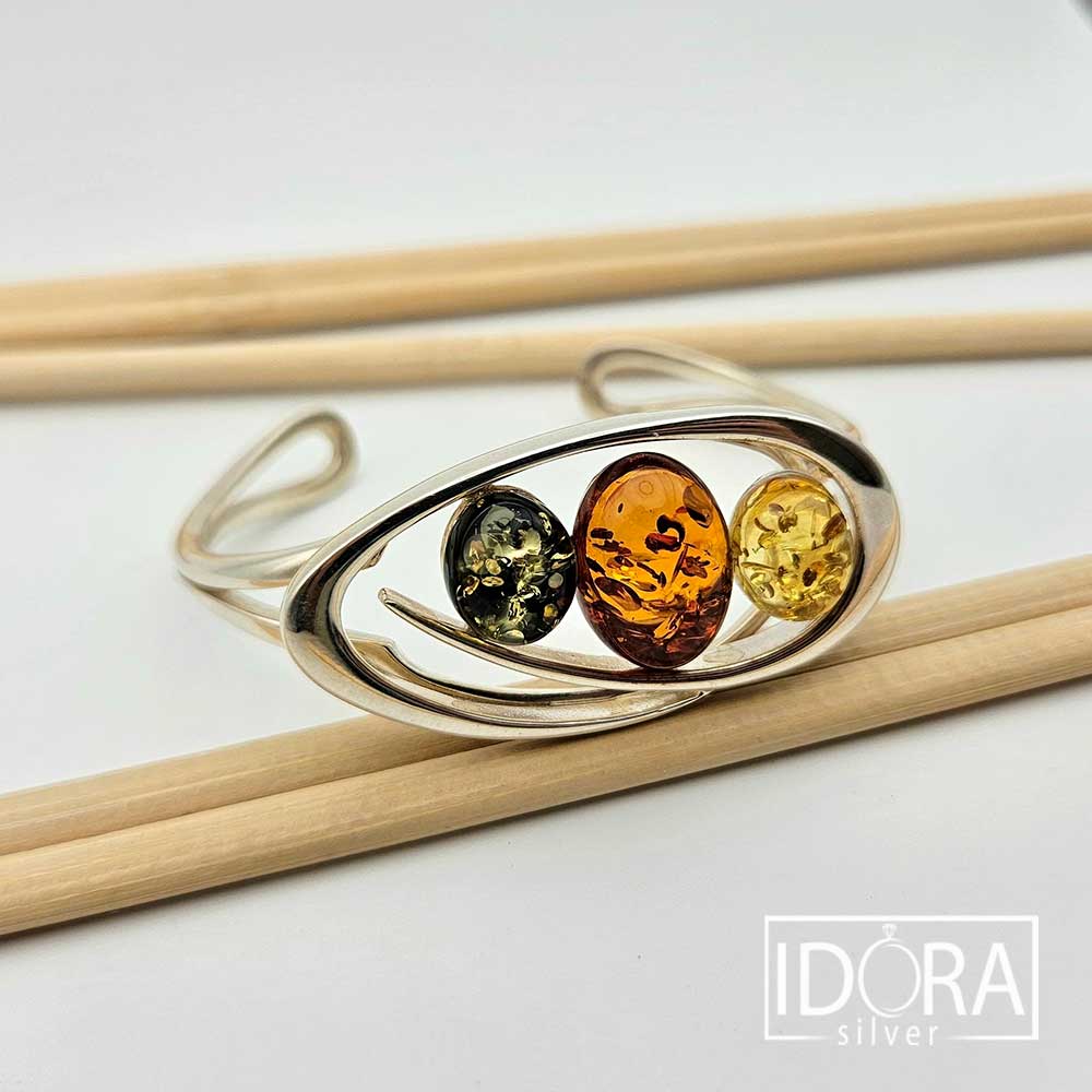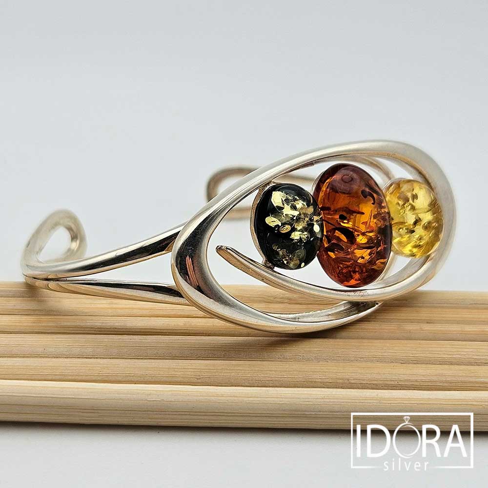Изящна гривна от сребро и КЕХЛИБАР с усещане за хармония между природа и изкуство. Меките линии на среброто обгръщат три сияйни камъка – слънчево жълто, топло медено и дълбоко зелено, уловили лъчите на изгрева, жарта на пладнето и мистиката на здрача. Три цвята, три момента от деня, три отражения на светлината, събрани в една символика – хармония между минало, настояще и бъдеще.