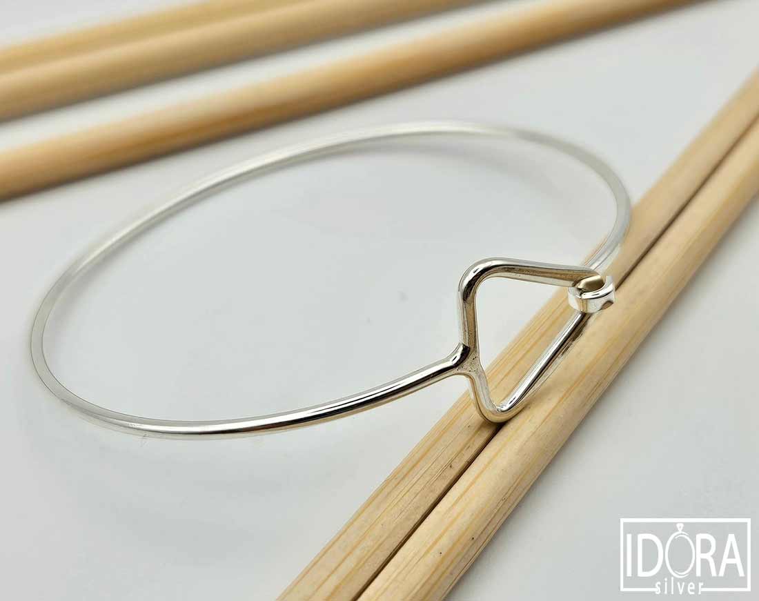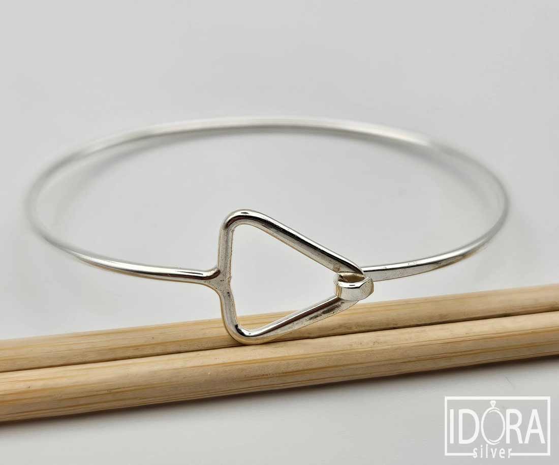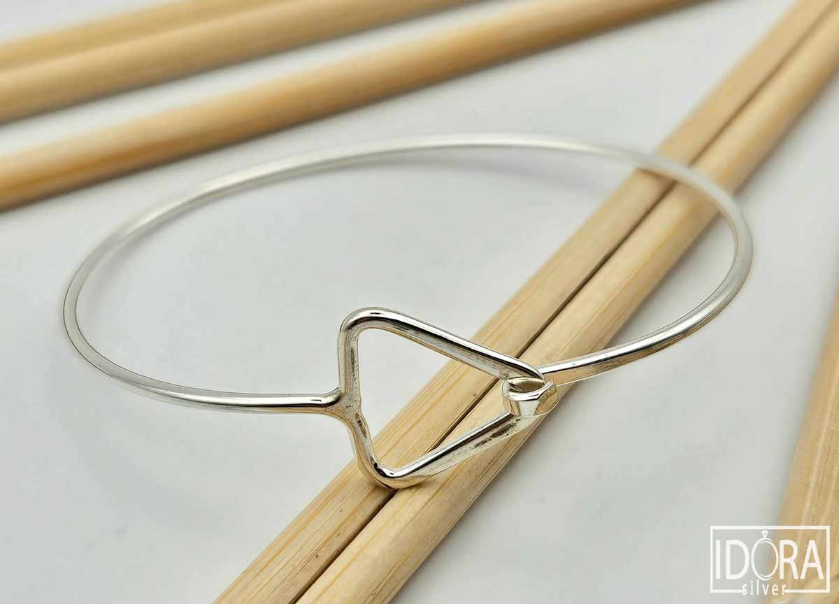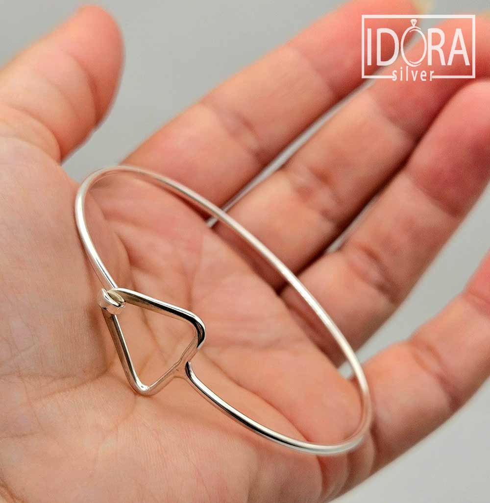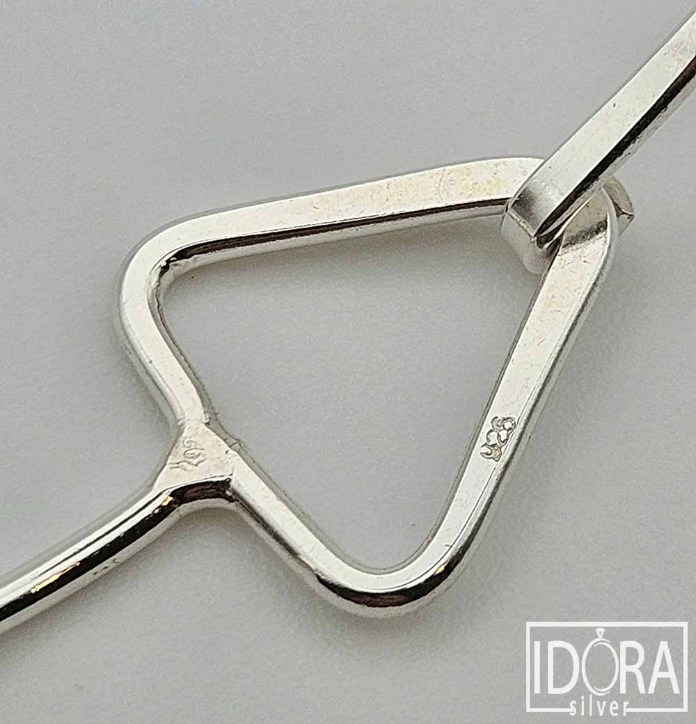 Сребърна гривна – олицетворение на съвременната елегантност и изтънченост. Дизайнът ѝ е семпъл и минималистичен, но носи деликатна грация и изразителност. Основната форма е подчертана от стилизирана триъгълна закопчаваща рамка с меки, заоблени ъгли, която внася усещане за хармония и завършеност. В този фин баланс между строгата геометрия и плавната органичност се ражда бижу, което излъчва модерност, лекота и неподвластна на времето естетика.