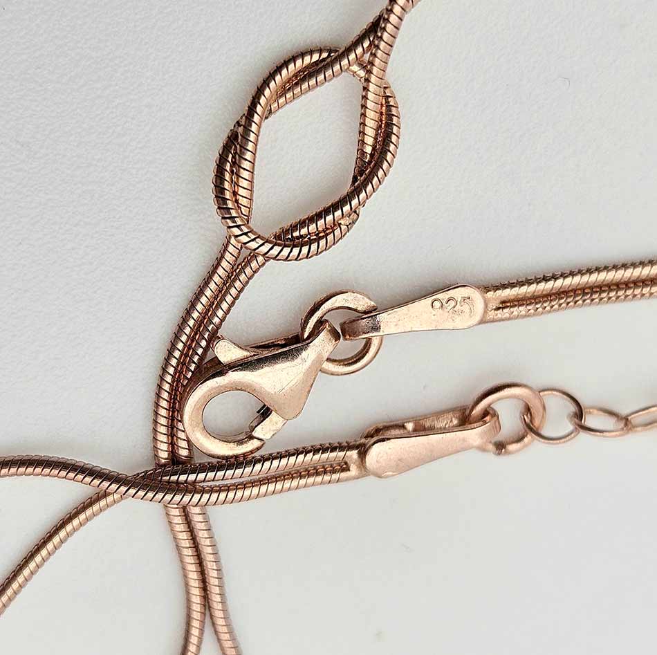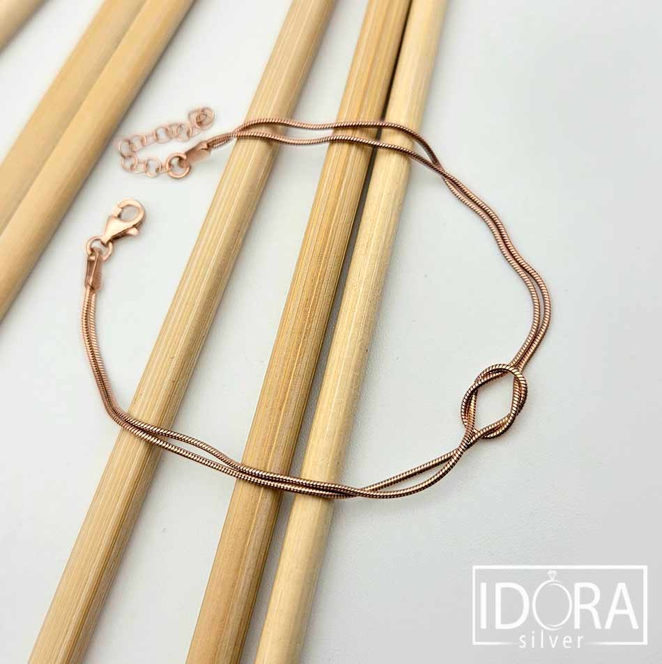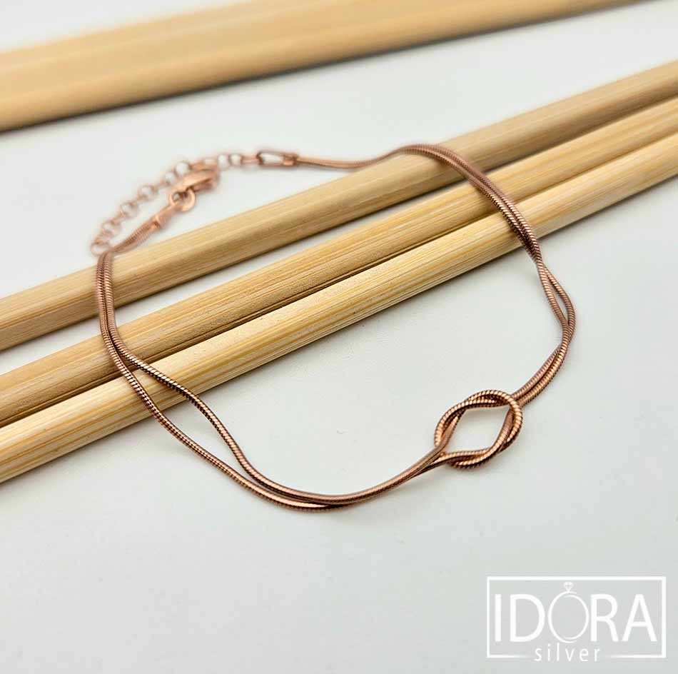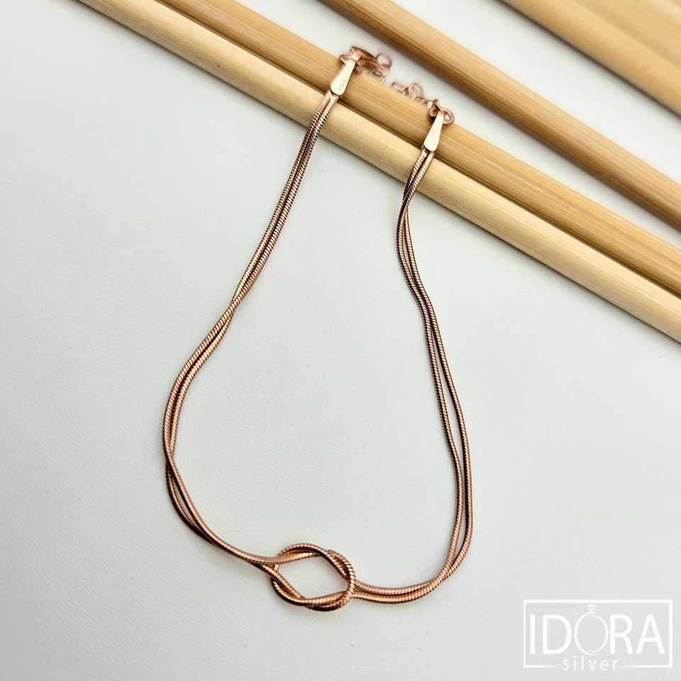 Фини верижки в розова позлата се извиват деликатно и се оплитат в малък възел в лек акцент – символ на връзка, обещание и непрекъснатост, завързан без усилие, но с дълбок смисъл, съчетал модерната минималистична естетика на красотата в простите, добре обмислени форми.
